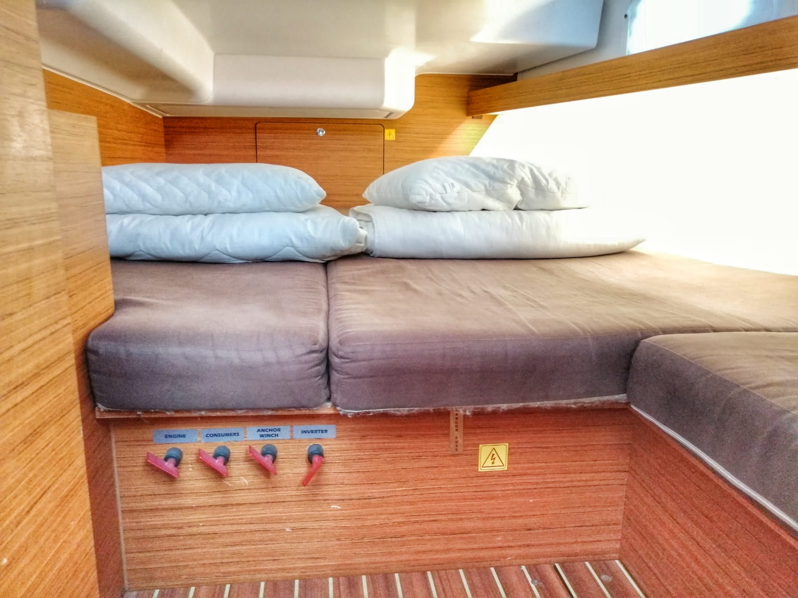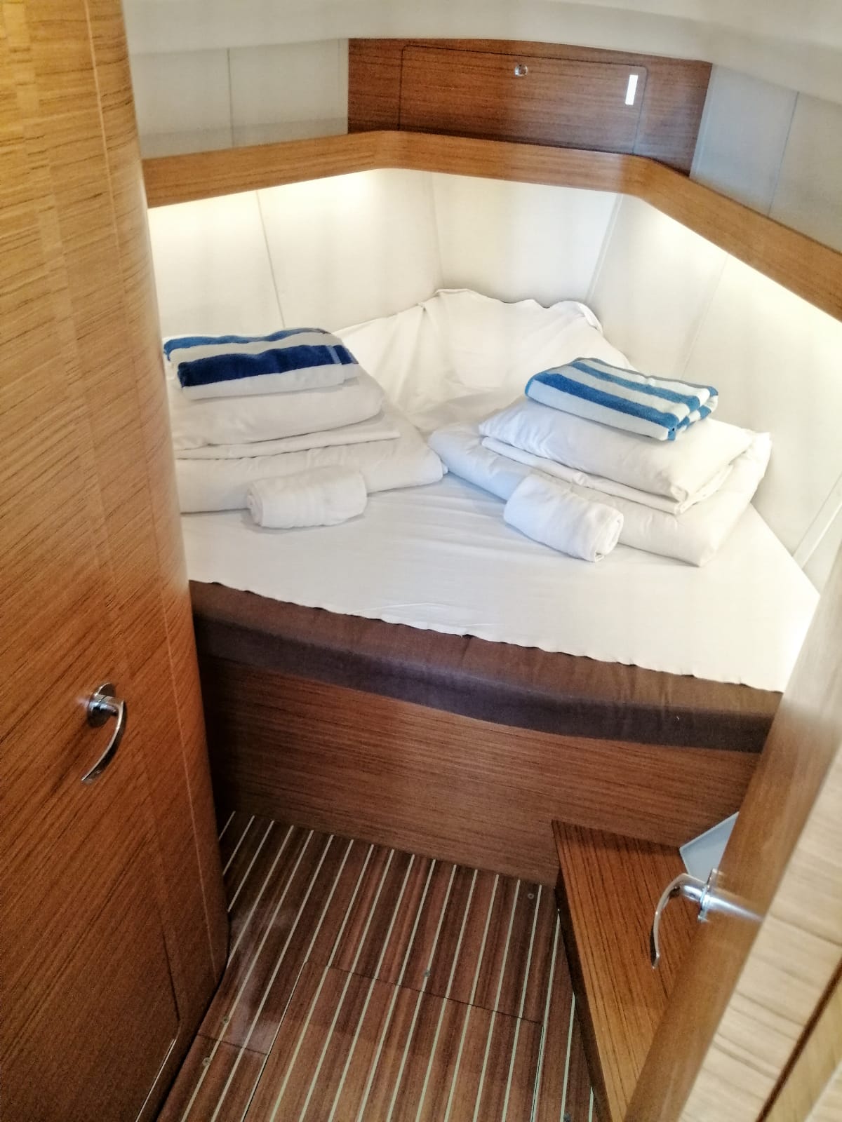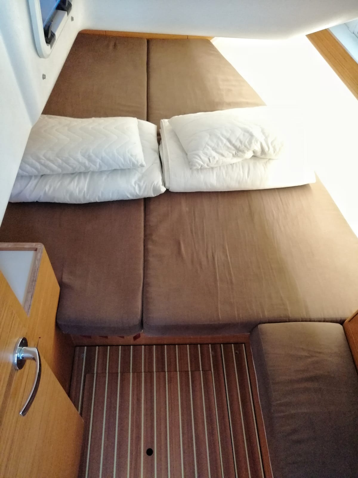 | Safety | Autopilot, Bordapotheke, Bordwerkzeug, Bugstrahlruder, elektr. Bilgepumpe, Feststoffschwimmwesten, Feueraxt, Feuerlöscher, Lifebelts, Nebelhorn, Notsignale, Radarreflektor, Taschenlampe, UKW-Funk mit AIS |