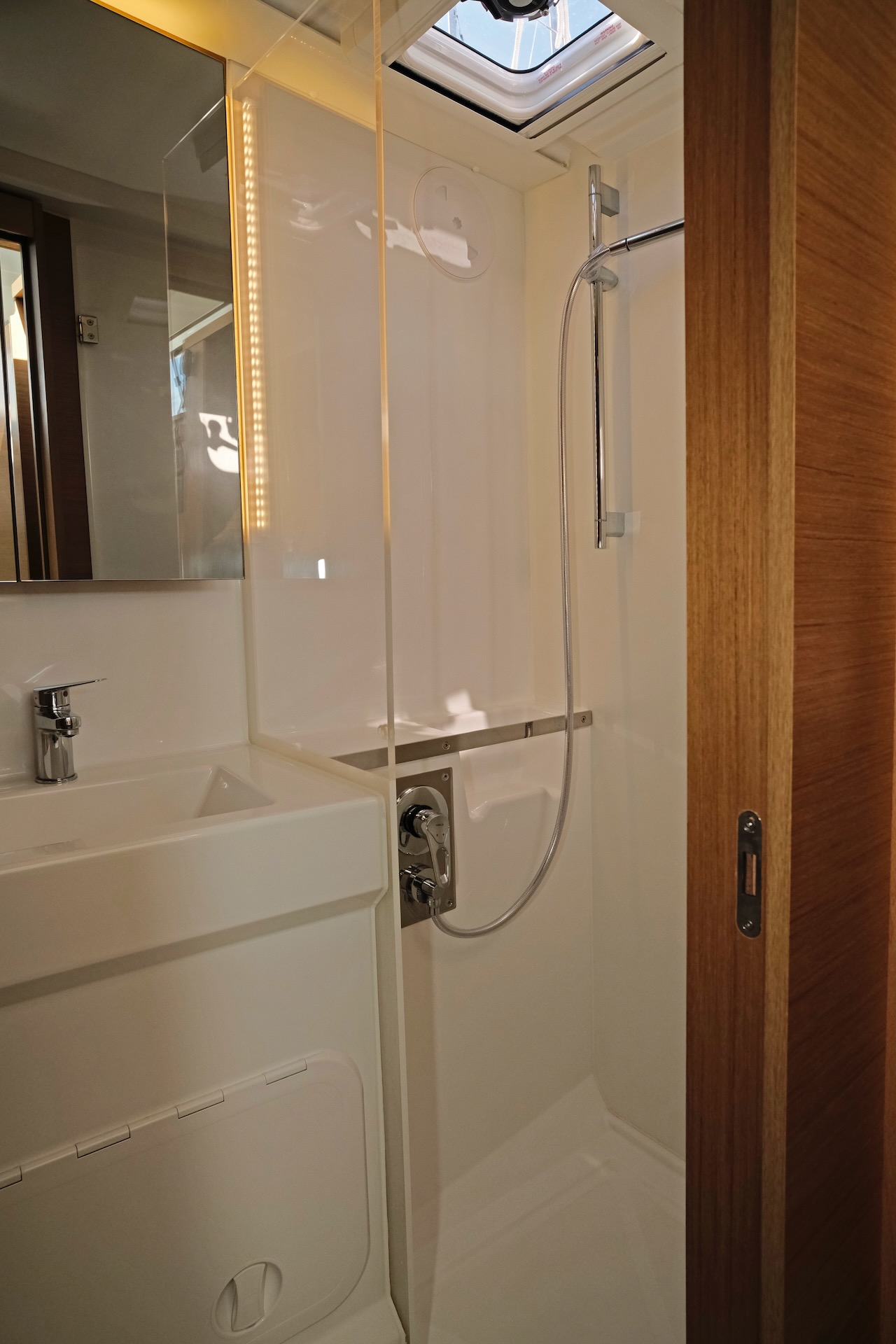 | Outside | 12 V-Anschluss, 220 V-Landanschluss, Anker mit Kette, Badeplattform, Cockpitdusche, Cockpitpolster, Cockpittisch, Windex |