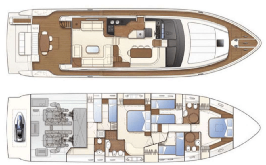 | Outside | Badeplattform, Biminitop, Cockpitlautsprecher, Cockpitpolster, Flybridge, hydraul. Gangway, Schnorchelausrüstung, Teakdeck |
