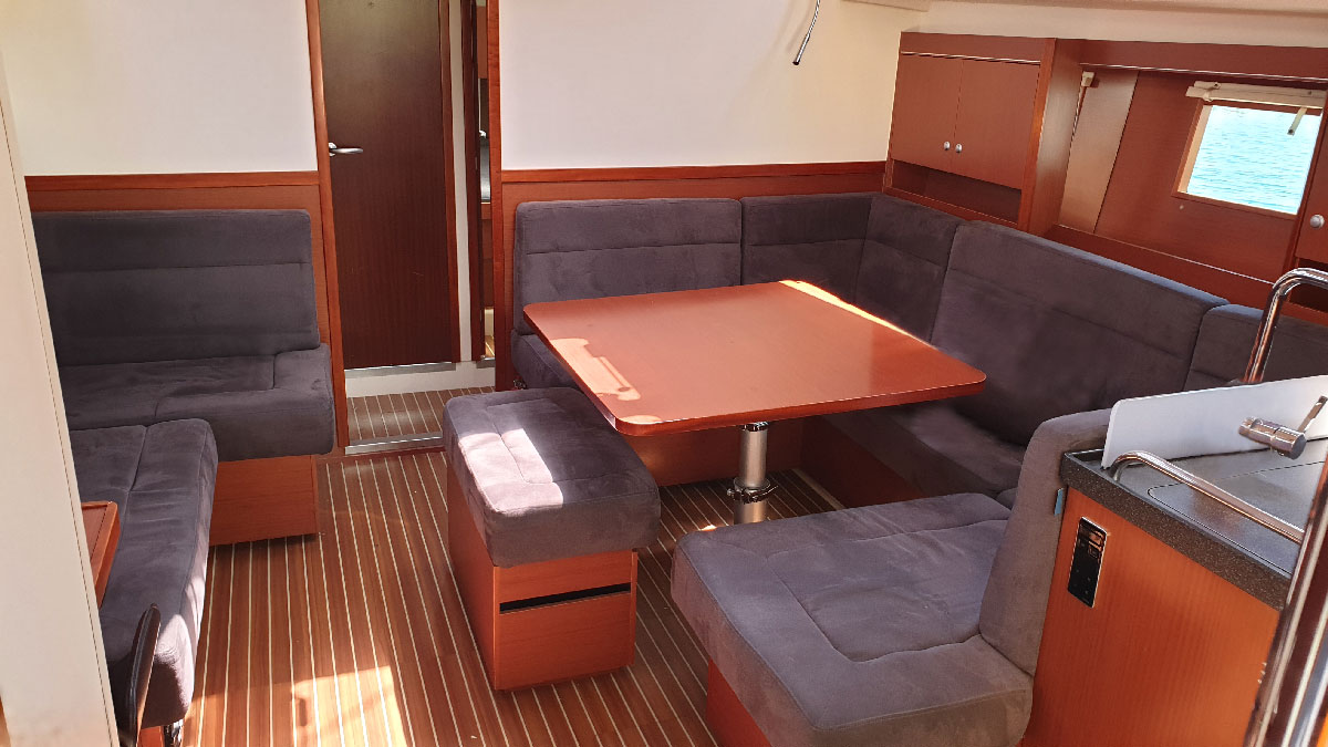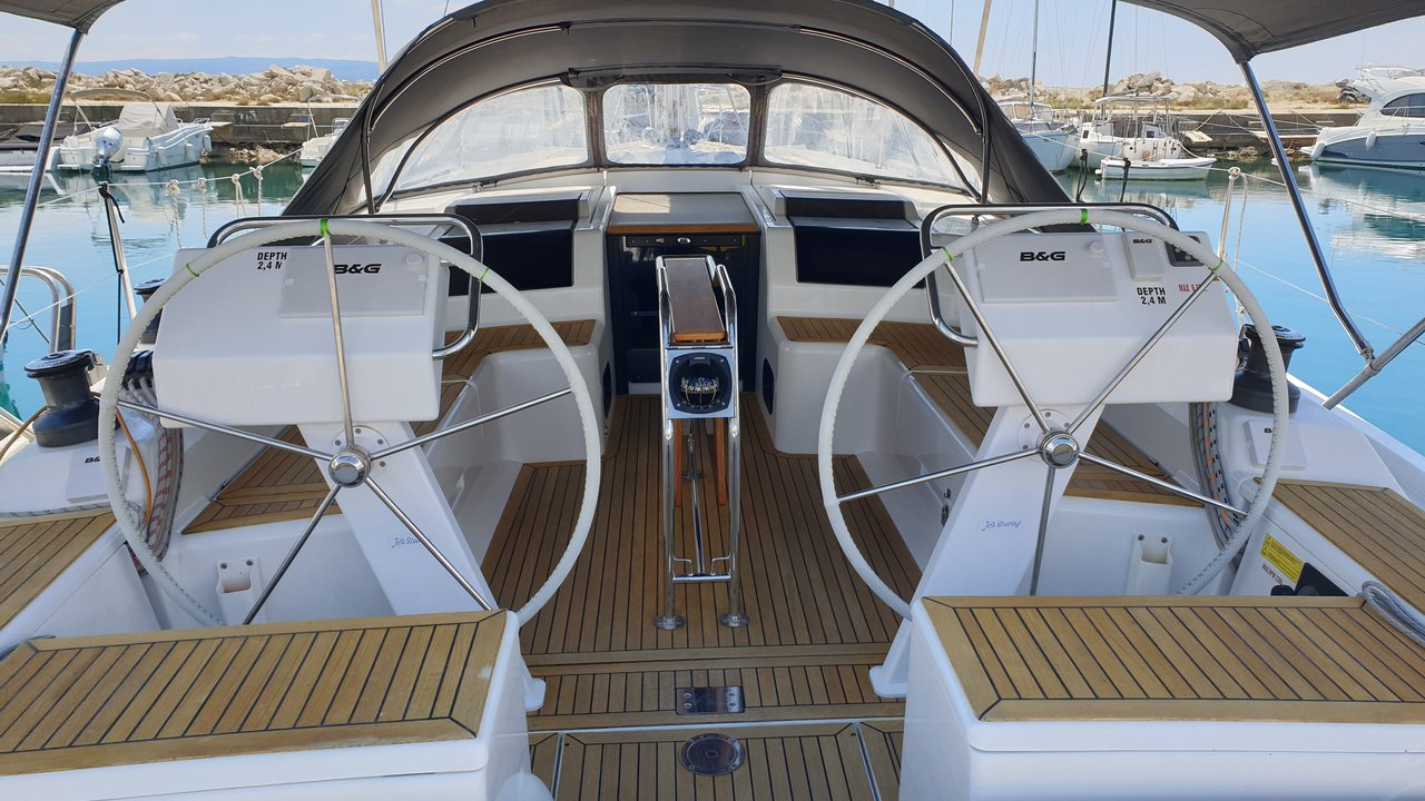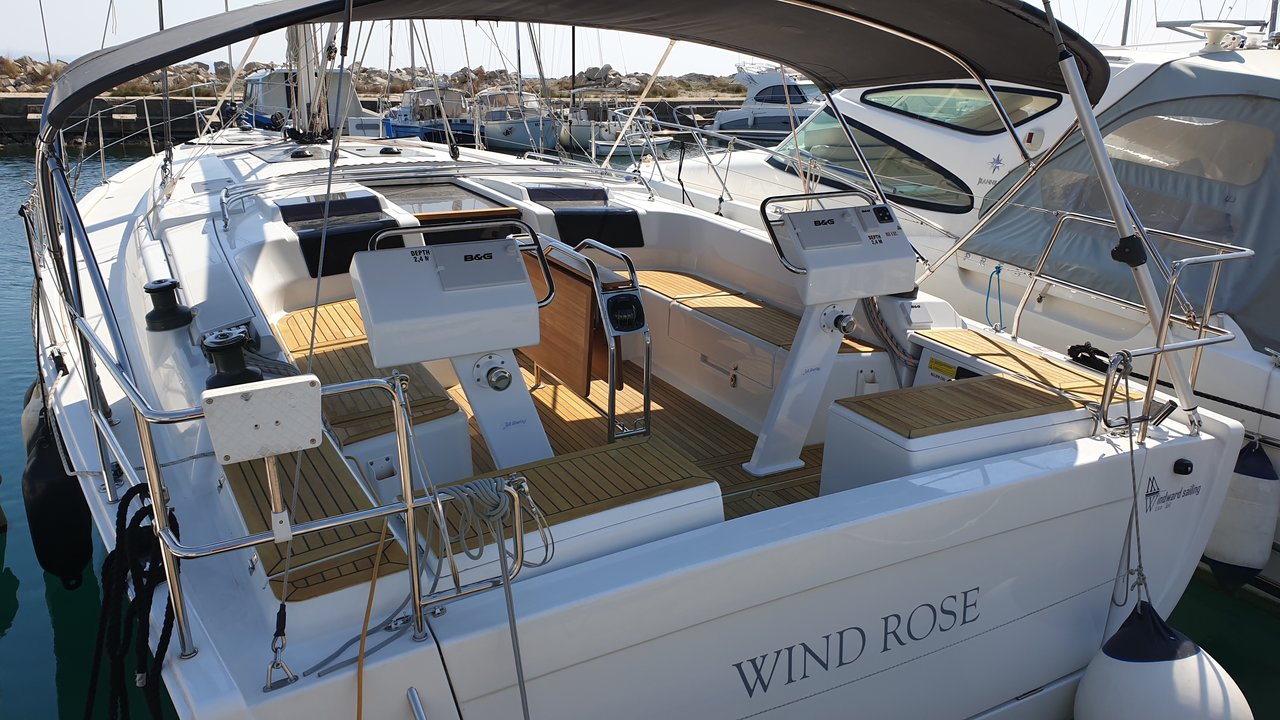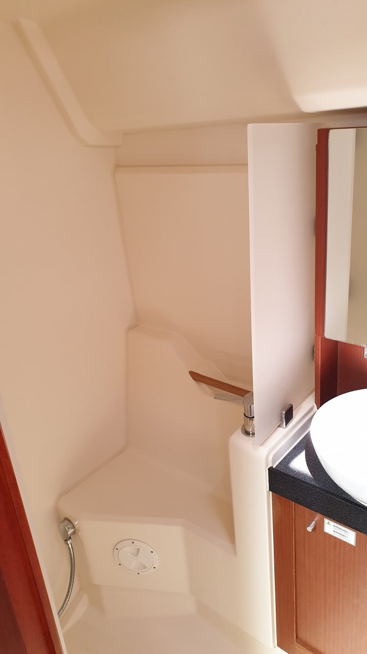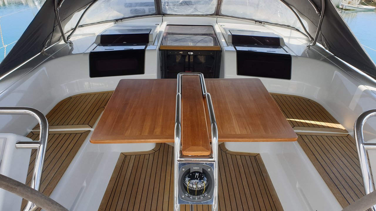 | Outside | 220 V-Landanschluss, Anker mit Kette, Badeplattform, Biminitop, Bootshaken, Cockpitdusche, Cockpitlautsprecher, Cockpittisch, Fender, Festmacherleinen, Gangway, Solaranlage, Sprayhood, Teak im Cockpit |