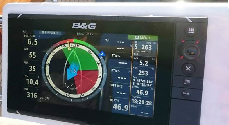 | Navigation | Fernglas, GPS mit Kartenplotter im Cockpit, Hafenhandbücher, Handpeilkompass, Kompass, Seekarten, Tridata (Log, Echolot, Windm.) |