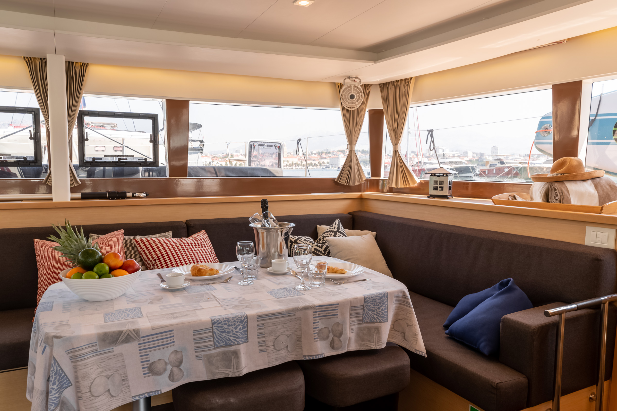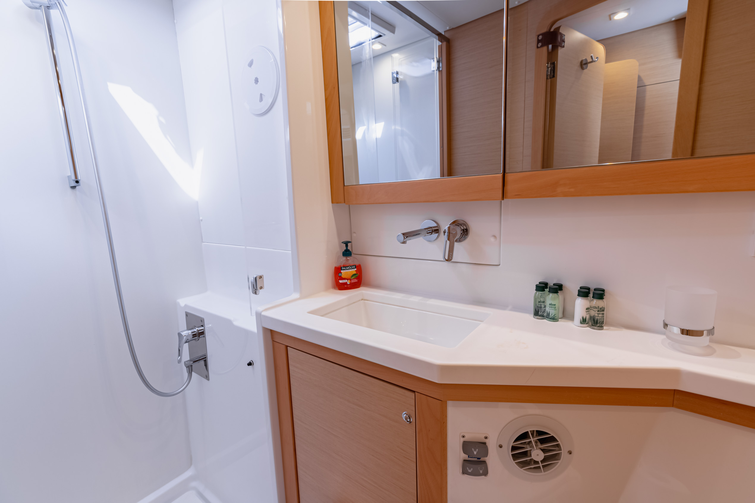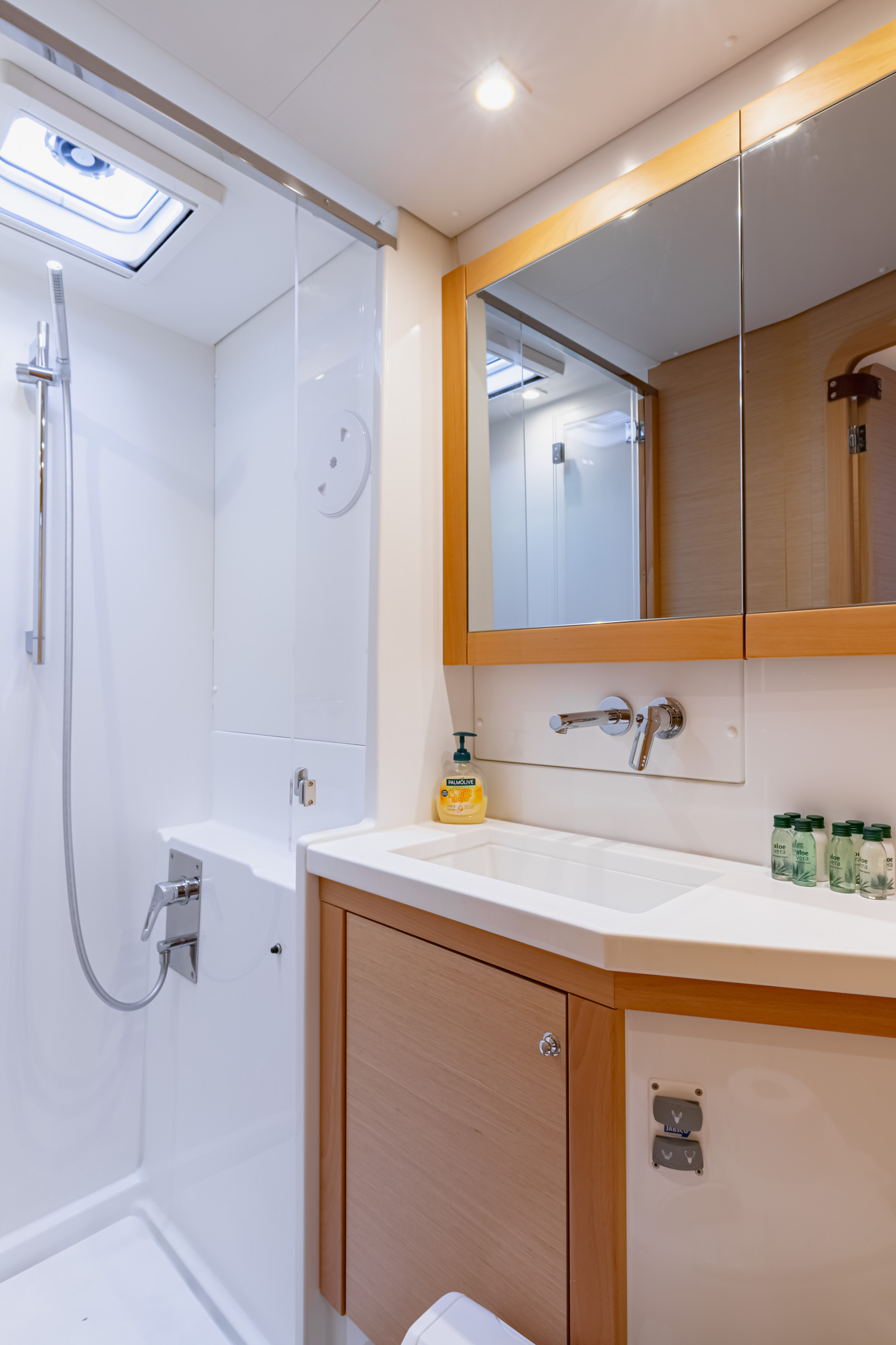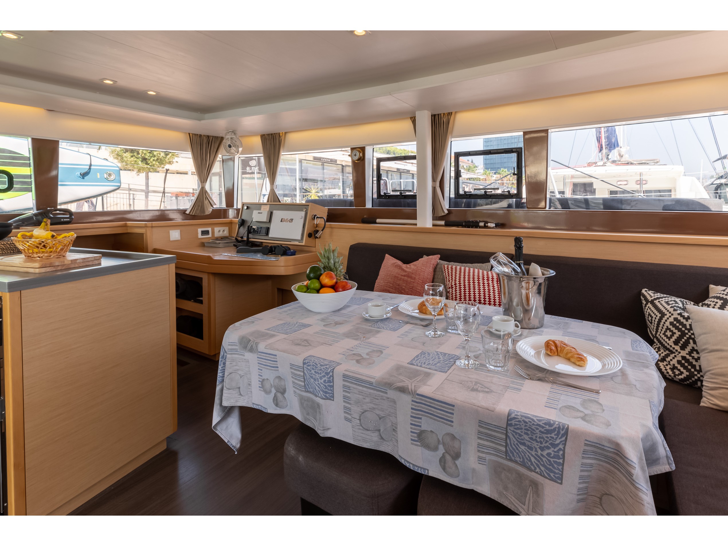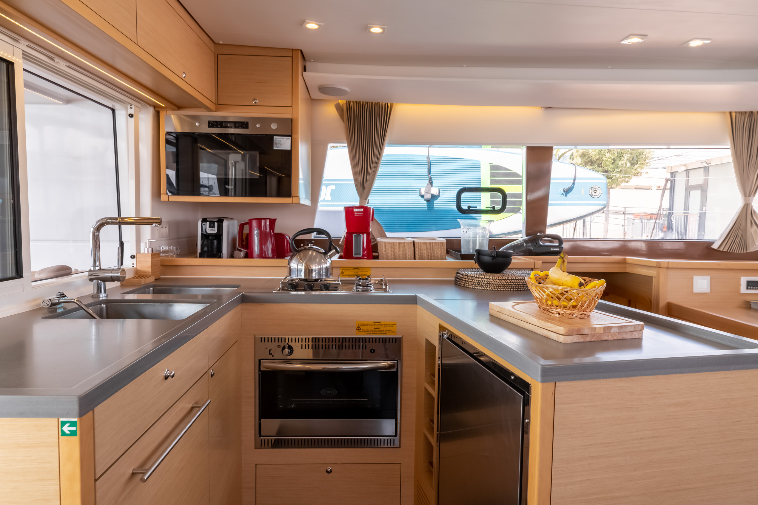 | Inside | Backofen, Eiswürfelmaschine, Fäkalientank, Gasherd, Gefrierschrank, Generator, Geschirrspüler, Heizung, Kaffeemaschine, Klimaanlage (ohne Landstrombedarf), Kühlschrank, Ladegerät, Mikrowelle, Pantryausstattung, Radio mit CD und MP3, TV + DVD, Warmwasser, Watermaker, WC (elektr.) |