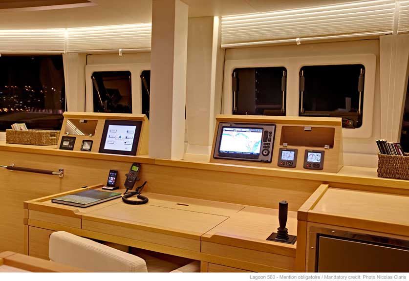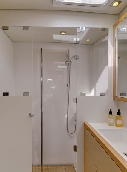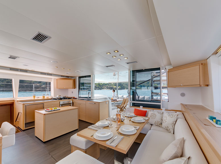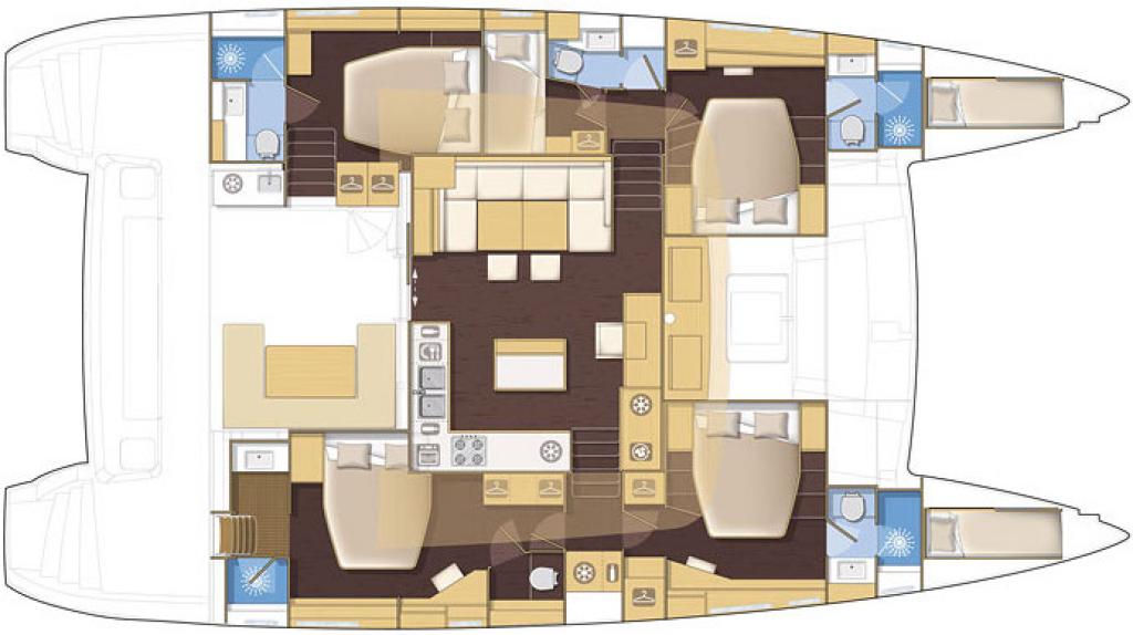 | Inside | 220V Steckdosen, Bluetooth Player, Bügeleisen, Eiswürfelmaschine, Fön, Gasherd mit Backofen, Generator, Geschirrspüler, Inverter 12V/220V, Kaffeemaschine, Klimaanlage (ohne Landstrombedarf), Ladegerät, Pantryausstattung, Radio, TV, Ventilatoren in Kabinen, Watermaker |