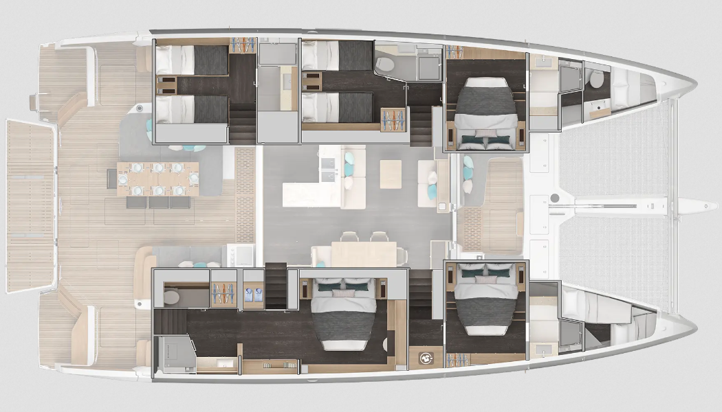 | Inside | 2. Kühlschrank, 220V Steckdosen, FUSION Sound System, Generator, Geschirrspüler, Klimaanlage (ohne Landstrombedarf), Ladegerät, Lautsprecher im Salon, Mikrowelle, Pantryausstattung, TV, USB Steckdose, Ventilatoren in Kabinen, Watermaker, Weinkühlschrank |