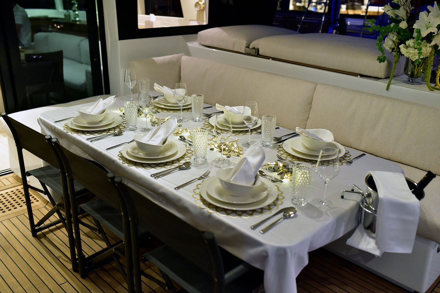 | Outside | 220 V-Landanschluss, Angelausrüstung, Anker mit Kette, Ankerwinsch, Badeleiter, Badeplattform, Benzinkanister, Biminitop, Bootshaken, Cockpitdusche, Cockpitkühlschrank, Cockpitpolster, Cockpittisch, Deckbürste, Dieselkanister , elektr. Ankerwinsch, Fender, Grill, Hardtop, Kugelfender, Kühlschrank auf Flybridge, Kunststoff-Eimer (Pütz), Sonnensegel, Teak auf Flybridge, Teak im Cockpit, Teakdeck, Tenderlift, Treibanker, Unterwasserbeleuchtung, Wantenschneider, Wasserkanister , Wasserschlauch, Winschen |