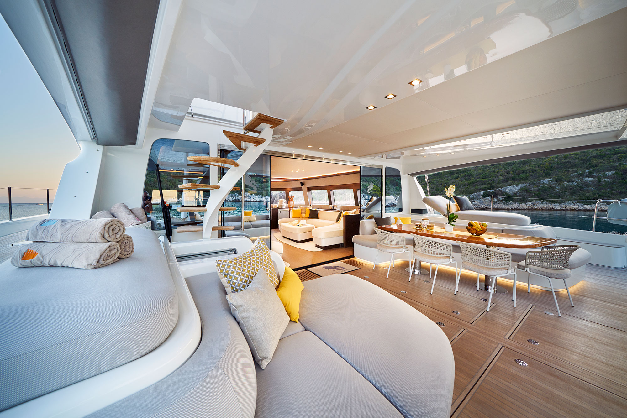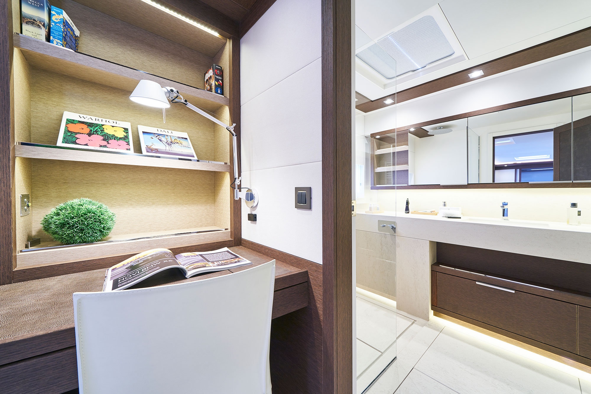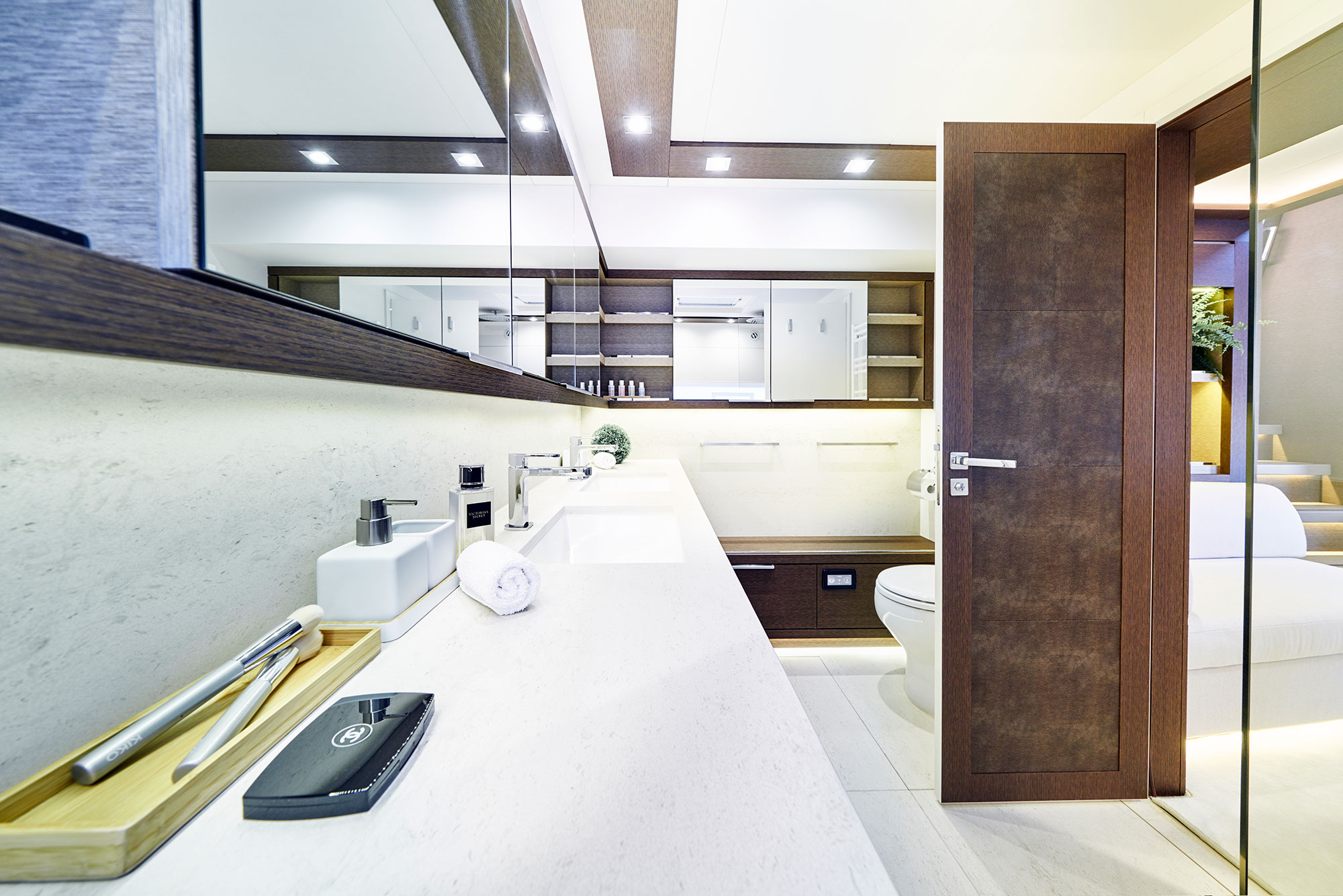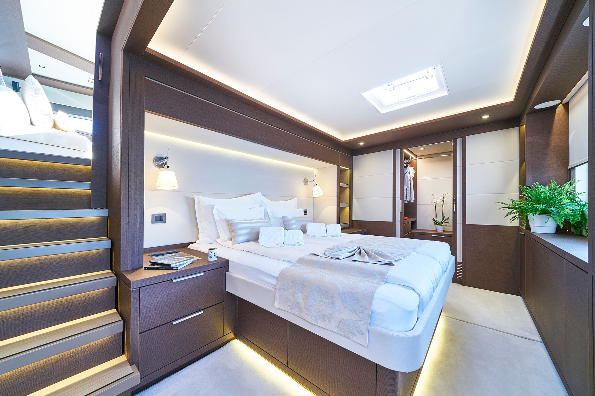 | Outside | 220 V-Landanschluss, Anker mit Kette, Badeleiter, Badeplattform, Badeplattform (hydr.), Biminitop, Bootshaken, Cockpitdusche, Cockpitdusche warm/kalt, Cockpitkühlschrank, Cockpitlautsprecher, Cockpittisch, Deckbürste, Deckpolster, Dieselkanister , elektr. Ankerwinsch, Fender, Flybridge mit Bimini und Kühlschrank, Grill, Hardtop, hydraul. Gangway, Kunststoff-Eimer (Pütz), Schnorchelausrüstung, Teak auf Flybridge, Teakdeck, Tenderlift, Unterwasserbeleuchtung, Wasserkanister , Wasserschlauch |