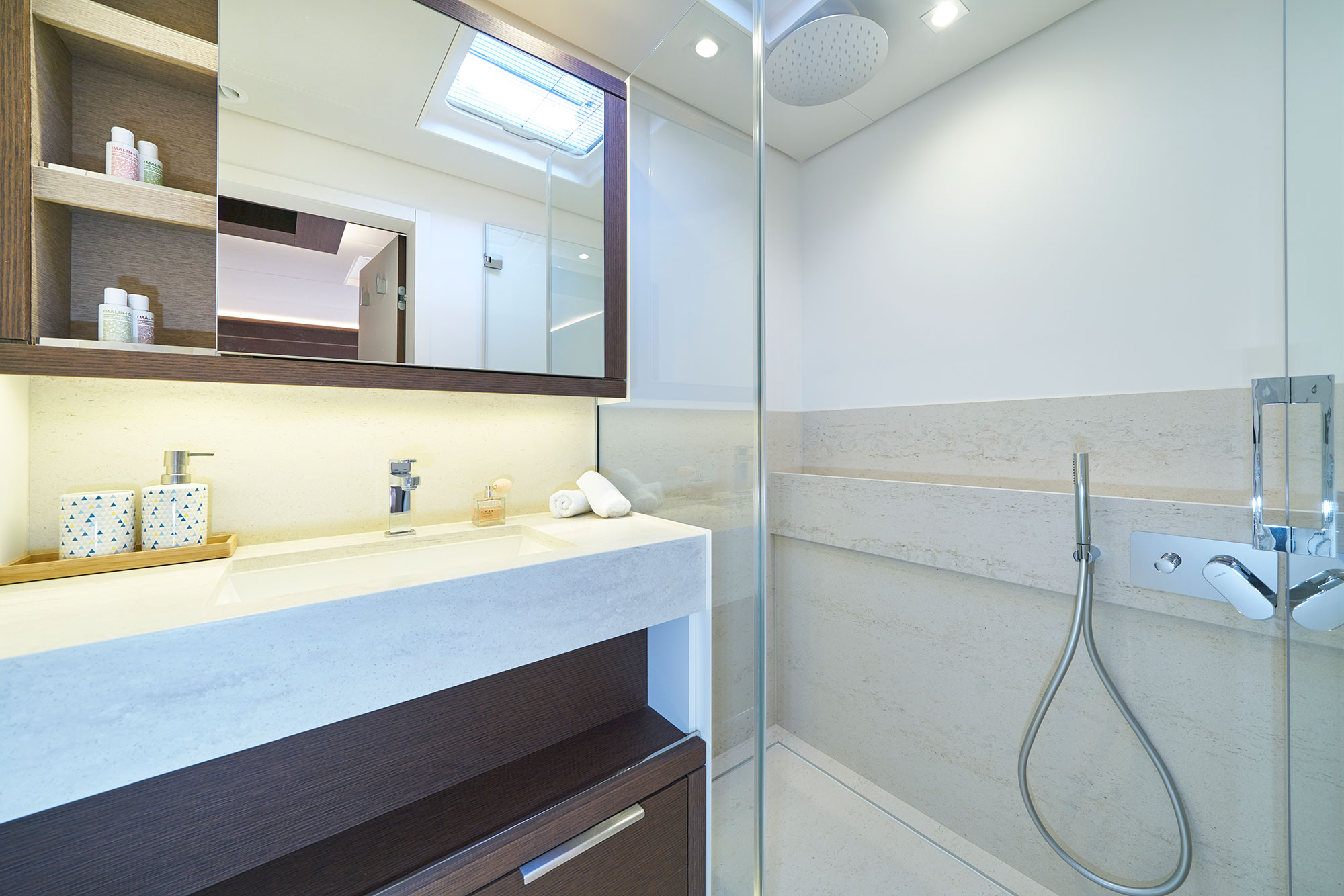 | Safety | AIS Empfänger, Autopilot, Bootsmannstuhl, Bordapotheke, Bordwerkzeug, Bugstrahlruder, elektr. Bilgepumpe, Feststoffschwimmwesten, Feuerlöscher, Flaggen, Handbilgepumpe, Handschuhe, Nebelhorn, Radarreflektor, Reparaturset für Beiboot, Rettungsinsel, Rettungskragen, Sicherheitsgurt, Suchscheinwerfer, Taschenlampe, UKW-Funk, Zweitanker |