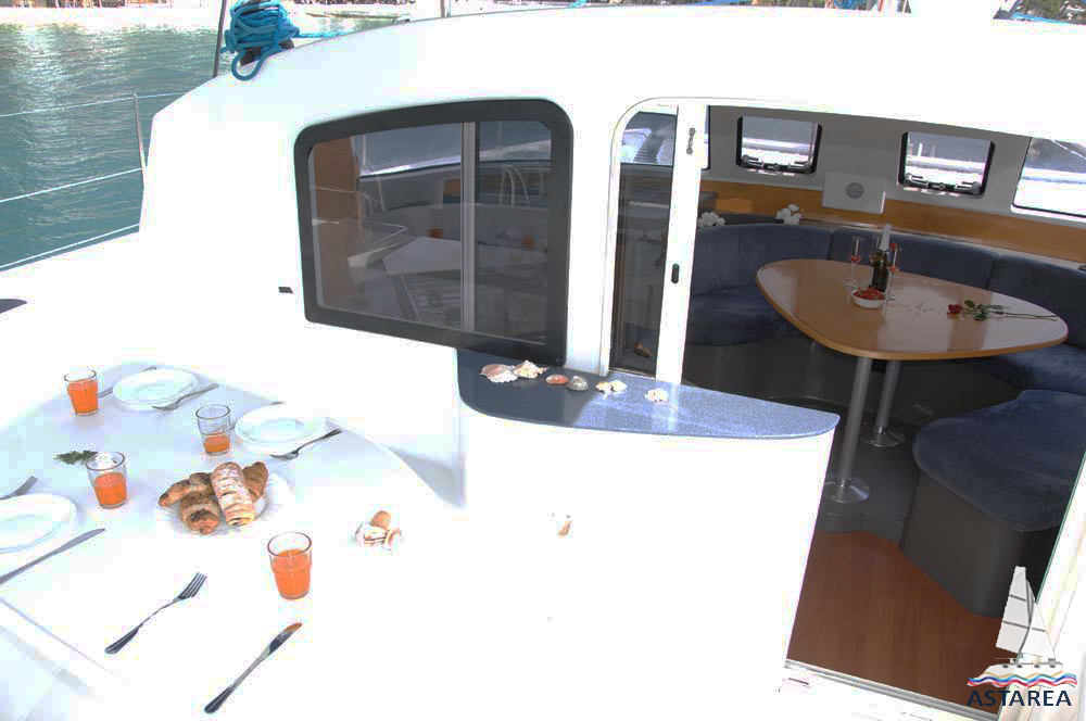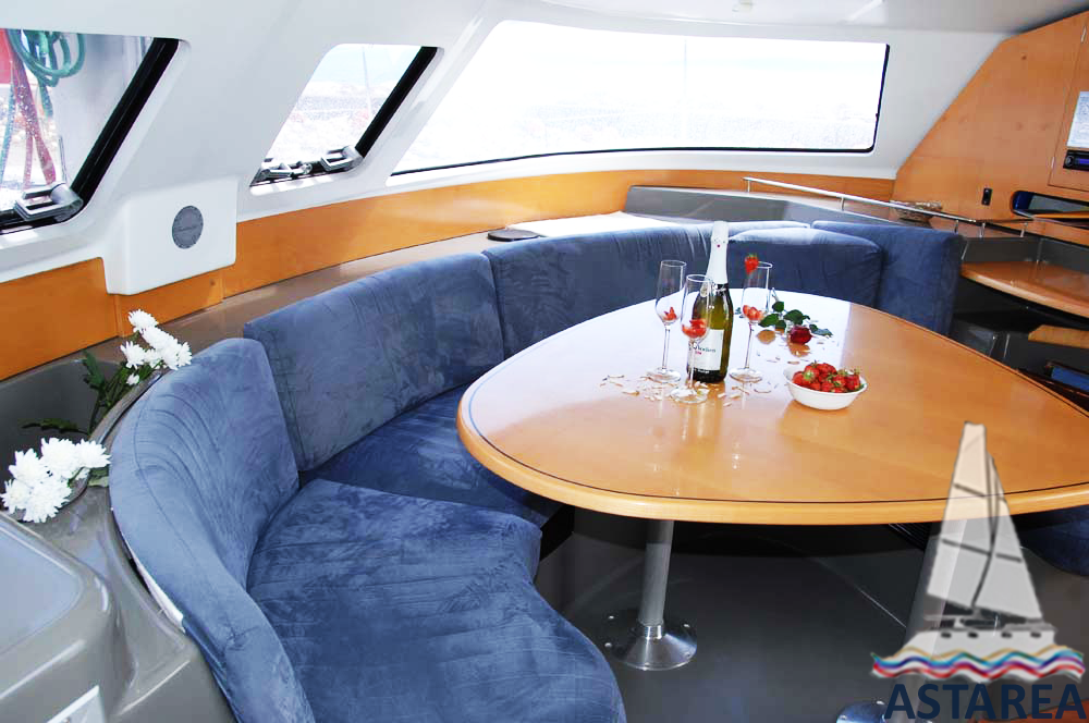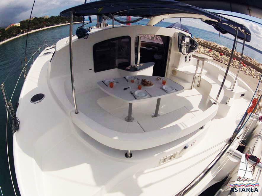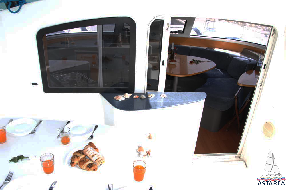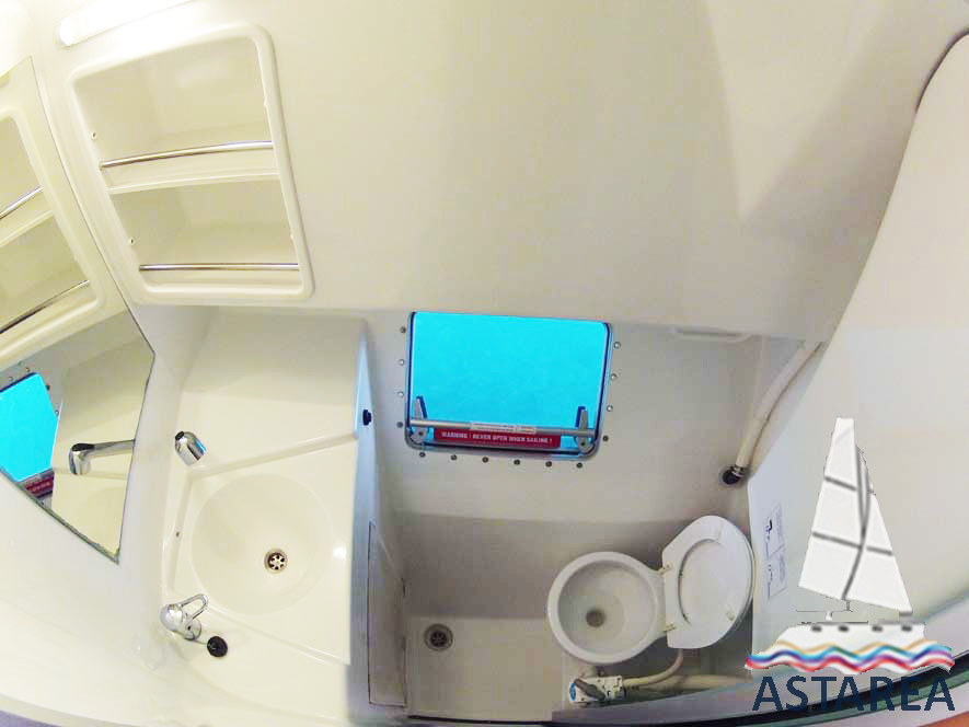 | Outside | 12 V-Anschluss, 220 V-Landanschluss, Anker mit Kette, Biminitop, Bootshaken, Cockpitdusche, Cockpitlautsprecher, Cockpittisch, elektr. Ankerwinsch, Fender, Festmacherleinen, Gangway, Hardtop, Windex |