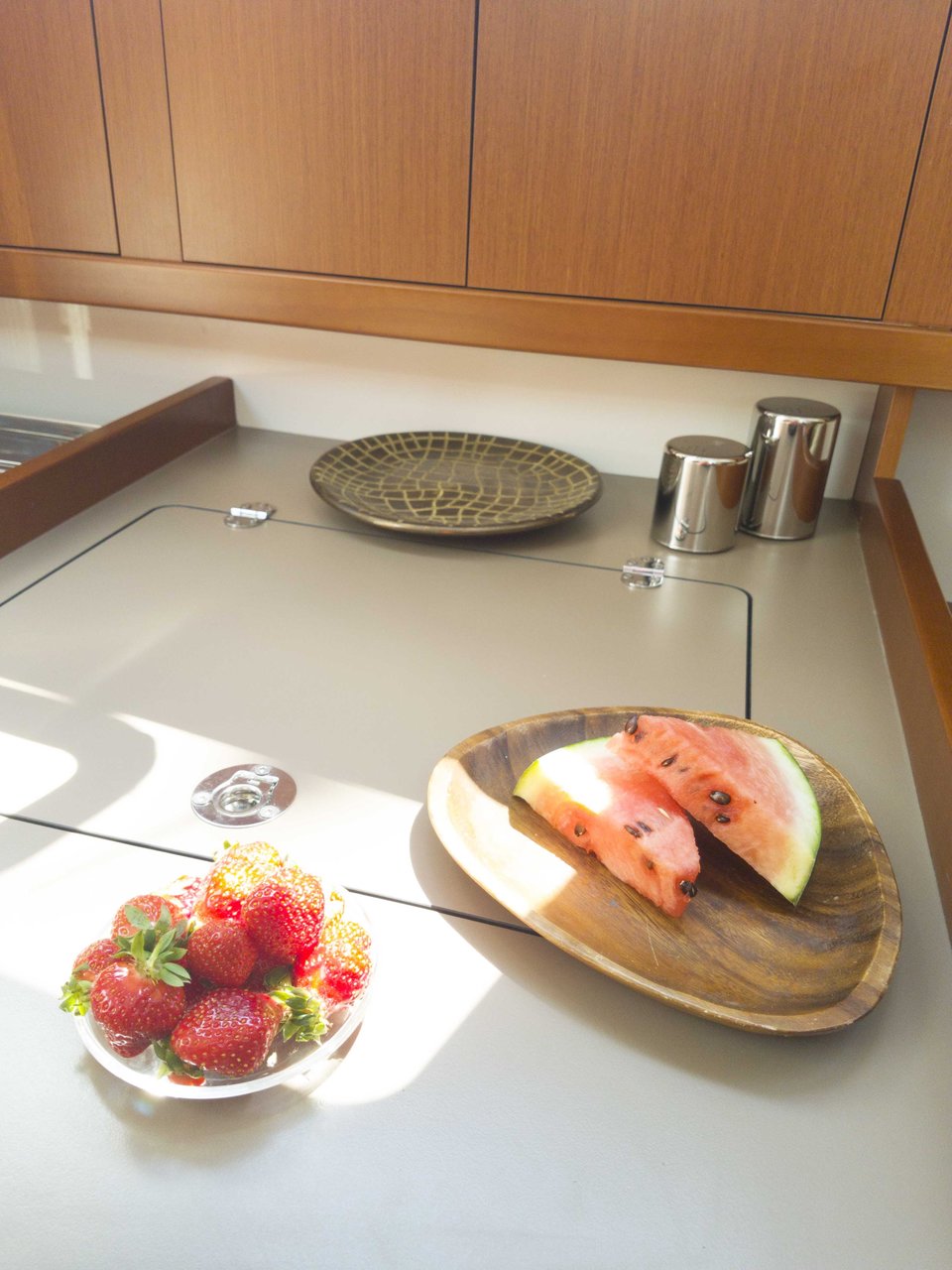 | Inside | Backofen, Kühlschrank, Ladegerät, LED-Innenleuchten, Luftpumpe für Beiboot, Pantryausstattung, Radio mit CD/MP3/USB, Warmwasser |