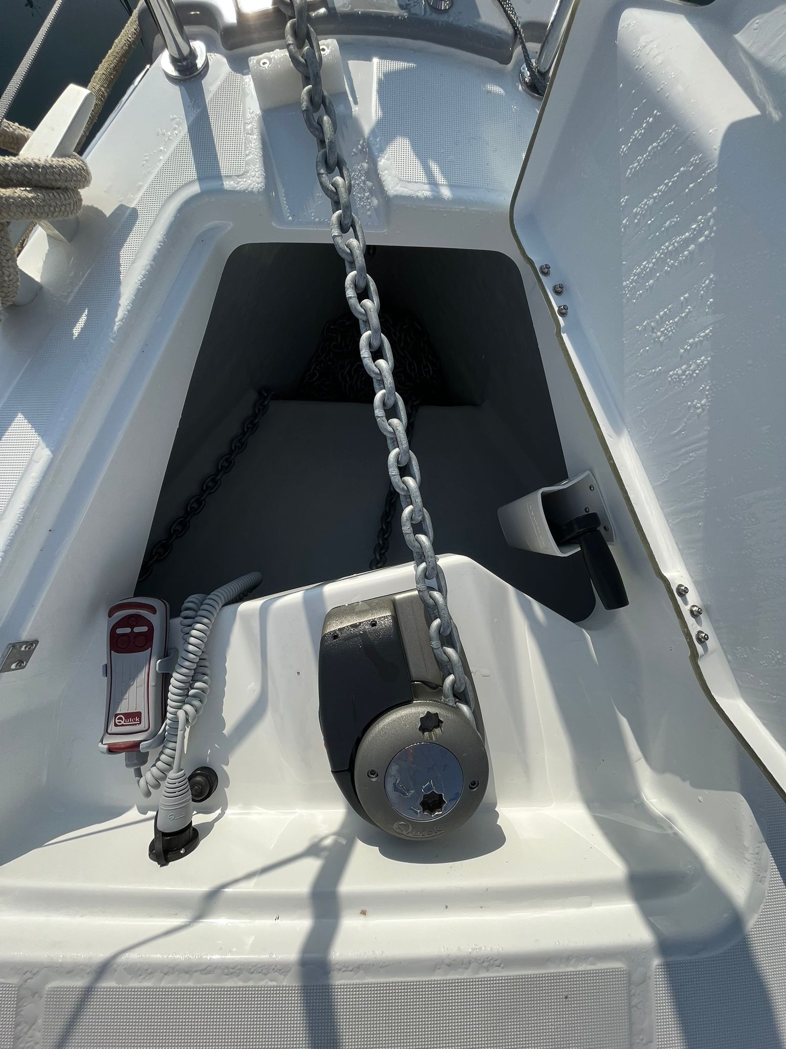 Outside 220 V-Landanschluss, Anker mit Kette, Biminitop, Bootshaken, Cockpitdusche warm/kalt, Cockpitlautsprecher, Cockpittisch, elektr. Ankerwinsch, Fender, Gangway, Kugelfender, Sprayhood