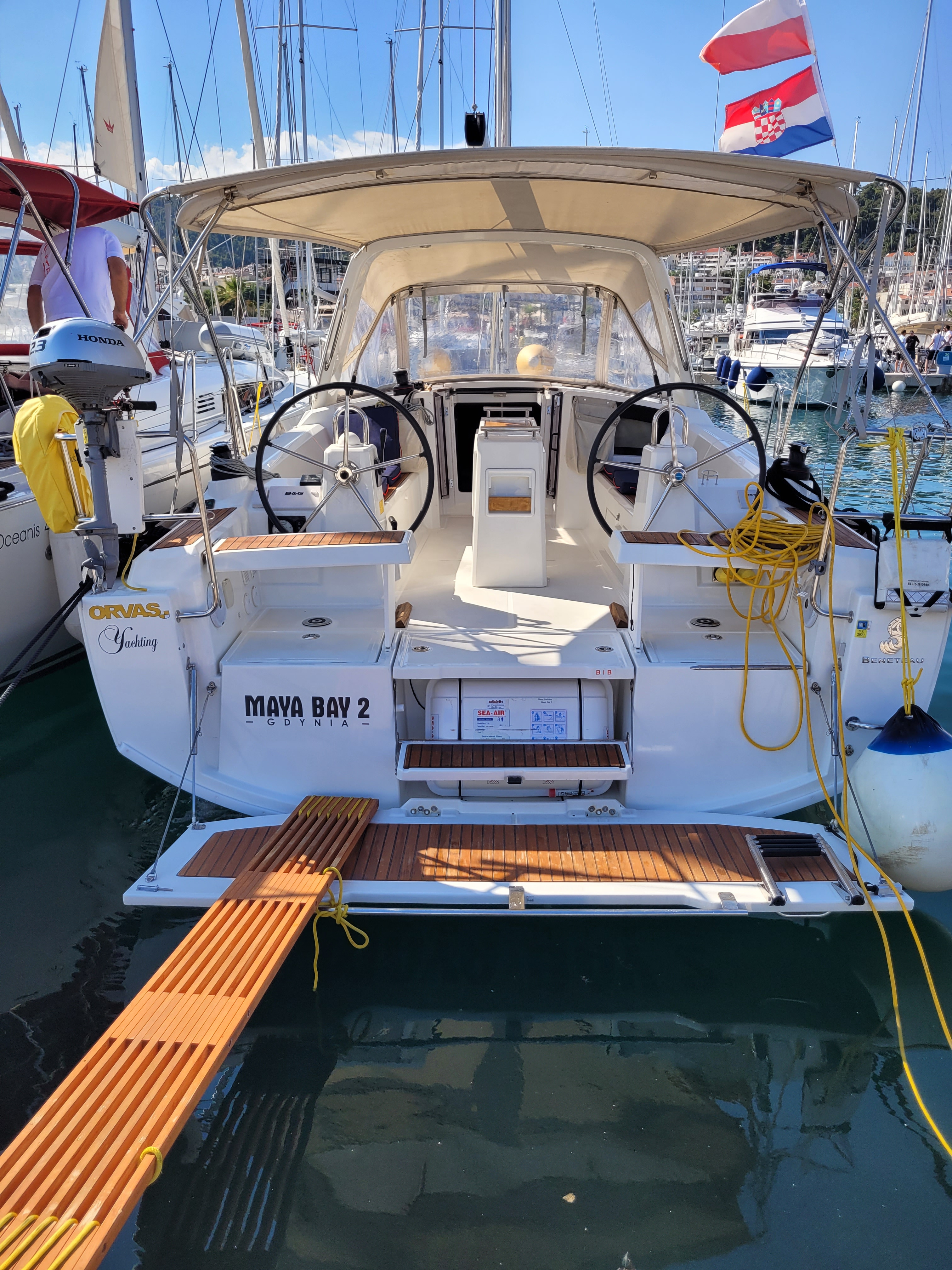 | Safety | AIS Empfänger, Autopilot, Bordapotheke, Bugstrahlruder, elektr. Bilgepumpe, Feststoffschwimmwesten, Feuerlöscher, Handbilgepumpe, Notsignale, UKW-Funk |