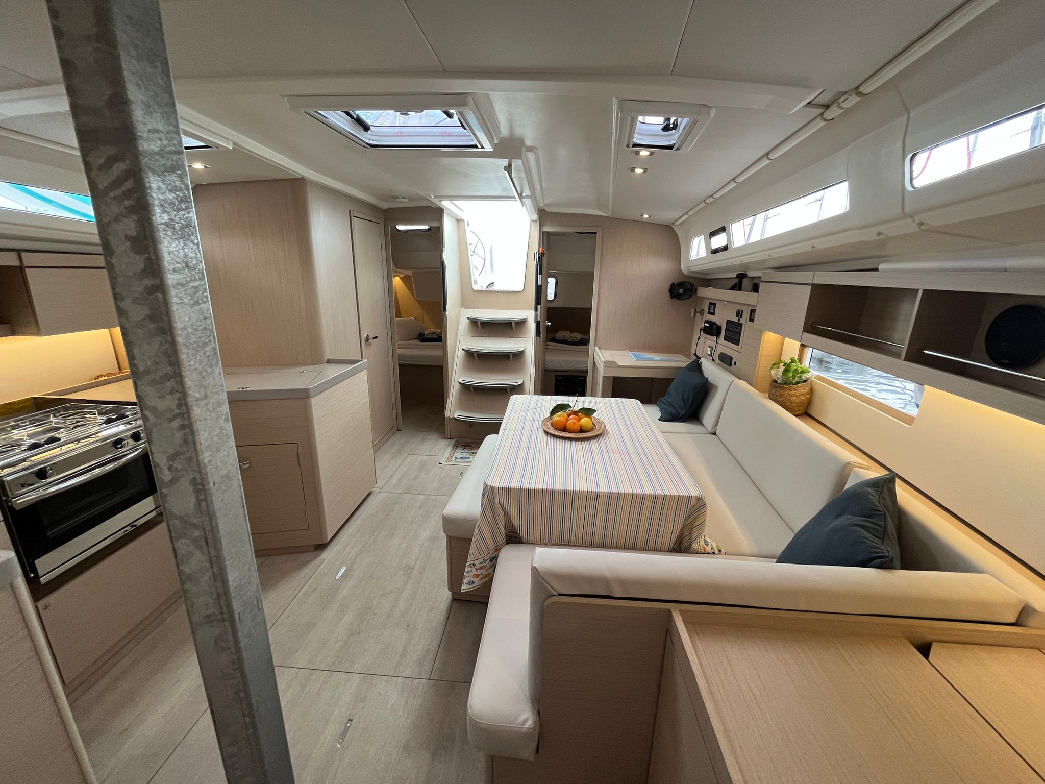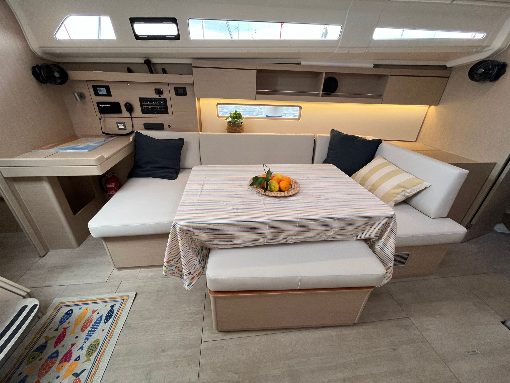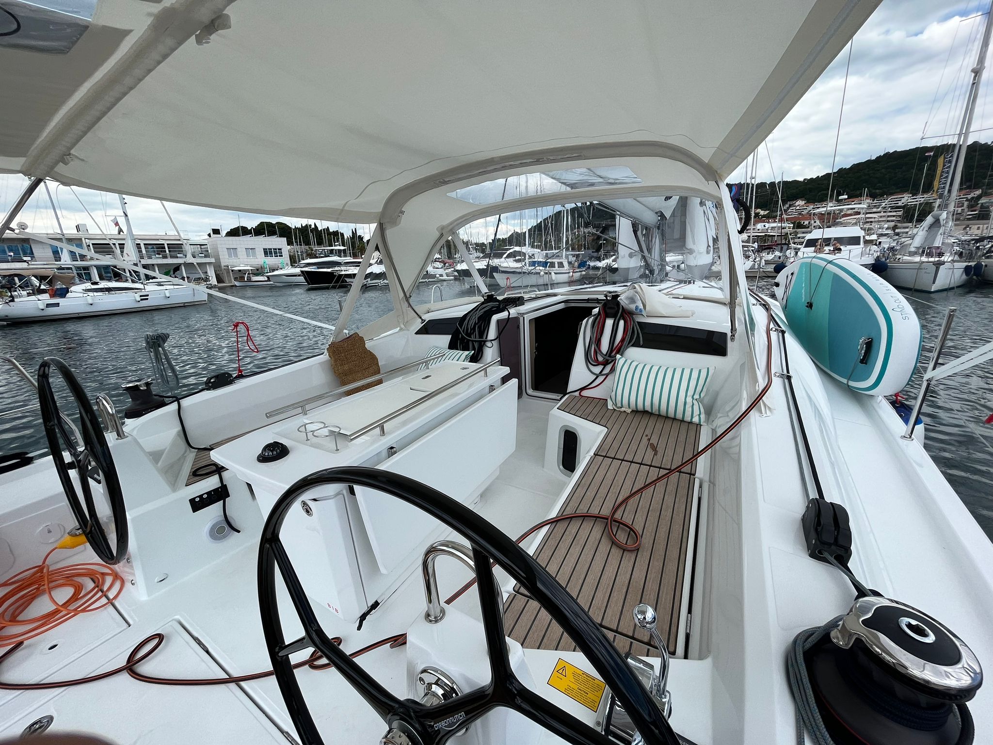 | Outside | 220 V-Landanschluss, Anker mit Kette, Badeplattform, Biminitop, Bootshaken, Cockpitdusche warm/kalt, Cockpitlautsprecher, Cockpittisch, elektr. Ankerwinsch, elektr. Winsch, Fender, Gangway, Kugelfender, Solaranlage, Sprayhood |