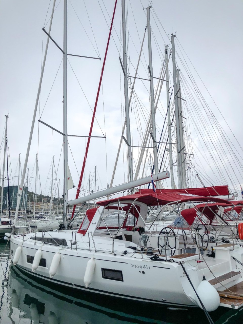 | Outside | 220 V-Landanschluss, Anker mit Kette, Badeplattform, Biminitop, Bootshaken, Cockpitdusche, Cockpitlautsprecher, Cockpitpolster, Cockpittisch, elektr. Ankerwinsch, Fender, Gangway, Kugelfender, Solaranlage, Sprayhood |