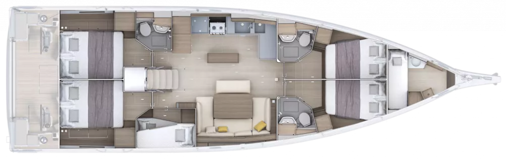 Inside Backofen, Frischwasserpumpe, Gasherd, Generator, Klimaanlage (ohne Landstrombedarf), Kühlschrank, Ladegerät, Pantryausstattung, Radio, Spülbecken, Ventilatoren in Kabinen, Warmwasser, WC (elektr.)