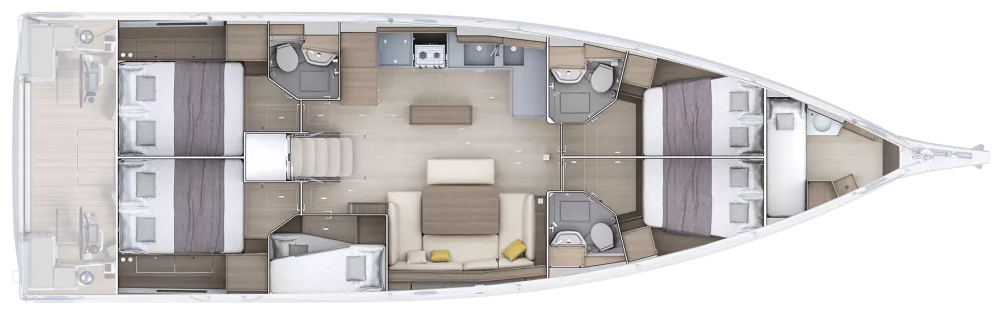 Outside 220 V-Landanschluss, Anker mit Kette, Badeplattform, Biminitop, Bootshaken, Cockpitdusche, Cockpitlautsprecher, Cockpitpolster, Cockpittisch, elektr. Ankerwinsch, Fender, Gangway, Sprayhood, Teak im Cockpit