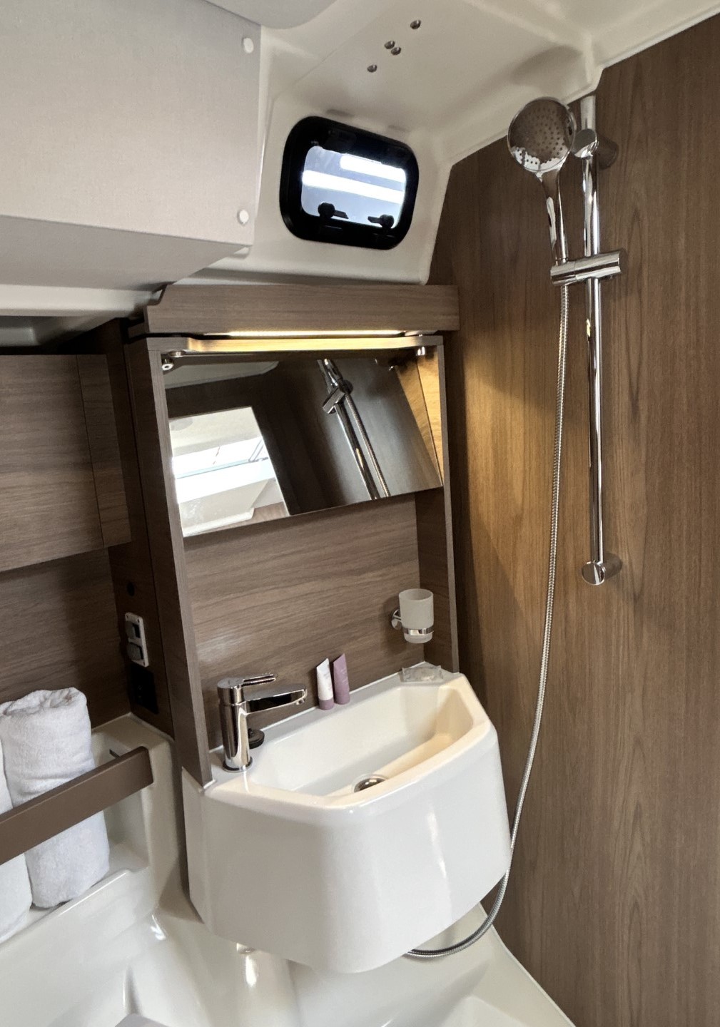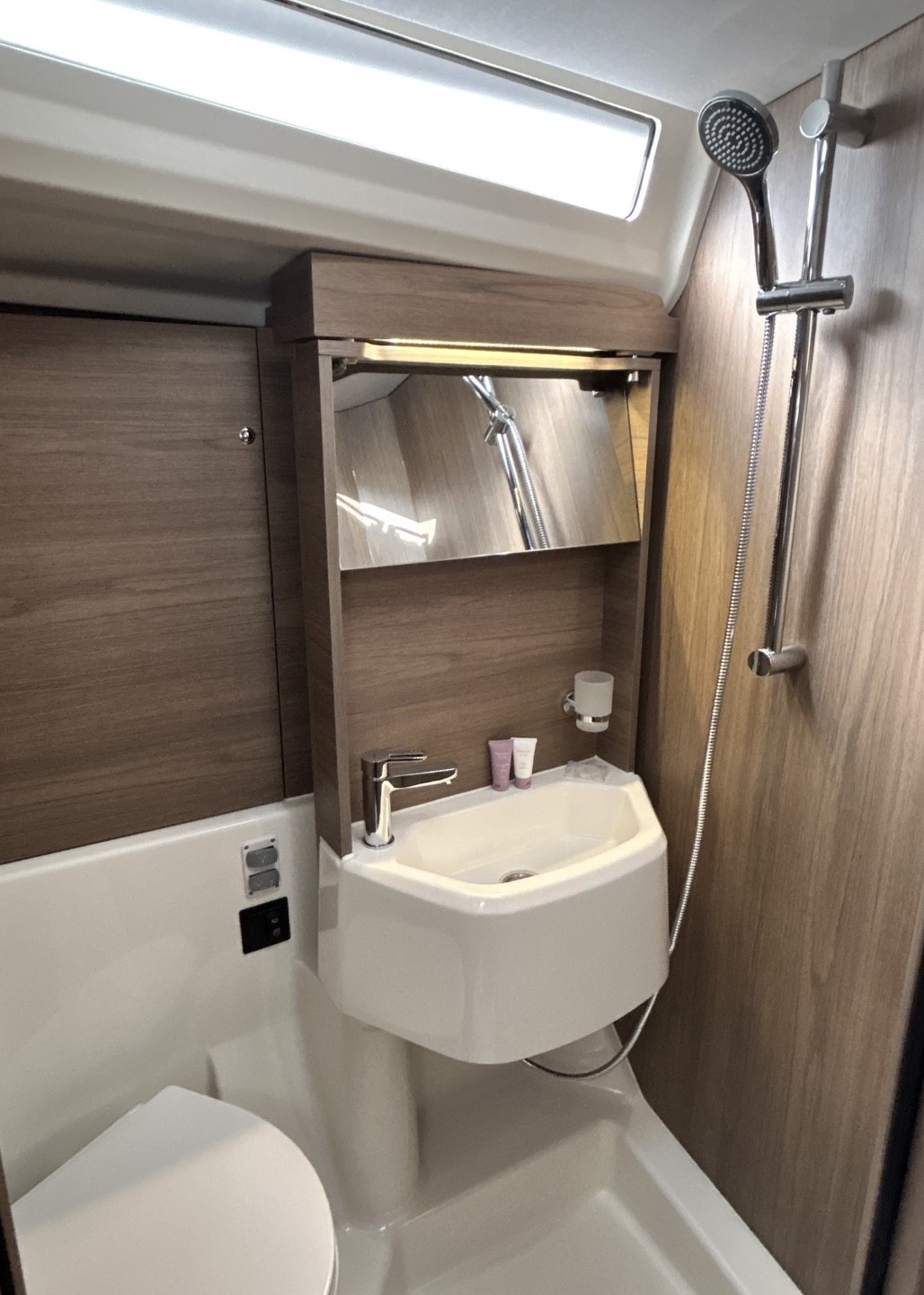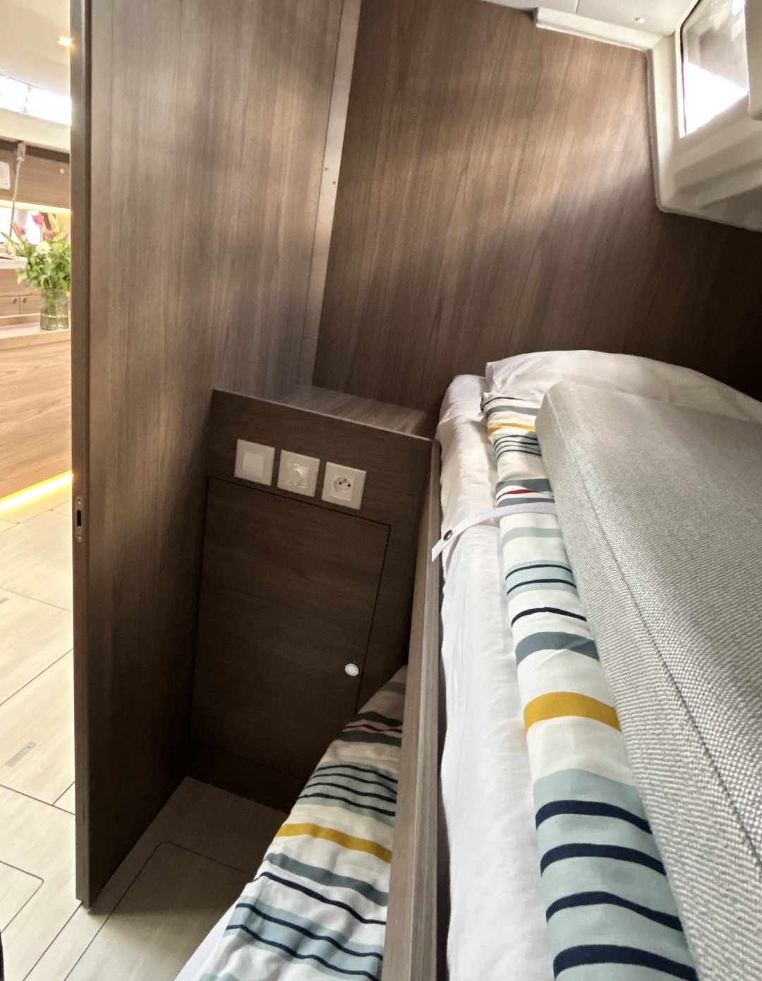 | Inside | Gasherd mit Backofen, Generator, Klimaanlage (ohne Landstrombedarf), Kühlschrank, Ladegerät, Pantryausstattung, Radio mit CD und USB, Ventilatoren in Kabinen, Warmwasser, WC (elektr.) |