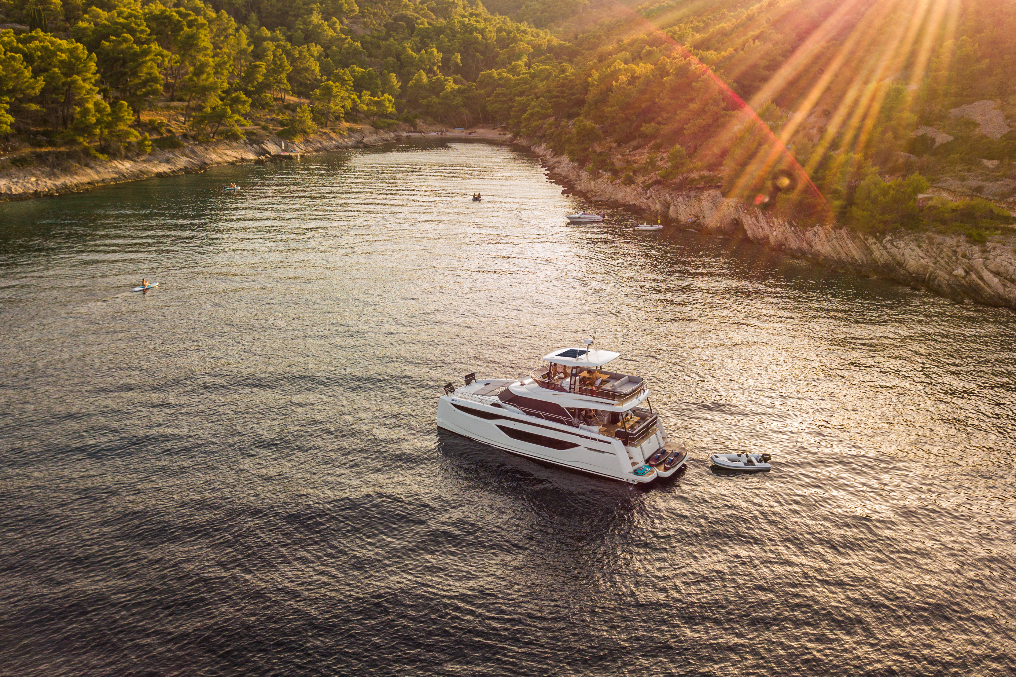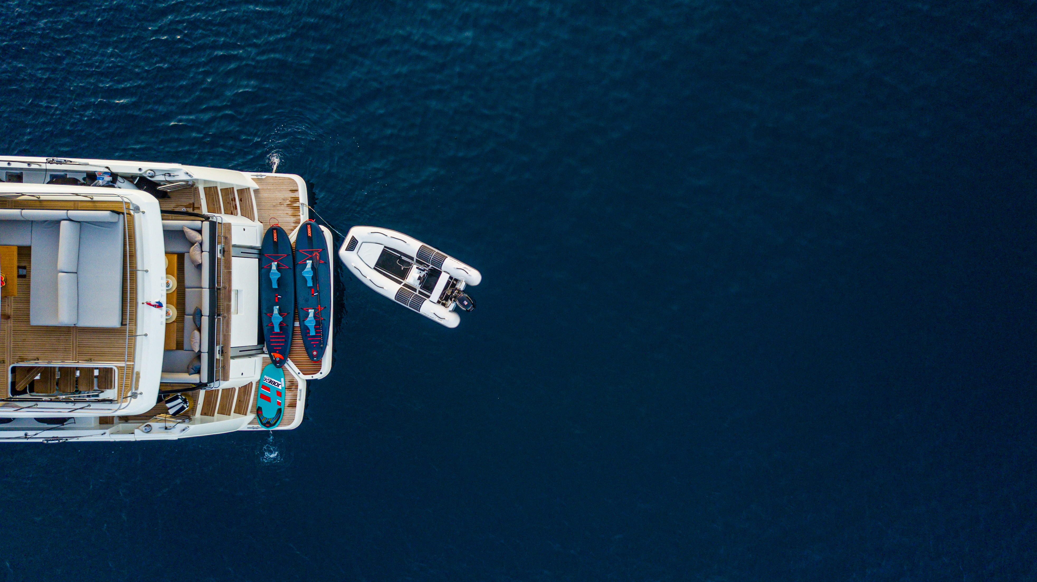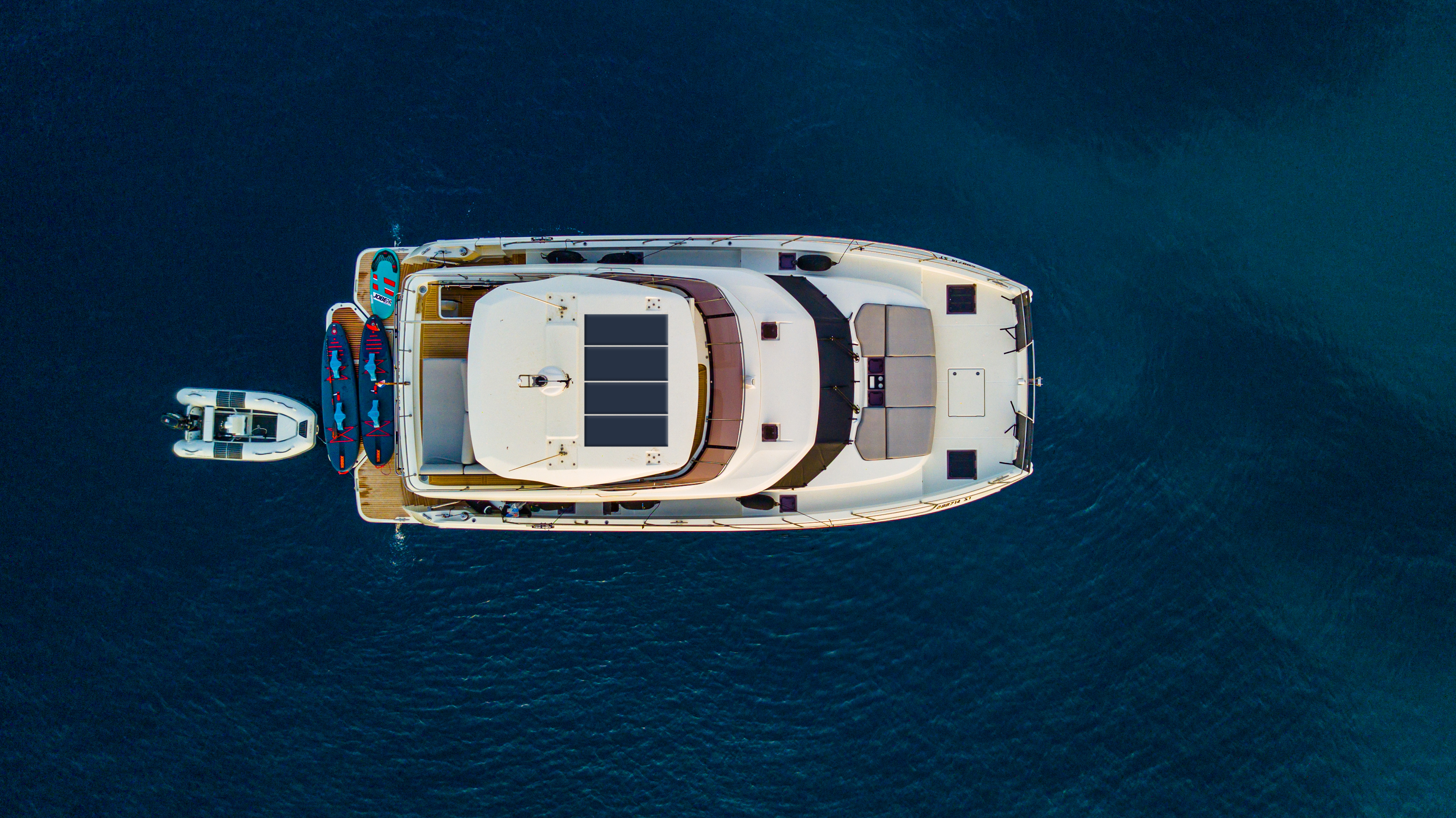 | Outside | Badeplattform (hydr.), Cockpitlautsprecher, Deckpolster, elektr. Winsch, Hardtop, hydraul. Gangway, Kühlschrank auf Flybridge, Schnorchelausrüstung, Teak im Cockpit, Teakdeck, Unterwasserbeleuchtung |