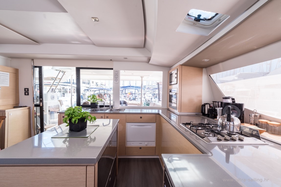 | Inside | Gasherd mit Backofen, Generator, Heizung, Kaffeemaschine, Klimaanlage (ohne Landstrombedarf), Kühlschrank mit Gefrierfach, Ladegerät, Mikrowelle, Pantryausstattung, Radio mit CD und USB, TV, Warmwasser, Watermaker |