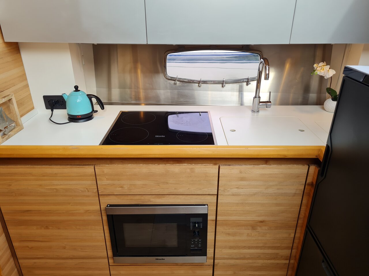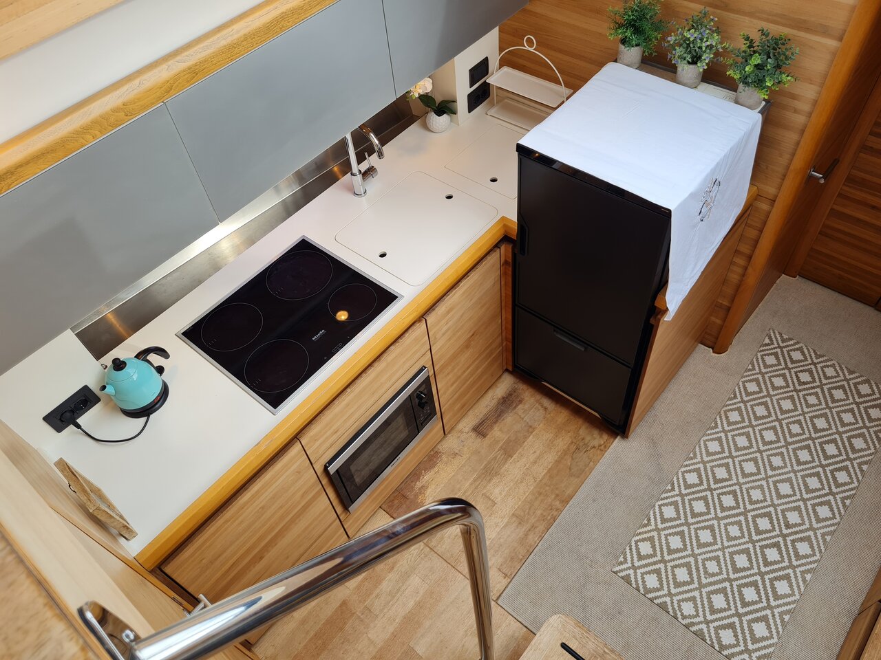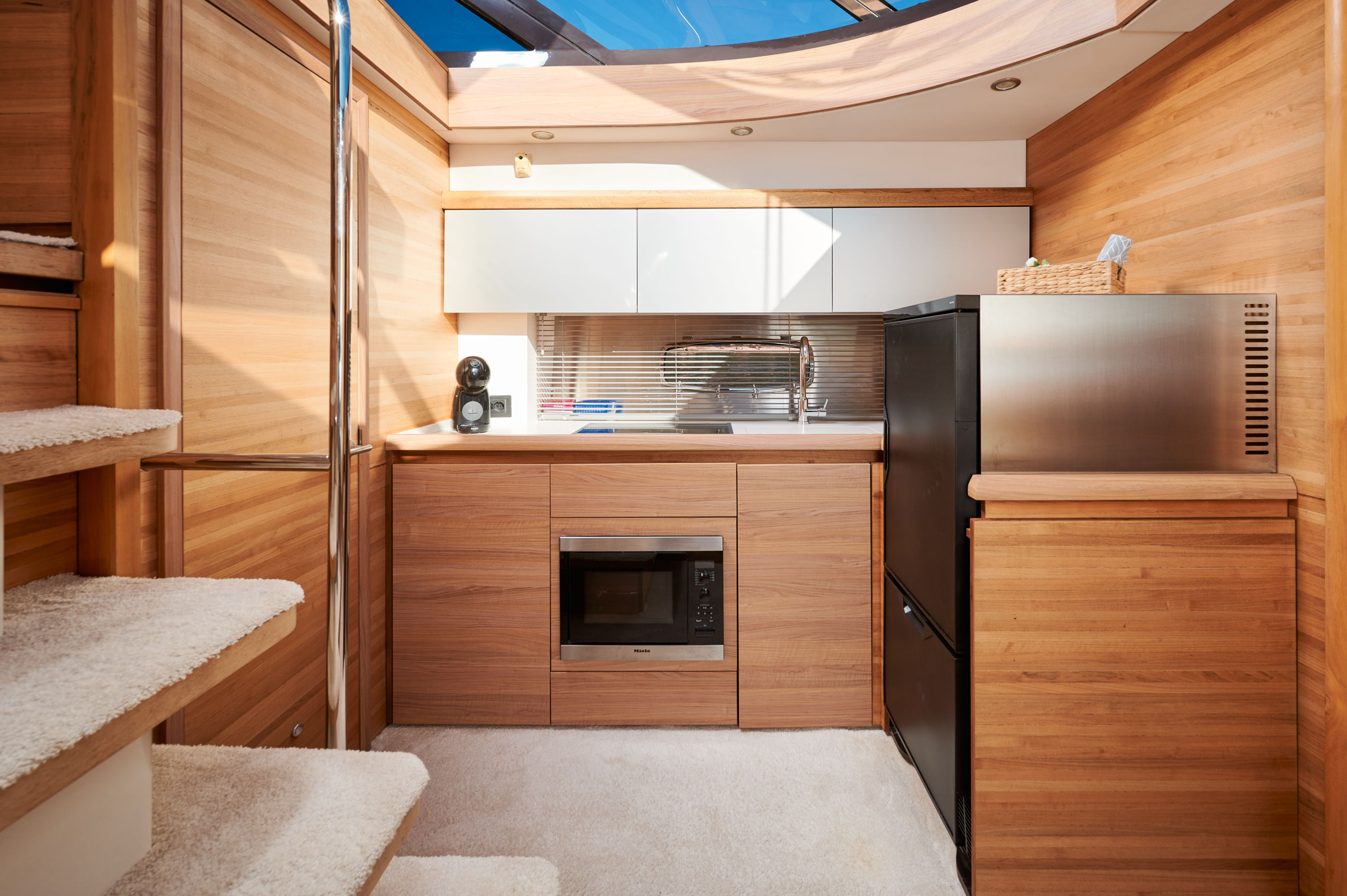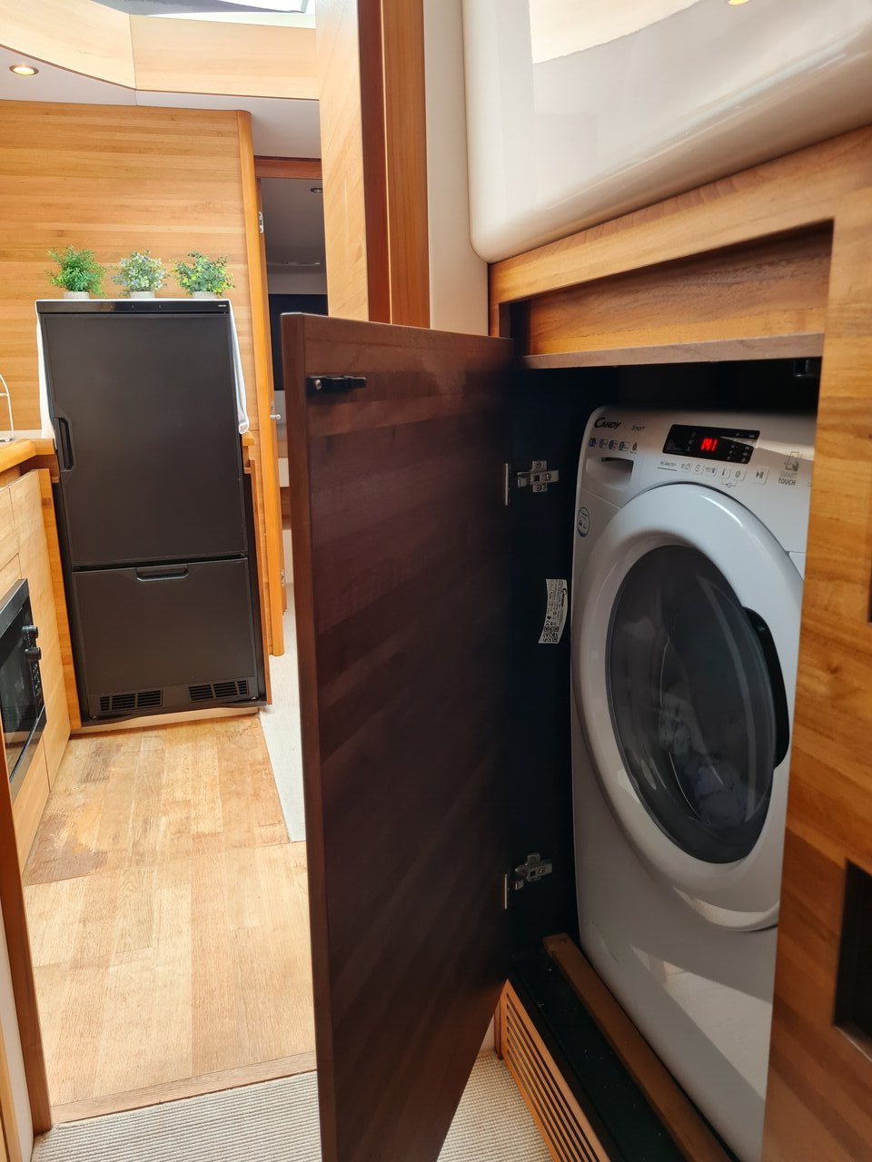 | Inside | Backofen, Gefrierschrank, Generator, Klimaanlage (ohne Landstrombedarf), Kühlbox, Kühlschrank, Mikrowelle, Pantryausstattung, Radio mit Bluetooth, Sound System, TV, WC (elektr.) |
