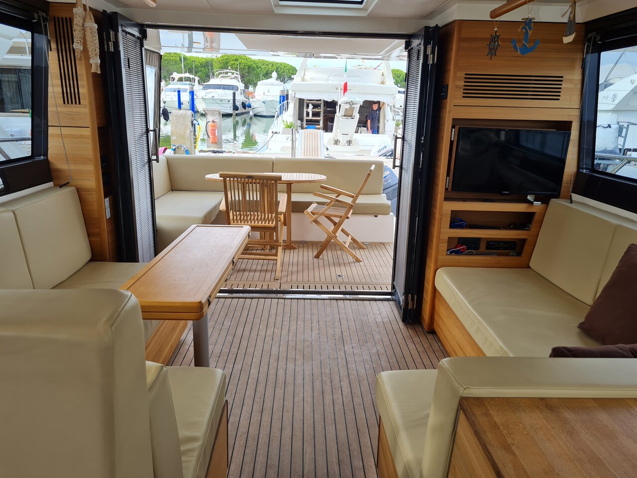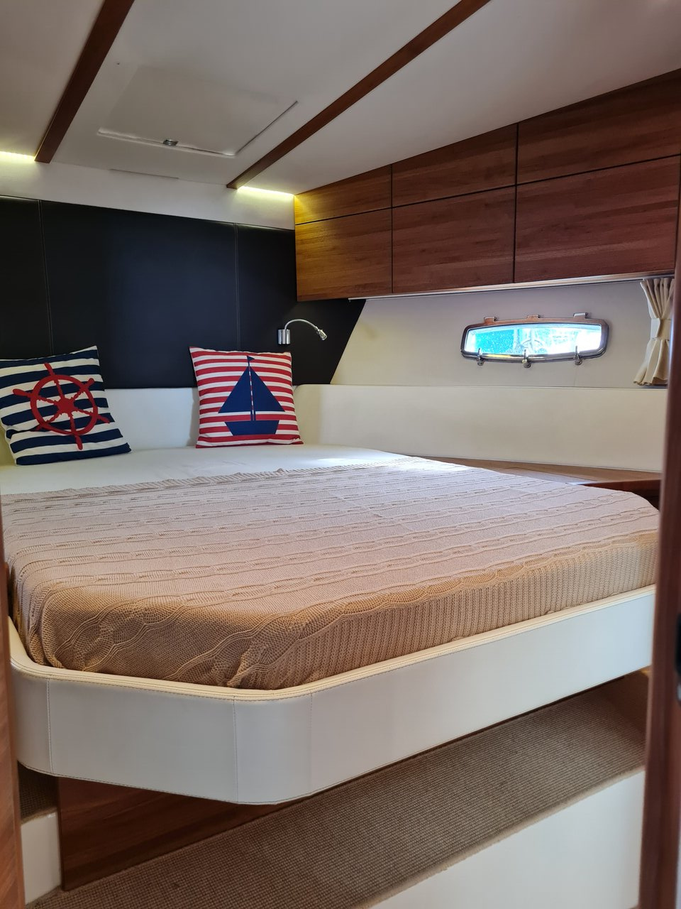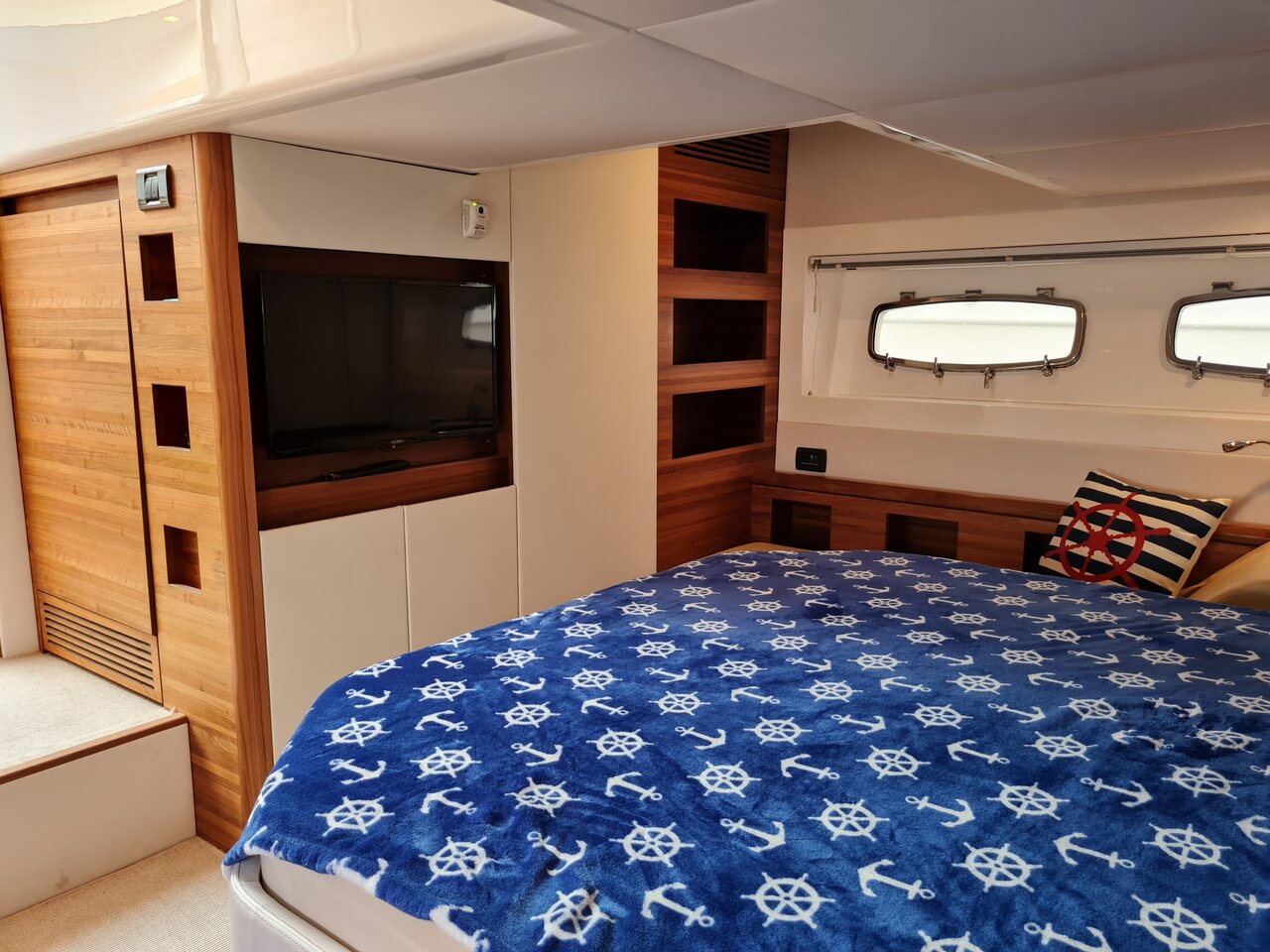 | Inside | Backofen, Gefrierschrank, Generator, Klimaanlage (ohne Landstrombedarf), Kühlbox, Kühlschrank, Mikrowelle, Pantryausstattung, Radio mit Bluetooth, Sound System, TV, WC (elektr.) |