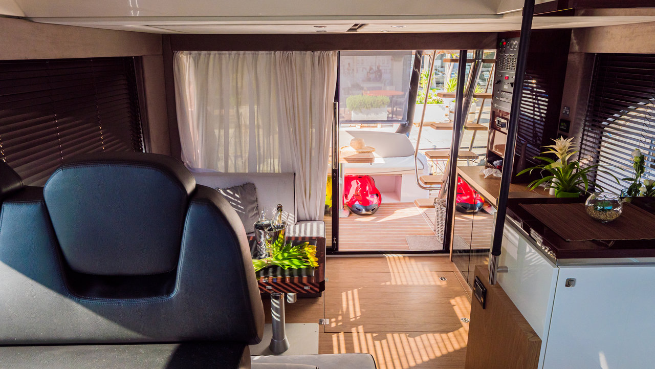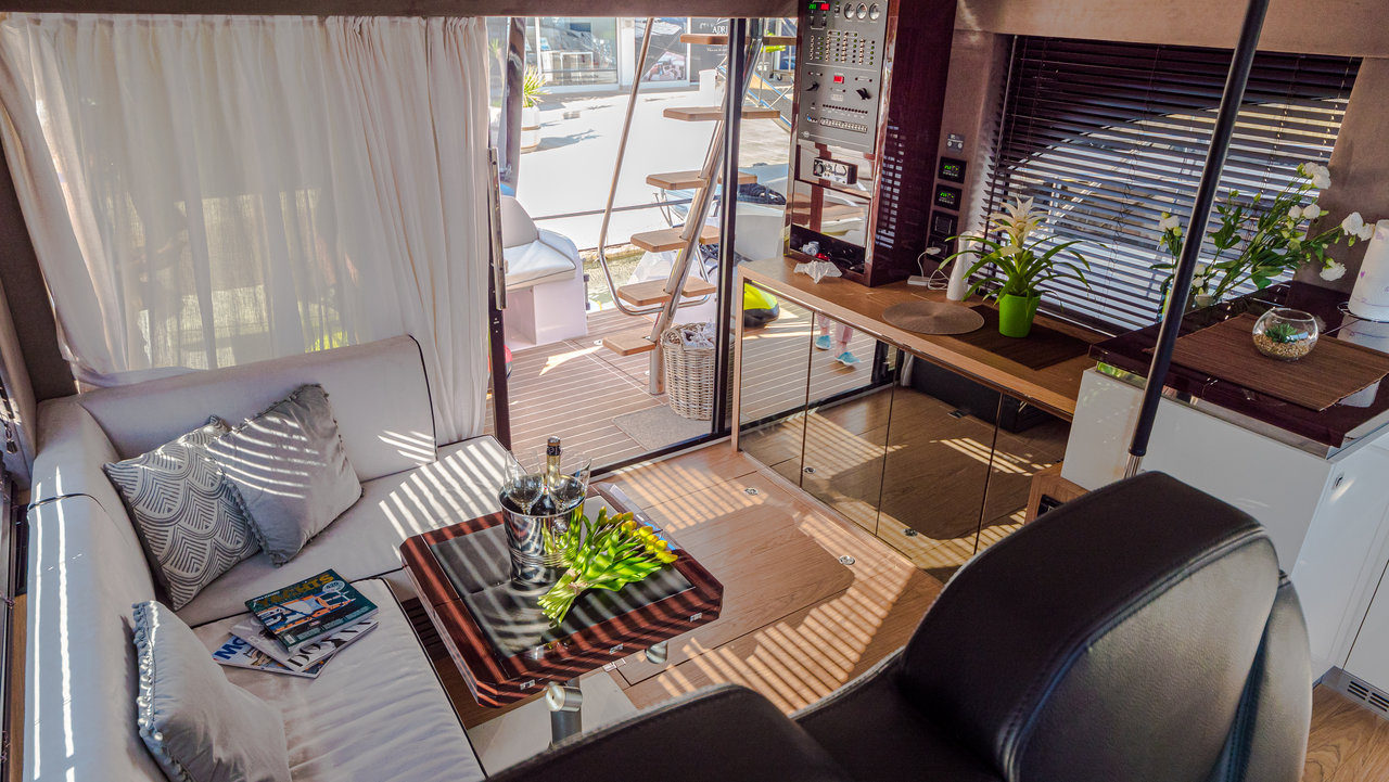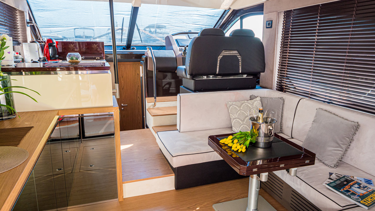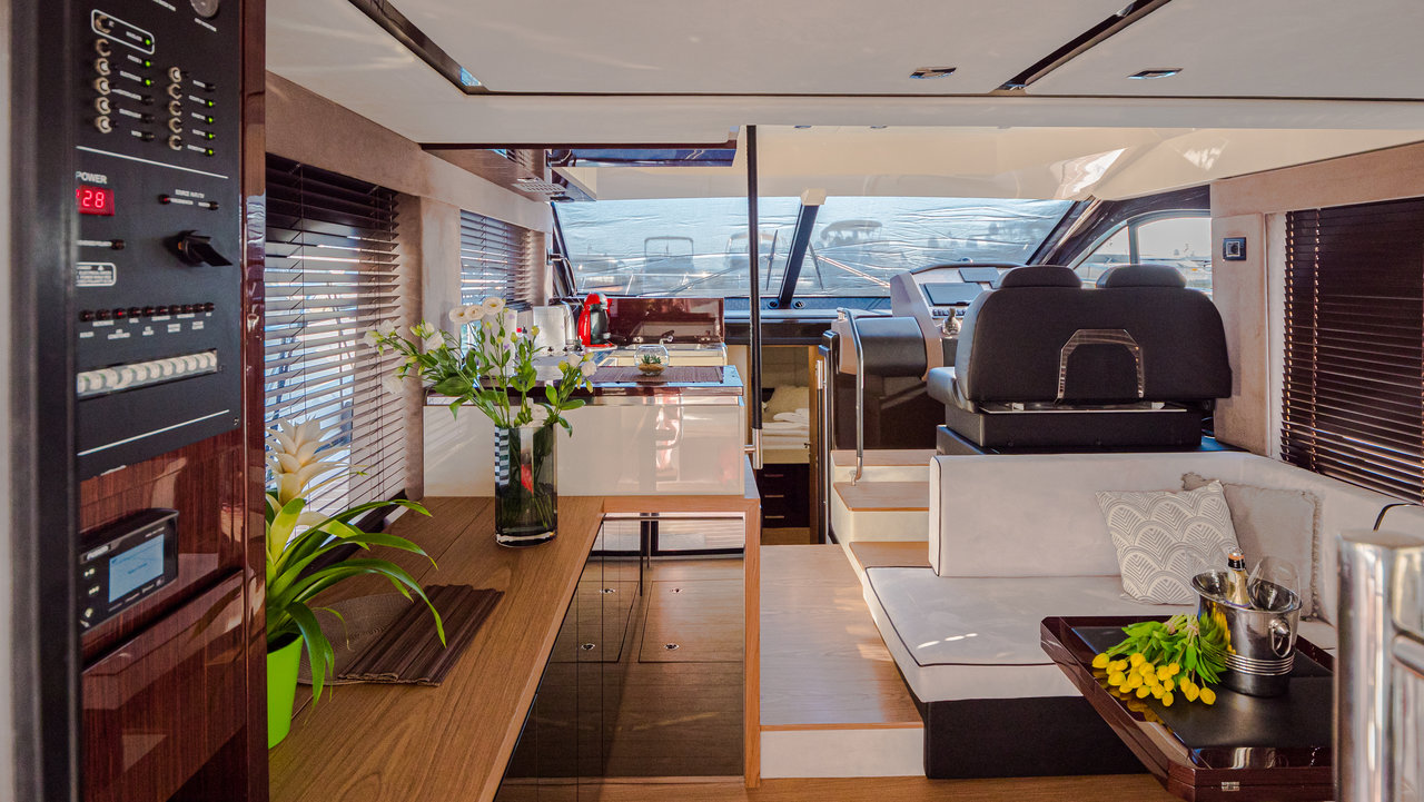 | Inside | Fäkalientank, FUSION Sound System, Gefrierschrank, Generator, Geschirrspüler, Klimaanlage (ohne Landstrombedarf), Kühlschrank, Pantryausstattung, Safe für Wertsachen, Spülbecken, TV, Waschmaschine, Watermaker |