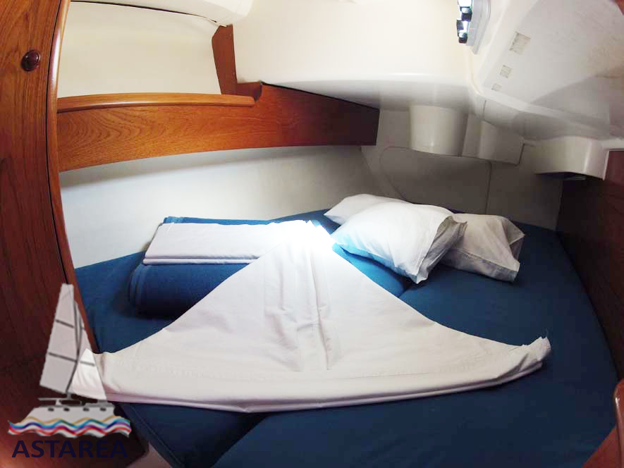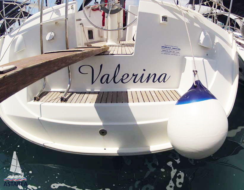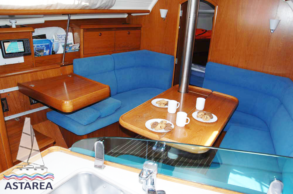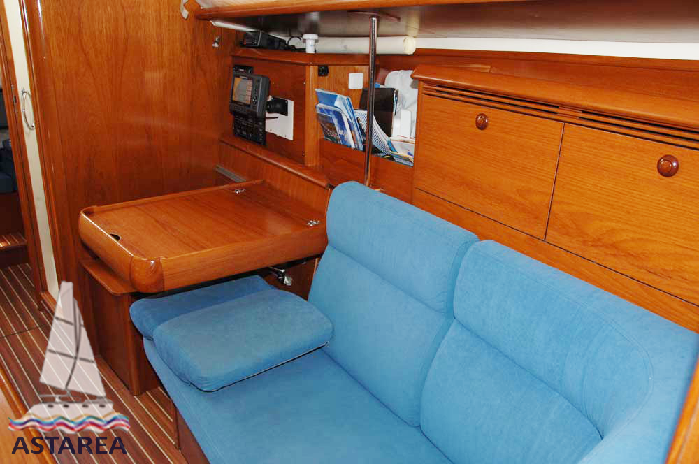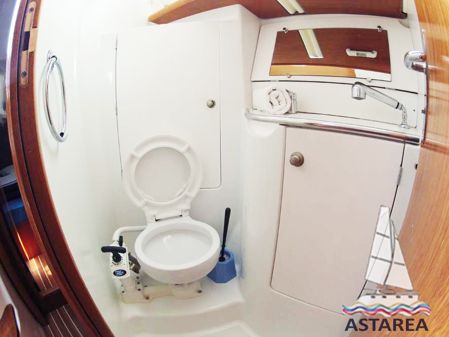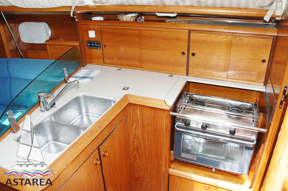 | Outside | 220 V-Landanschluss, Anker mit Kette, Biminitop, Bootshaken, Cockpitdusche, Cockpitlautsprecher, Cockpittisch, Deckbürste, elektr. Ankerwinsch, Fender, Festmacherleinen, Gangway, Sprayhood, Teak im Cockpit, Wasserschlauch, Windex |