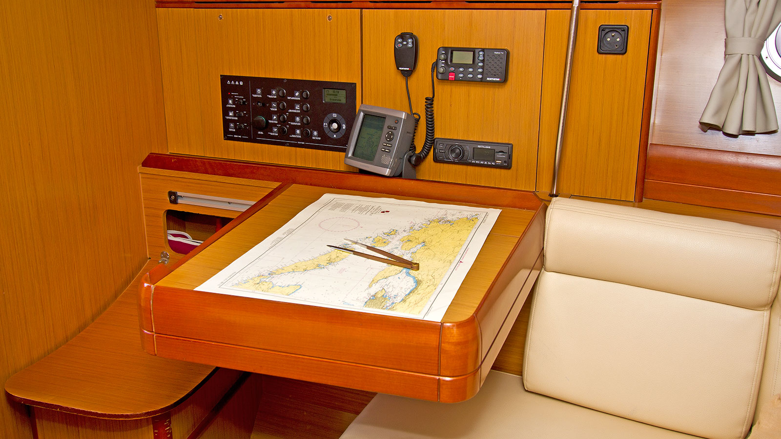 | Navigation | Barometer, Echolot, Fernglas, GPS mit Kartenplotter im Salon, Hafenhandbücher, Handpeilkompass, Kompass, Navigationsbesteck, Seekarten, Sumlog, Windmesser |