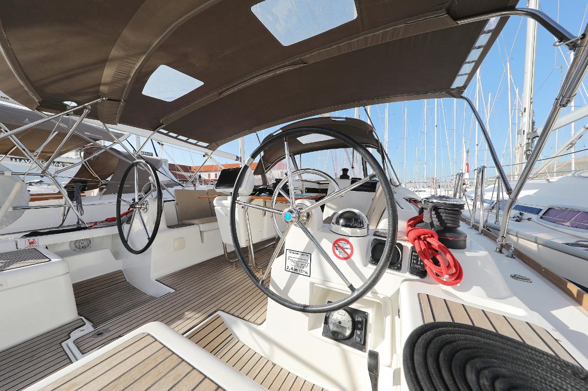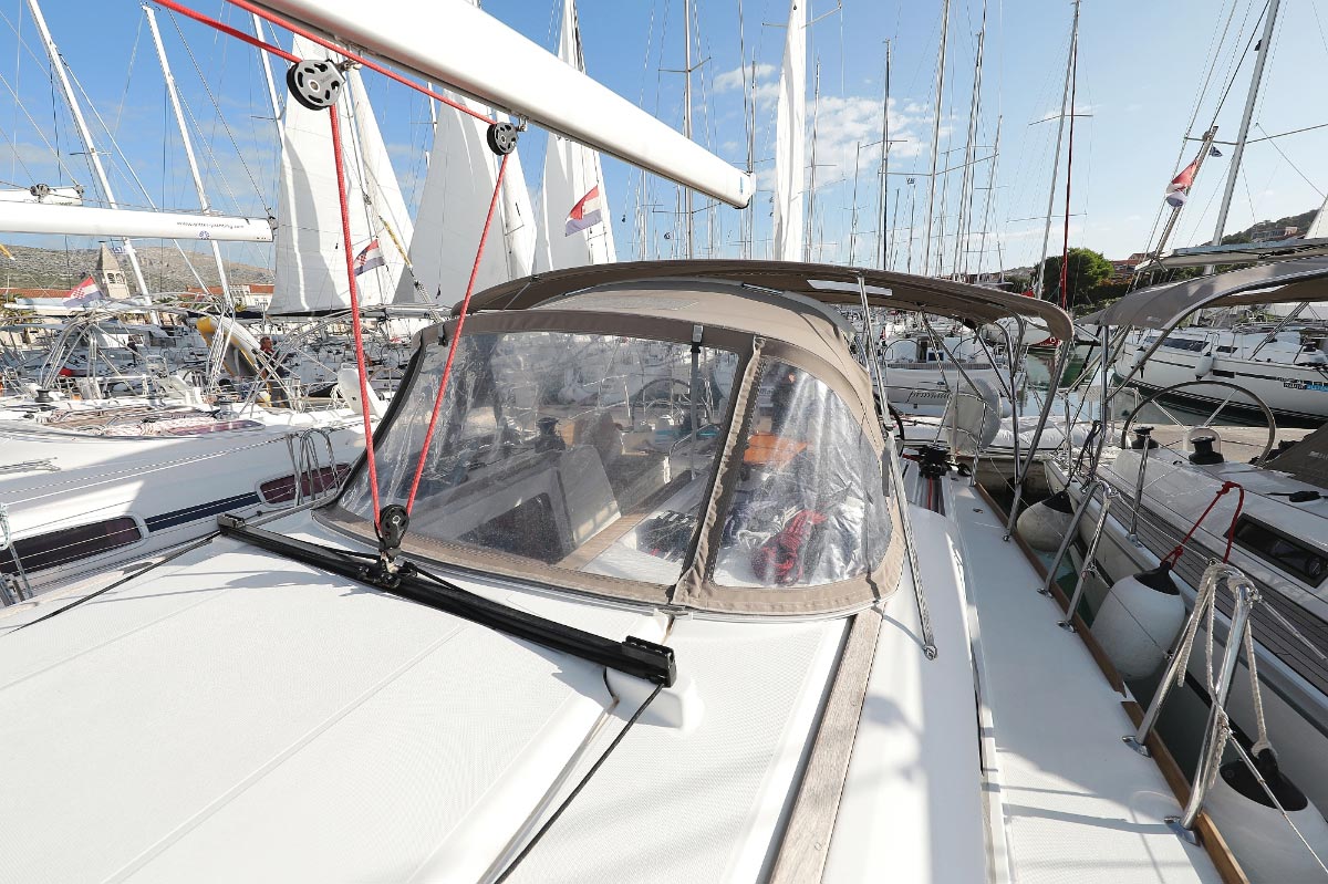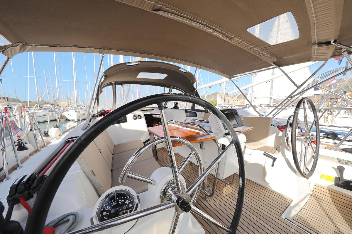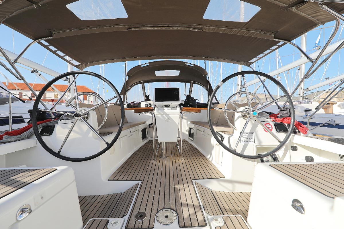 | Outside | Abnehmbarer Cockpittisch, Anker mit Kette, Ankerwinsch, Badeplattform, Biminitop, Bootshaken, Cockpitdusche, Cockpitpolster, elektr. Ankerwinsch, Fender, Festmacherleinen, Gangway, Kugelfender, Kunststoff-Eimer (Pütz), Solaranlage, Sprayhood, Teak im Cockpit, Wantenschneider, Wasserkanister , Wasserschlauch, Windex |
