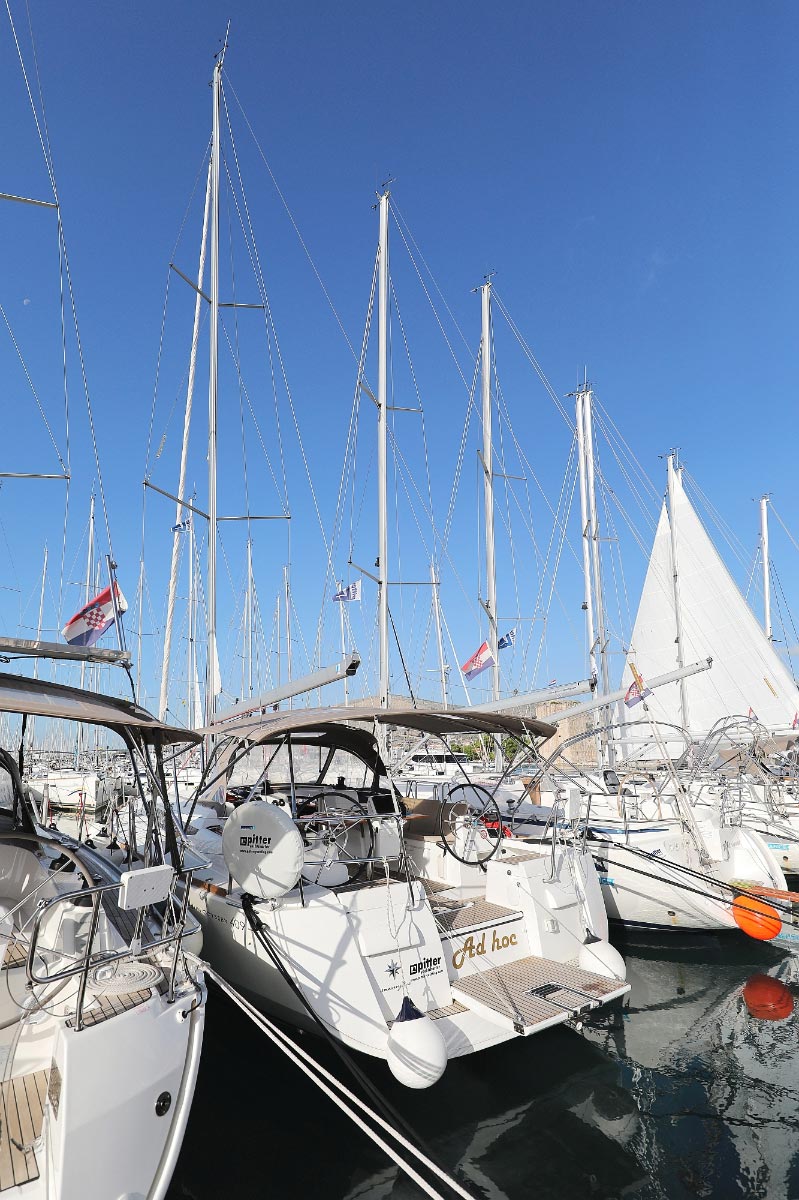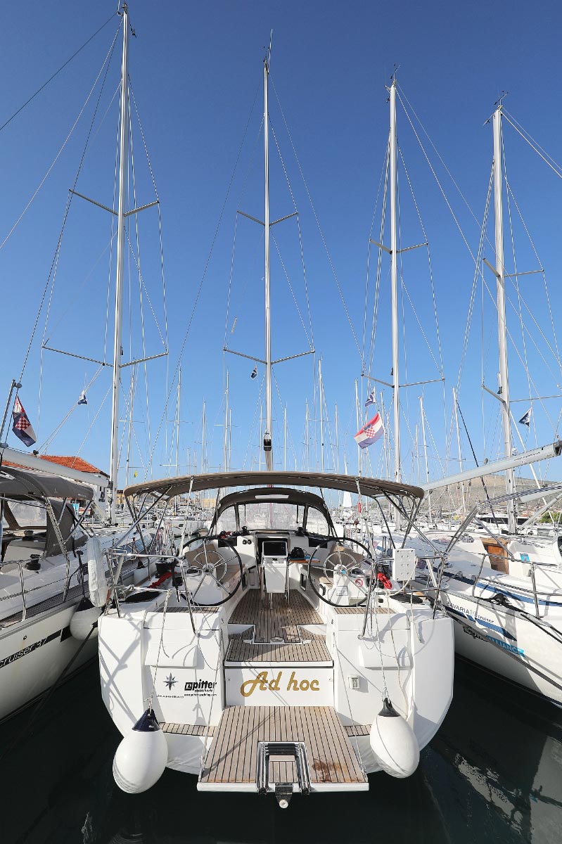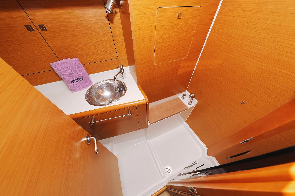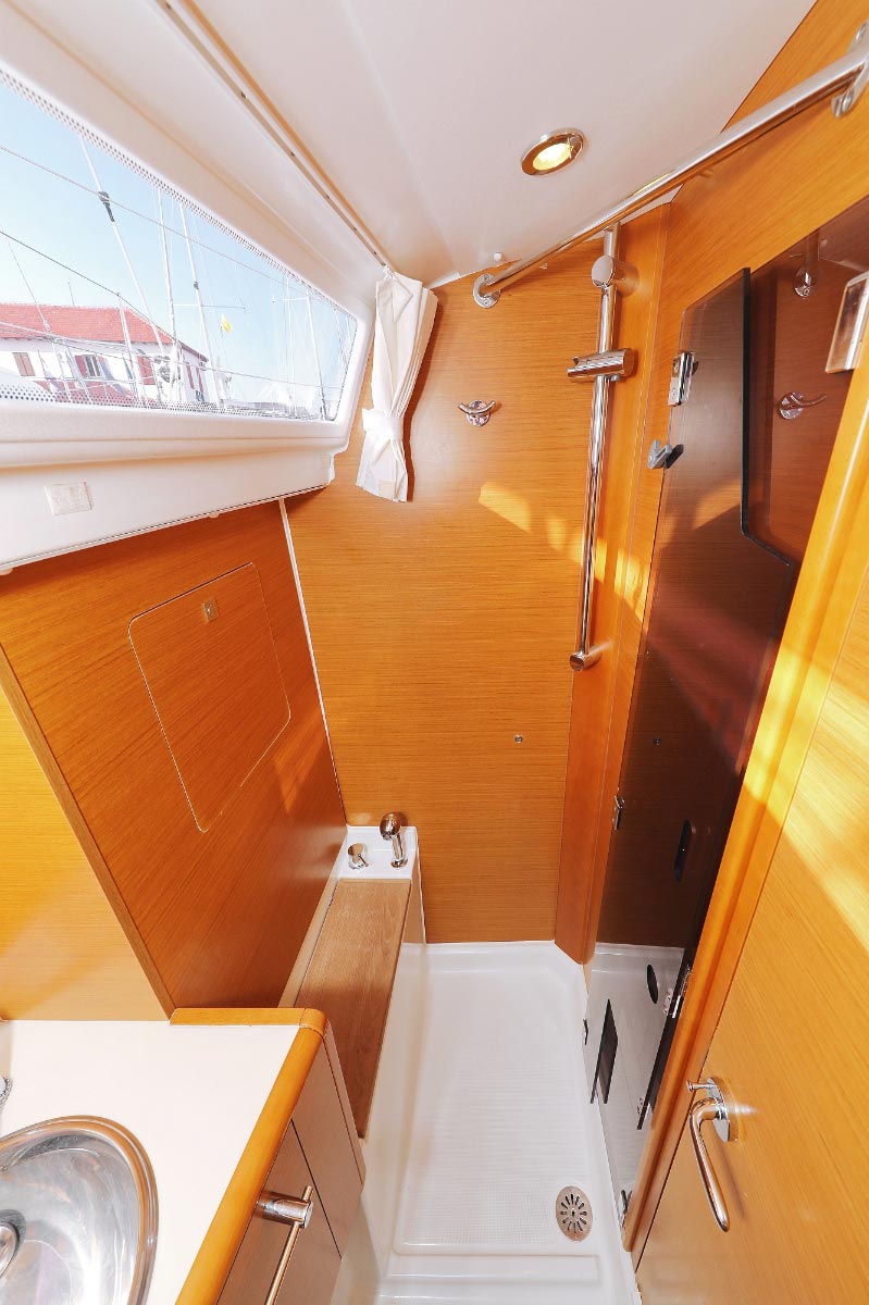 | Outside | Abnehmbarer Cockpittisch, Anker mit Kette, Ankerwinsch, Badeplattform, Biminitop, Bootshaken, Cockpitdusche, Cockpitpolster, elektr. Ankerwinsch, Fender, Festmacherleinen, Gangway, Kugelfender, Kunststoff-Eimer (Pütz), Solaranlage, Sprayhood, Teak im Cockpit, Wantenschneider, Wasserkanister , Wasserschlauch, Windex |