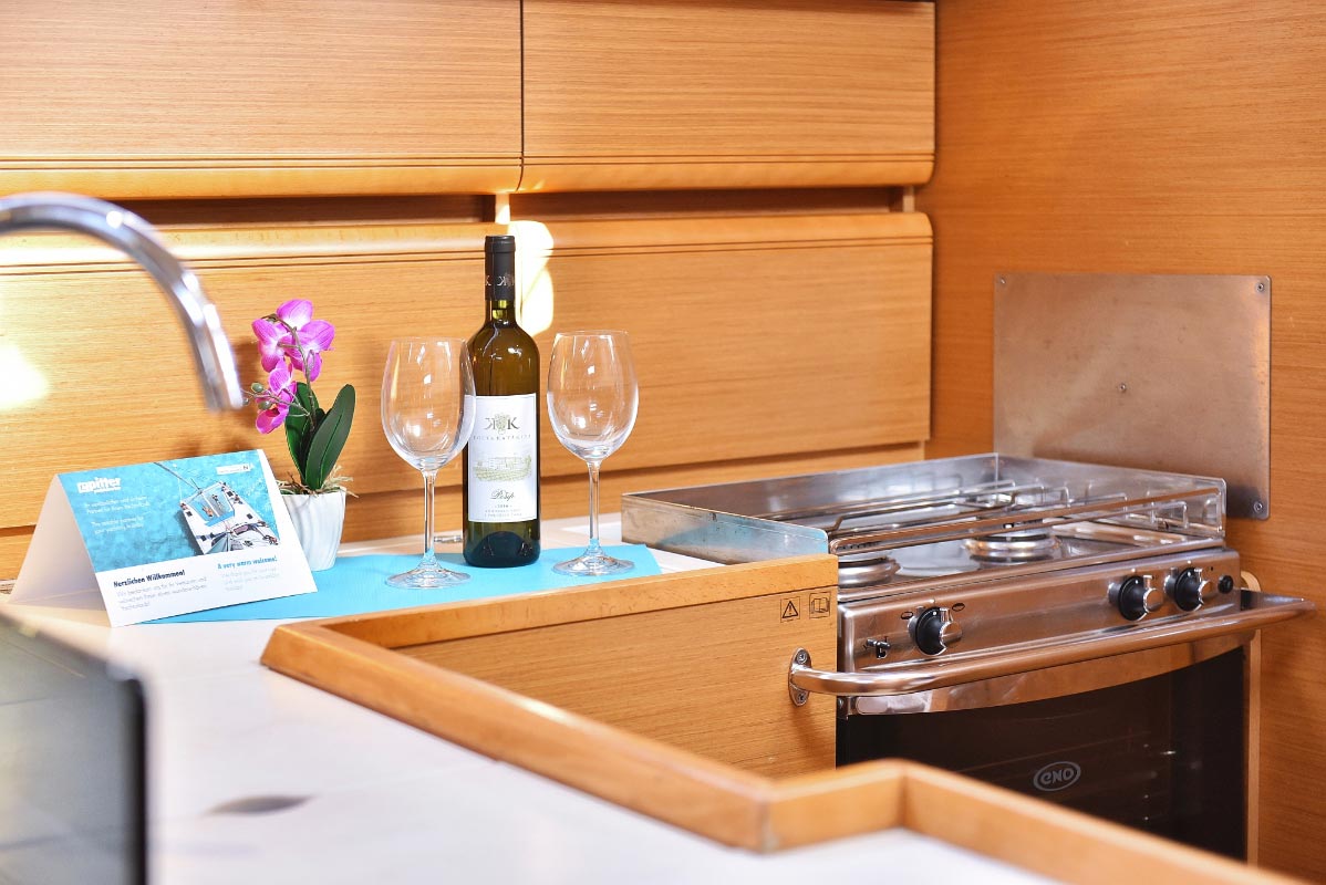 | Inside | 2. Kühlschrank, Borduhr, Dusche, Heizung, Inverter 12V/220V, Kühlschrank mit Gefrierfach, Ladegerät, Luftpumpe für Beiboot, Nespresso-Maschine, Pantryausstattung, Radio mit USB und Bluetooth, Warmwasser |