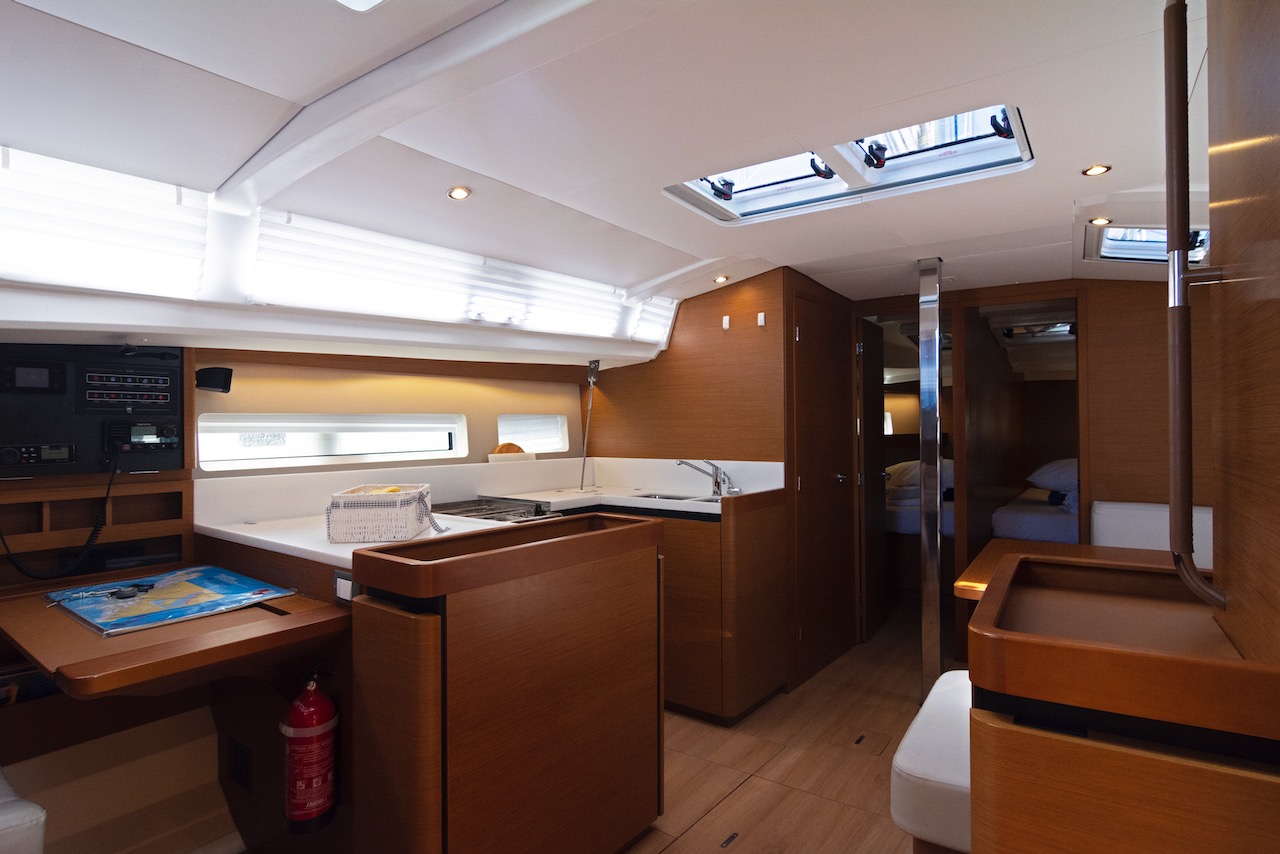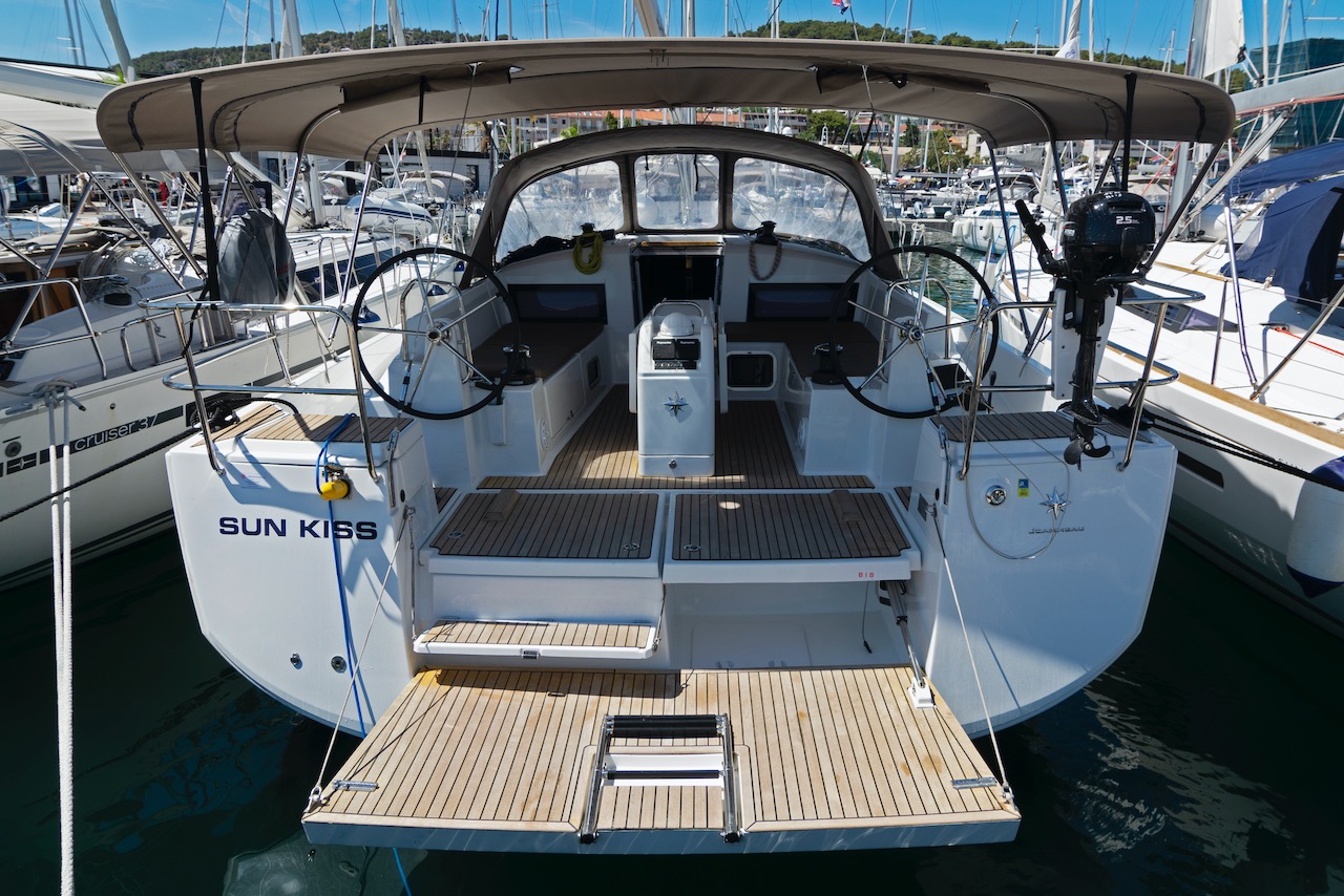 | Outside | 220 V-Landanschluss, Anker mit Kette, Ankerkettenzähler, Badeplattform, Biminitop, Cockpitdusche, Cockpitpolster, Cockpittisch, elektr. Ankerwinsch, elektr. Winsch, Fender, Festmacherleinen, Sprayhood, Wantenschneider, Windex |