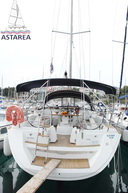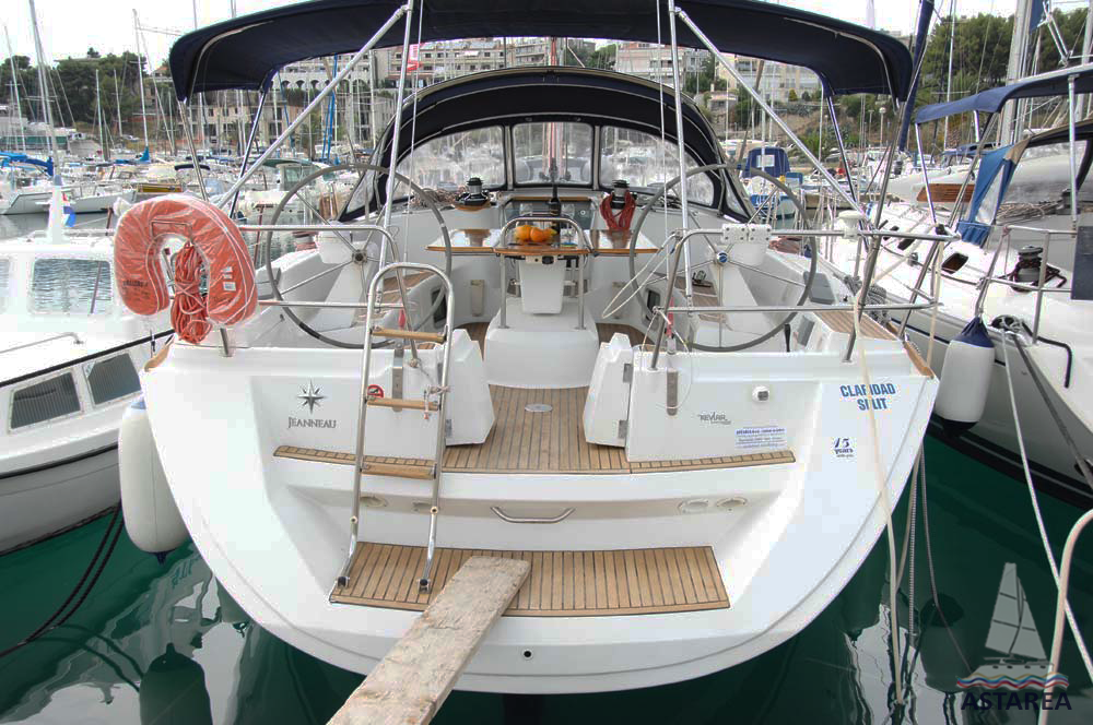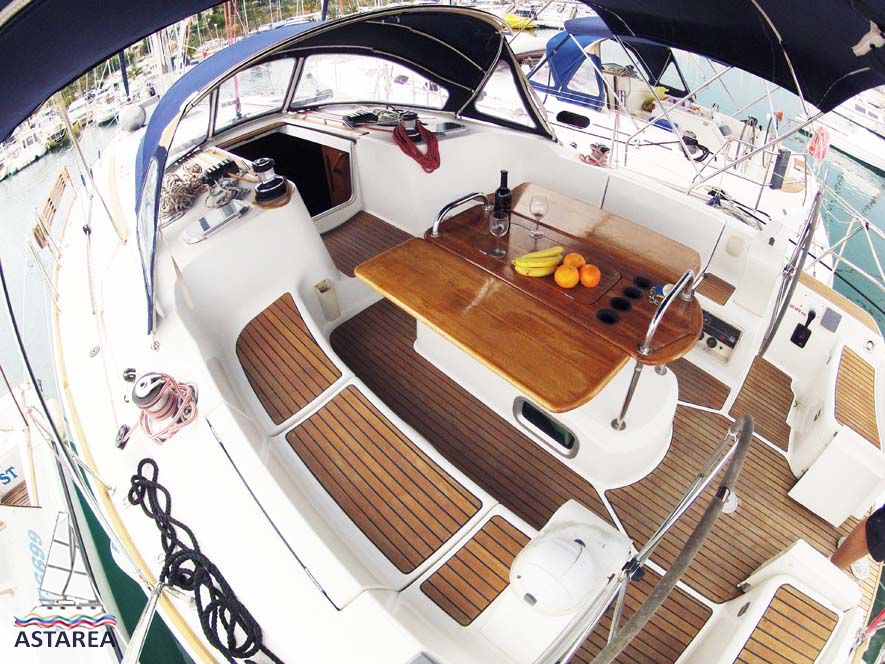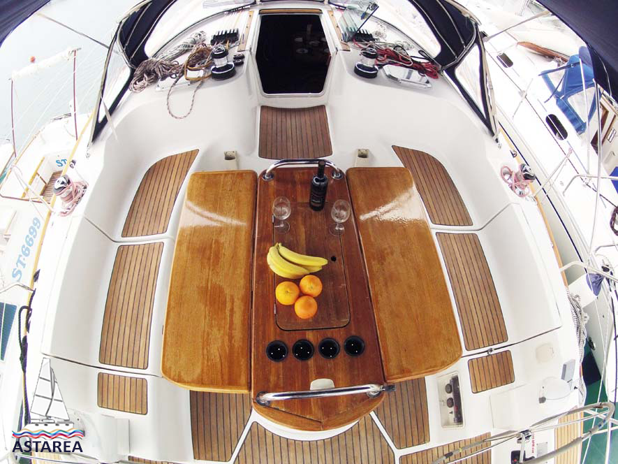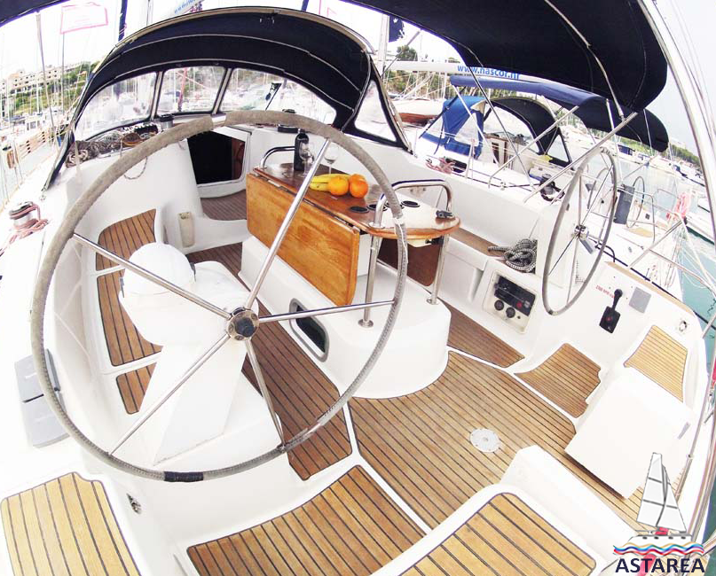 | Outside | 220 V-Landanschluss, Anker mit Kette, Biminitop, Bootshaken, Cockpitdusche, Cockpitlautsprecher, Cockpitpolster, Cockpittisch, Deckbürste, elektr. Ankerwinsch, elektr. Winsch, Fender, Festmacherleinen, Gangway, Sprayhood, Teak im Cockpit, Wasserschlauch, Windex |