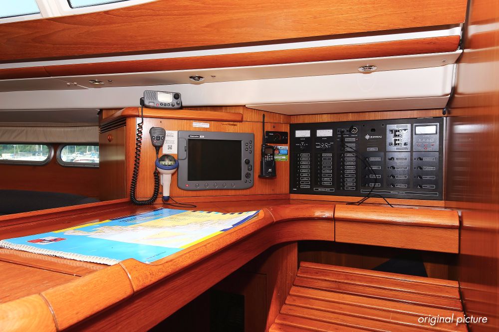 | Navigation | Barometer, Fernglas, GPS mit Kartenplotter, Hafenhandbücher, Handpeilkompass, Navigationsbesteck, Radar, Seekarten, Tridata (Log, Echolot, Windm.) |