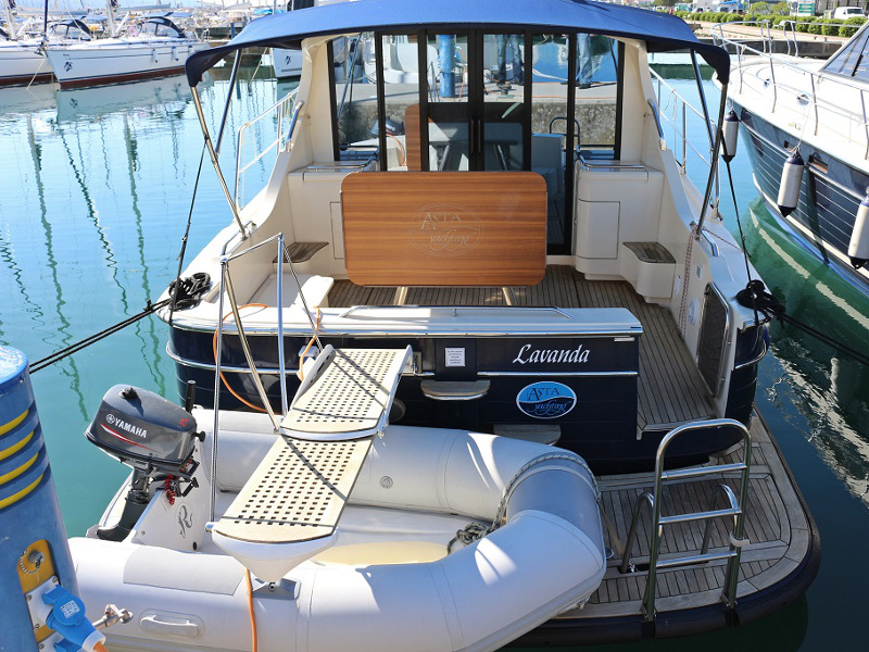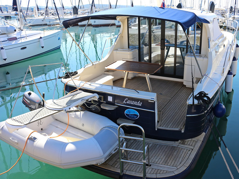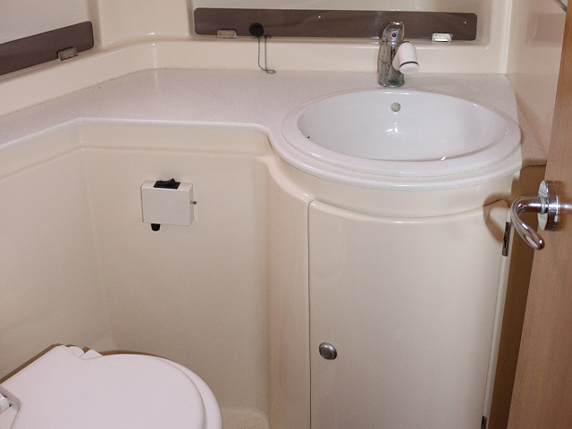 Outside Badeplattform, Bootshaken, Buganker, Cockpitdusche, Cockpittisch, Deckbürste, Dieselkanister , Eimer mit Seil, elektr. Ankerwinsch, Fender, Festmacherleinen, Solaranlage, Wasserschlauch