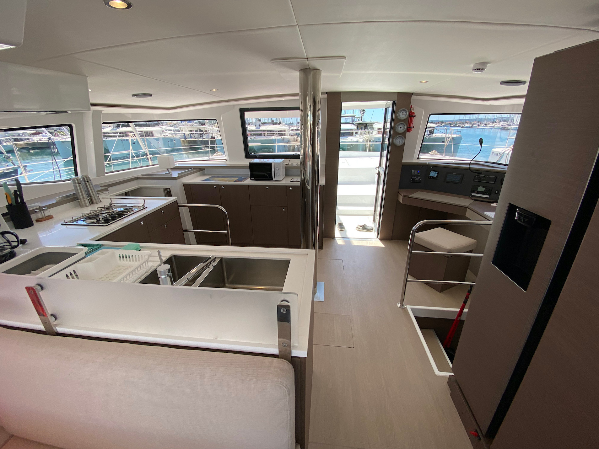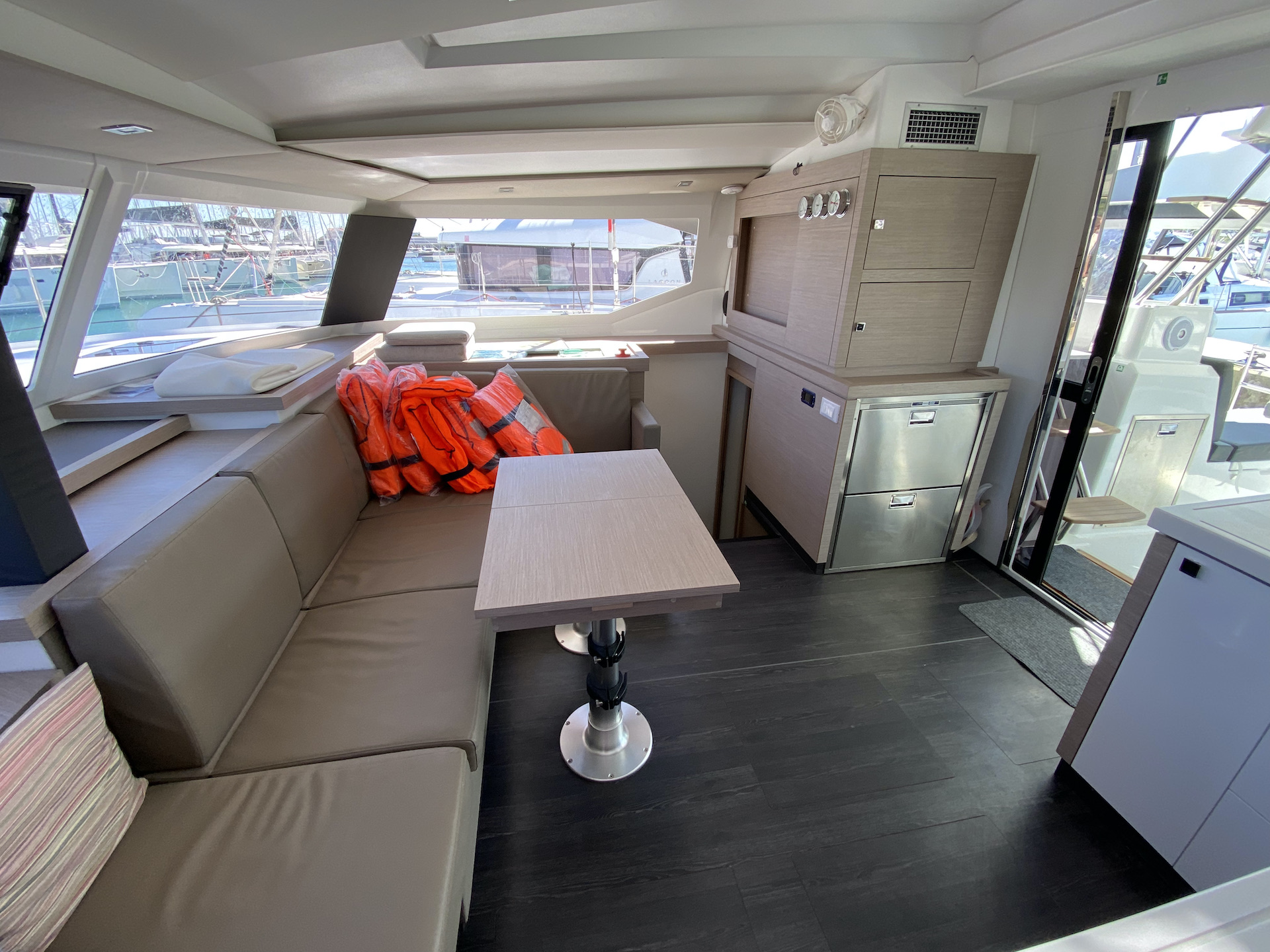 | Inside | Eiswürfelmaschine, Espresso Maschine, Gasherd mit Backofen, Generator, Inverter 12V/220V, Kaffeemaschine, Klimaanlage (ohne Landstrombedarf), Kühlschrank, Radio mit USB und Bluetooth, Salontisch absenkbar, Warmwasser, Watermaker |