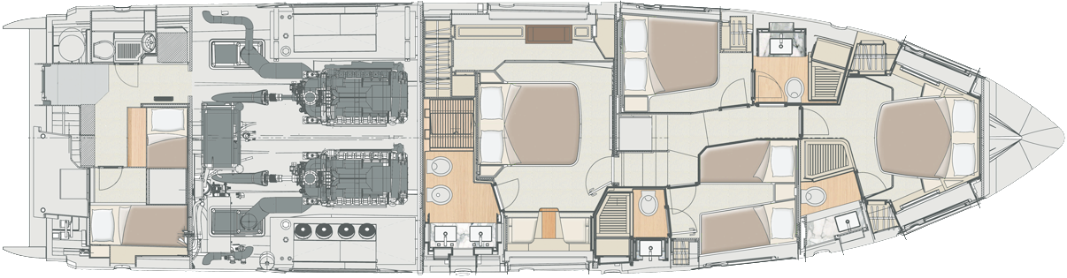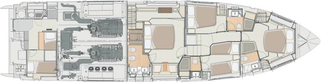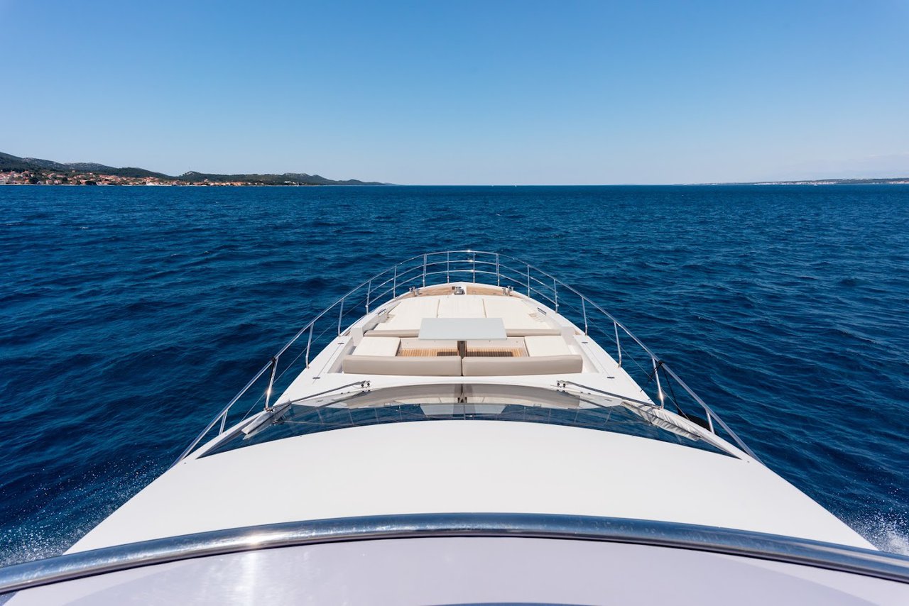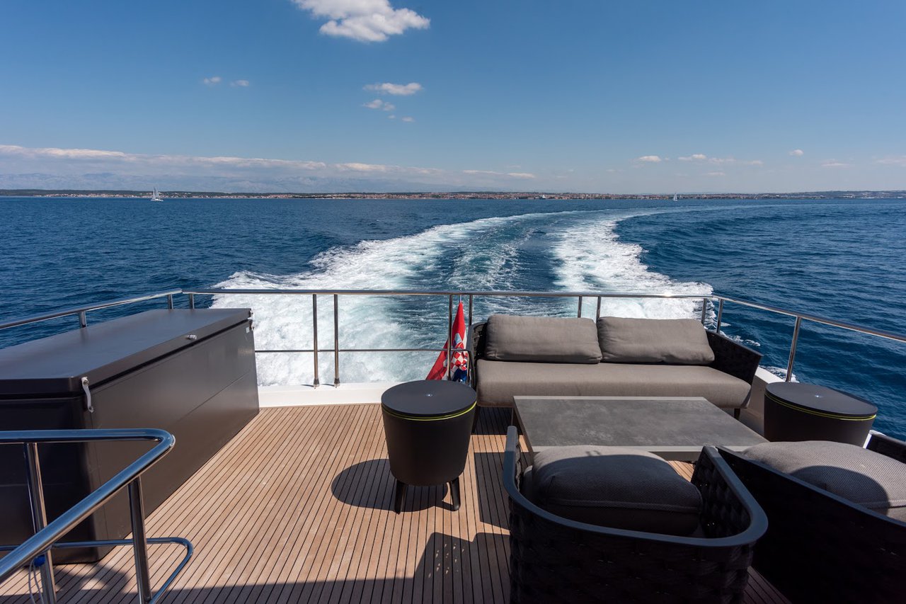 | Outside | Anker mit Kette, Ankerkettenzähler, Badeplattform (hydr.), Biminitop, Cockpitdusche warm/kalt, Cockpitkühlschrank, Cockpittisch absenkbar, Flybridge, hydraul. Gangway, Sonnendeck, Sonnensegel, Teak auf Badeplattform, Teak im Cockpit, Teakdeck, Unterwasserbeleuchtung, Wet Bar |