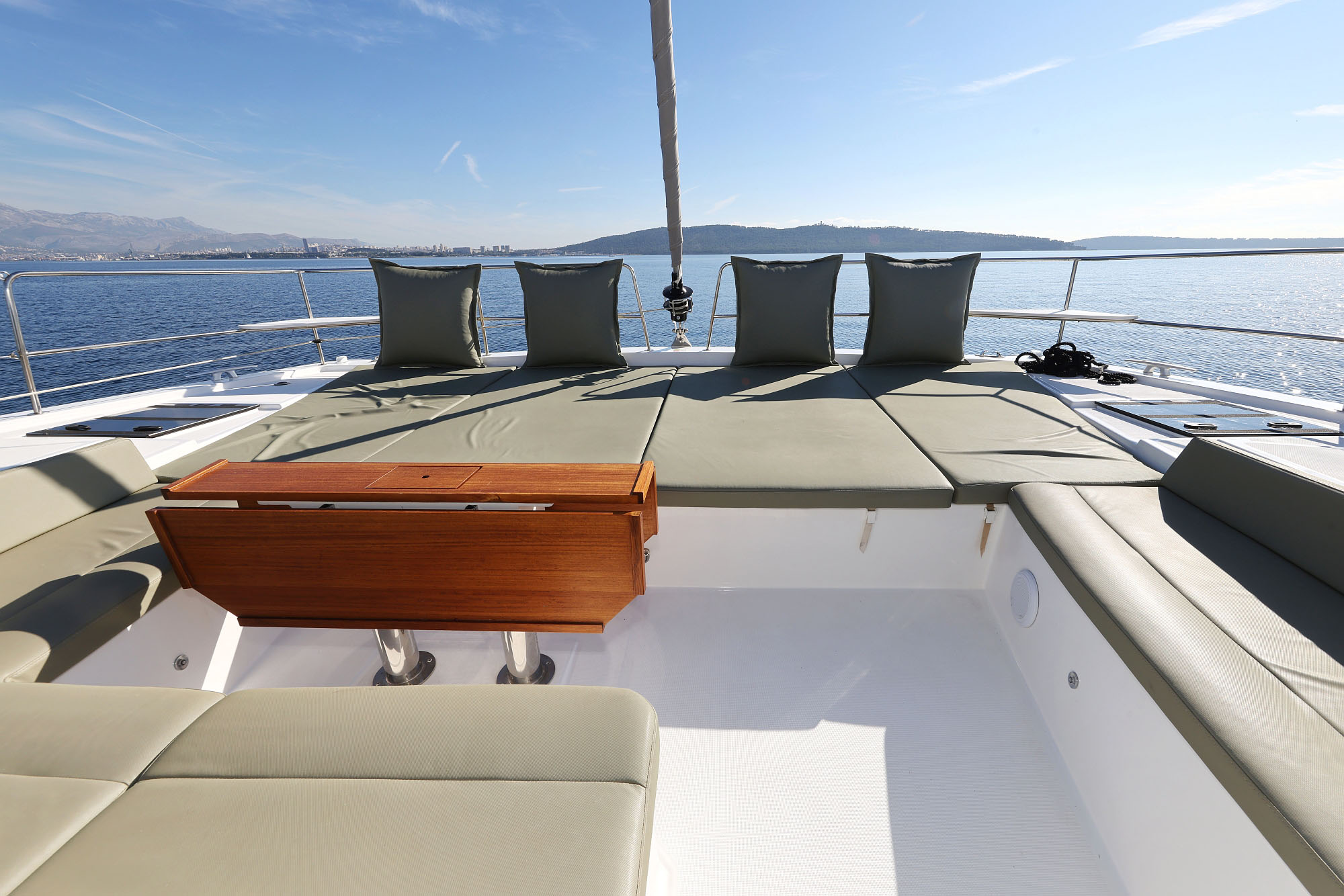 | Outside | Badeplattform, Biminitop, Cockpitdusche, Cockpitpolster, Cockpittisch, Deckpolster, Flybridge, Grill, HiFi Lautsprecher auf Flybridge, Polster auf Flybridge, Solaranlage, Teak im Cockpit |