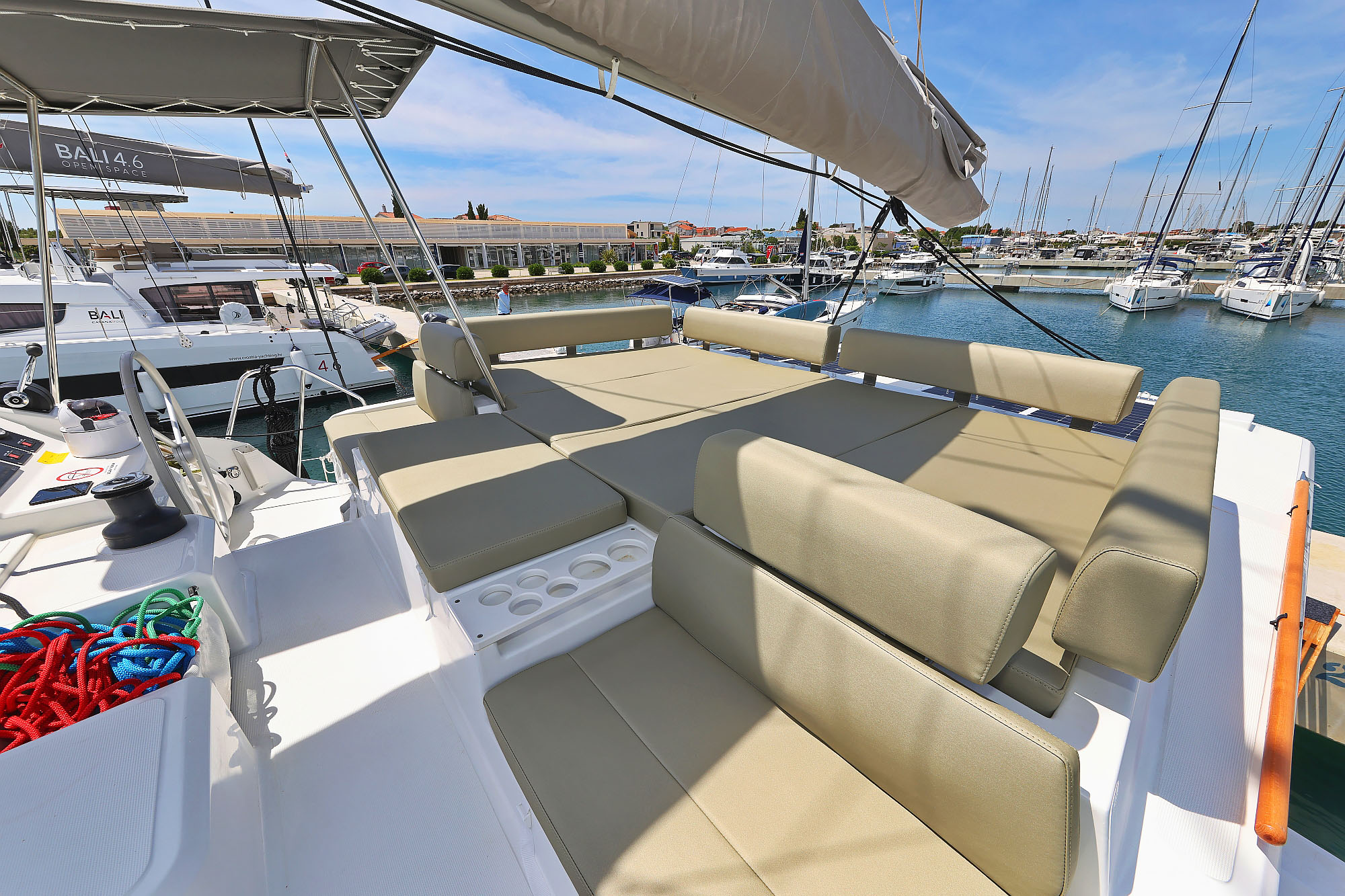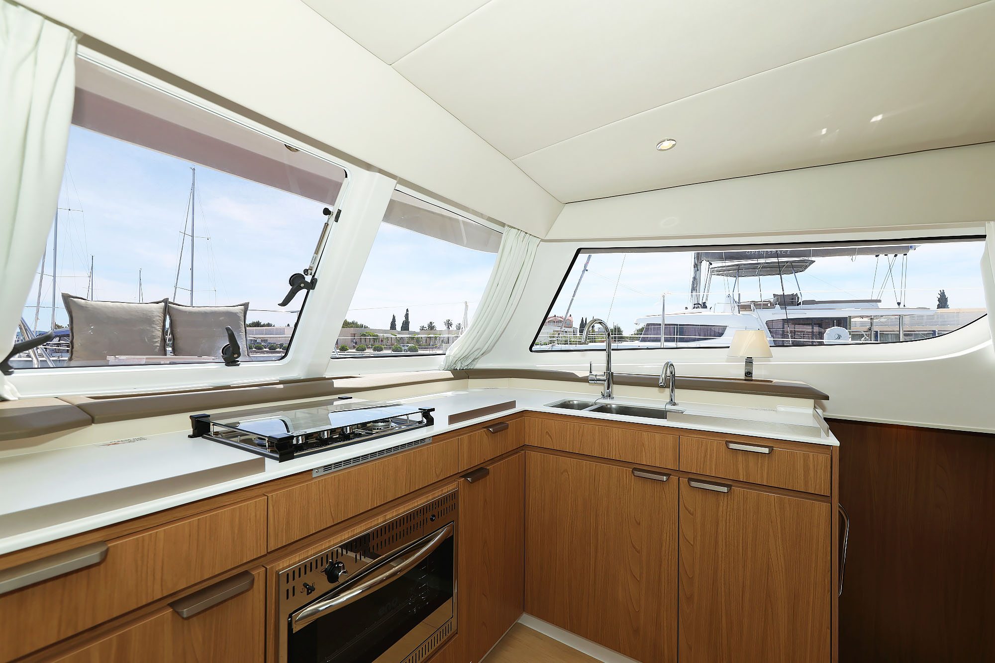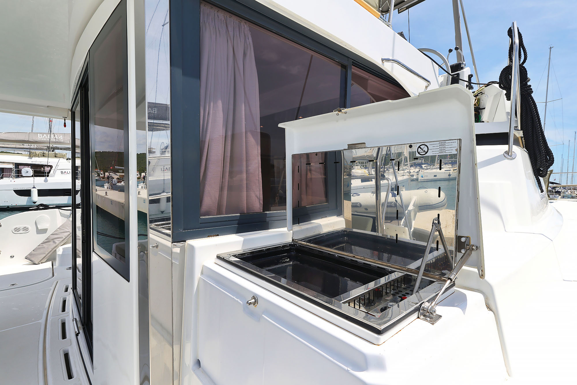 | Inside | Backofen, FUSION Sound System, Gasherd, Gefrierschrank, Generator, Heizung, Inverter 12V/220V, Klimaanlage, Kühlschrank, Ladegerät, Lautsprecher in Salon und Cockpit, Pantryausstattung, Radio mit MP3 , Salontisch absenkbar, Ventilatoren in Kabinen, Warmwasser, Watermaker, WC (elektr.) |