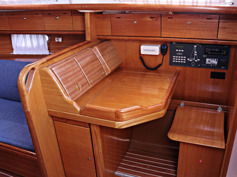 | Navigation | Barometer, Echolot, Fernglas, GPS mit Kartenplotter im Cockpit, Hafenhandbücher, Handpeilkompass, Kompass, Navigationsbesteck, Seekarten, Sumlog, Windmesser |
