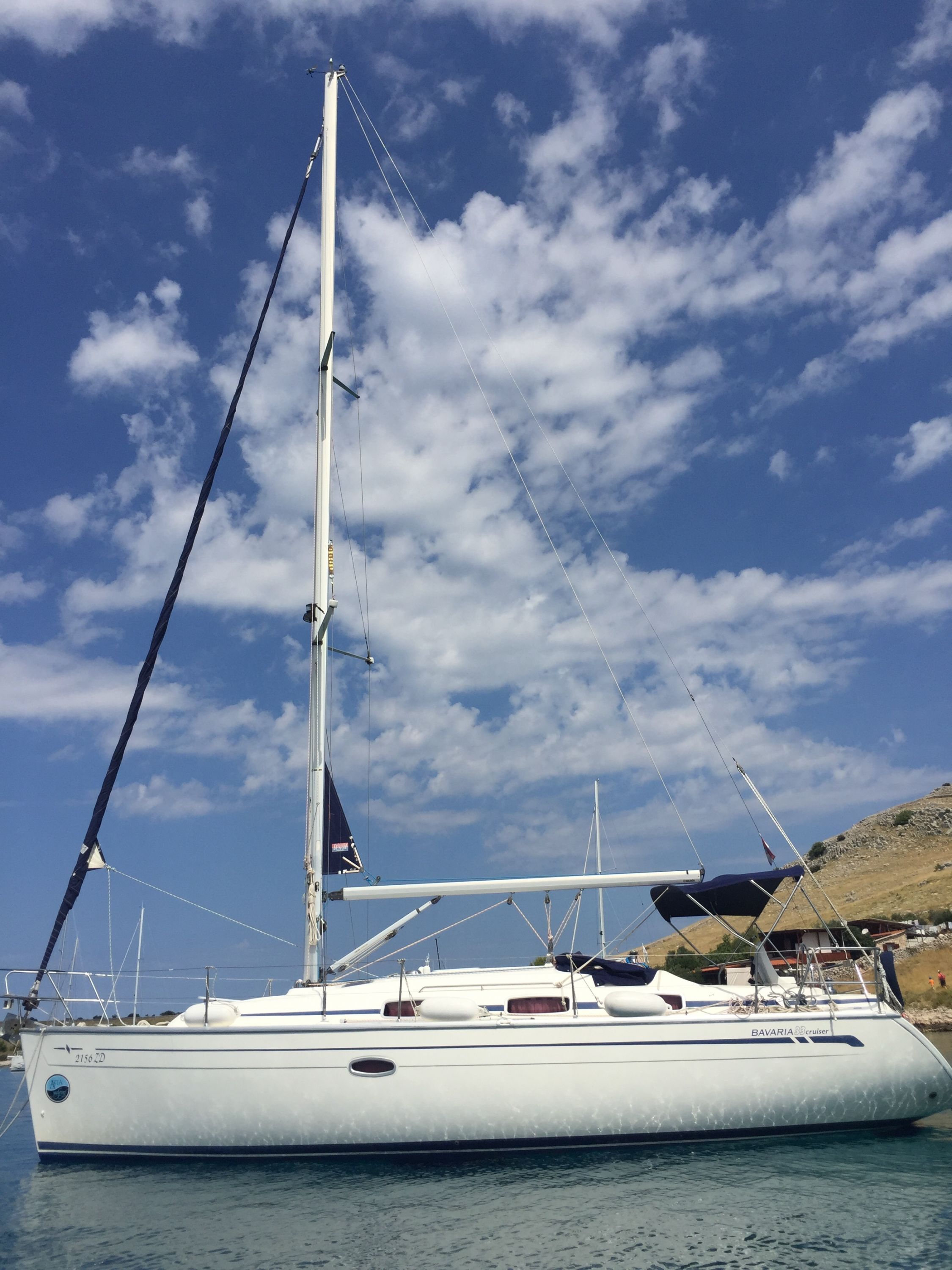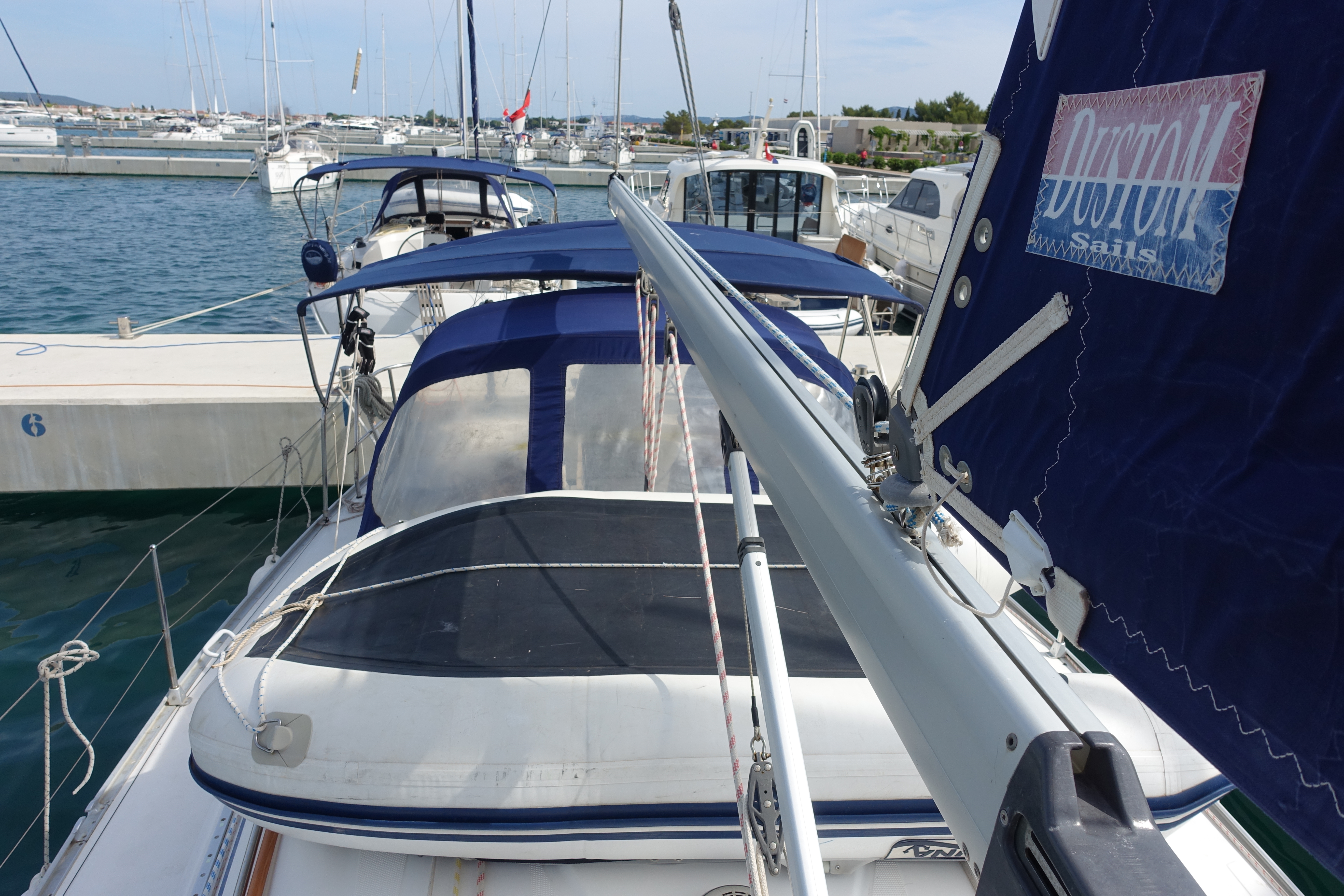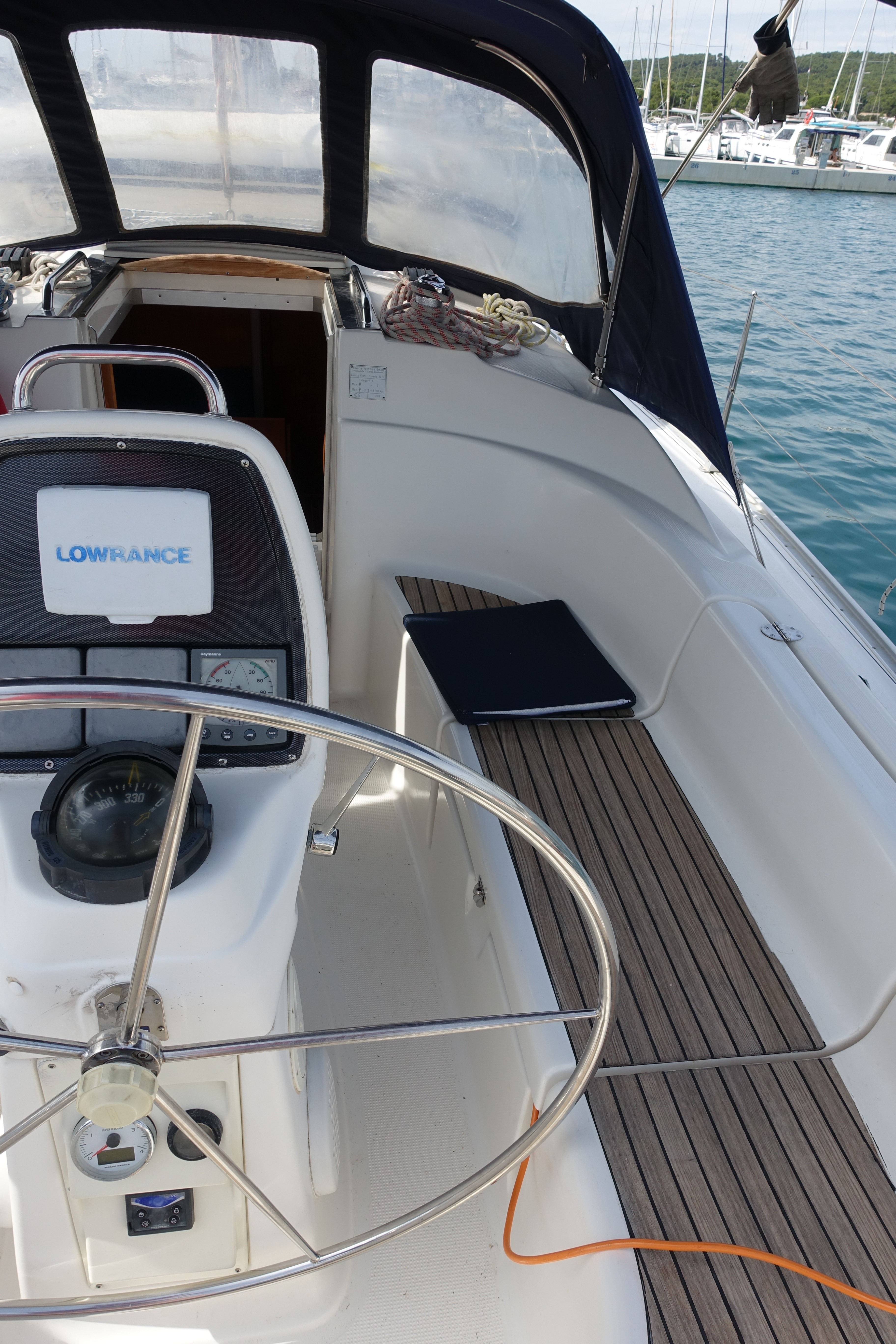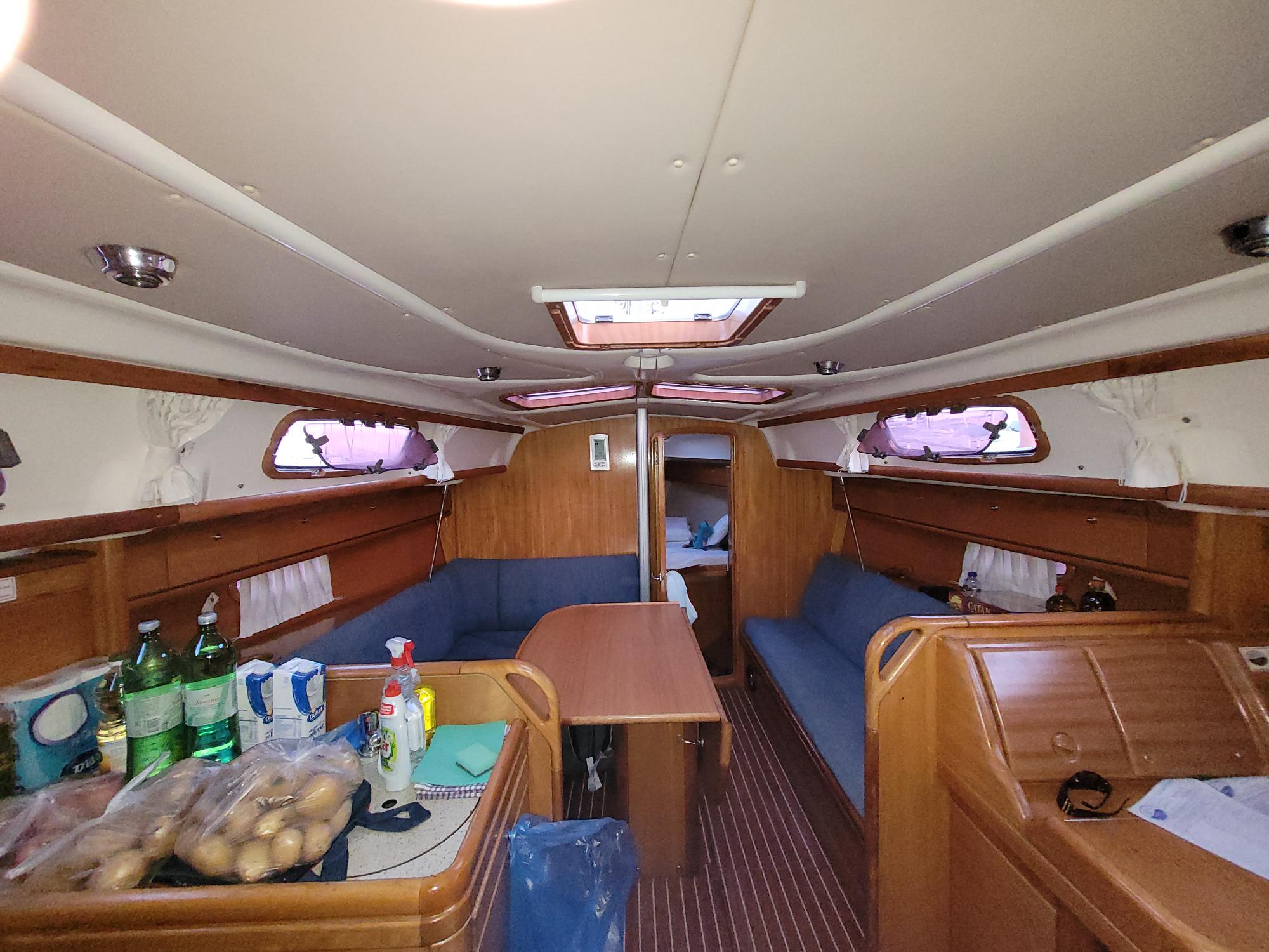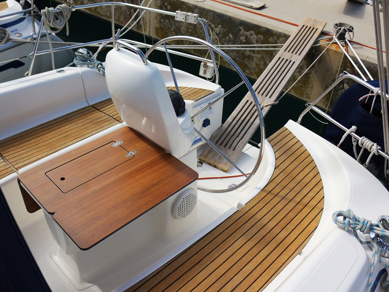 | Outside | Biminitop, Bootshaken, Buganker, Cockpitdusche, Cockpittisch, Deckbürste, Dieselkanister , Eimer mit Seil, elektr. Ankerwinsch, Fender, Festmacherleinen, Gangway, Sprayhood, Wasserschlauch, Winschen |