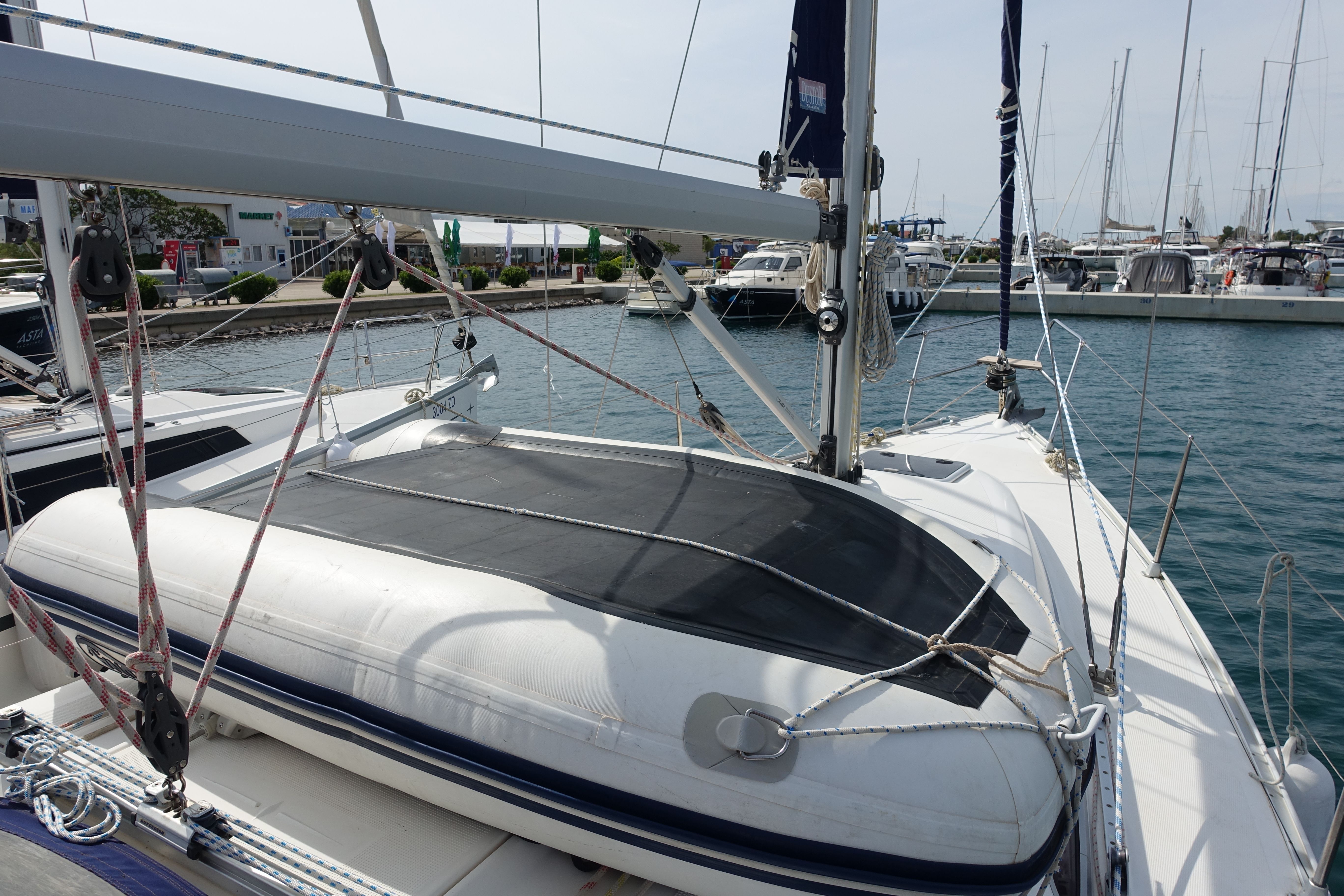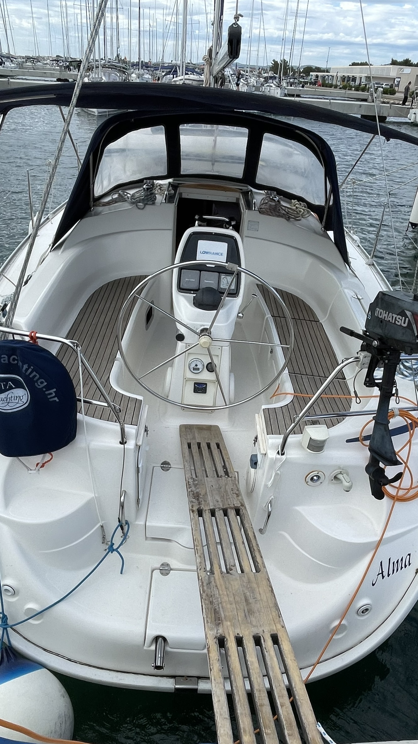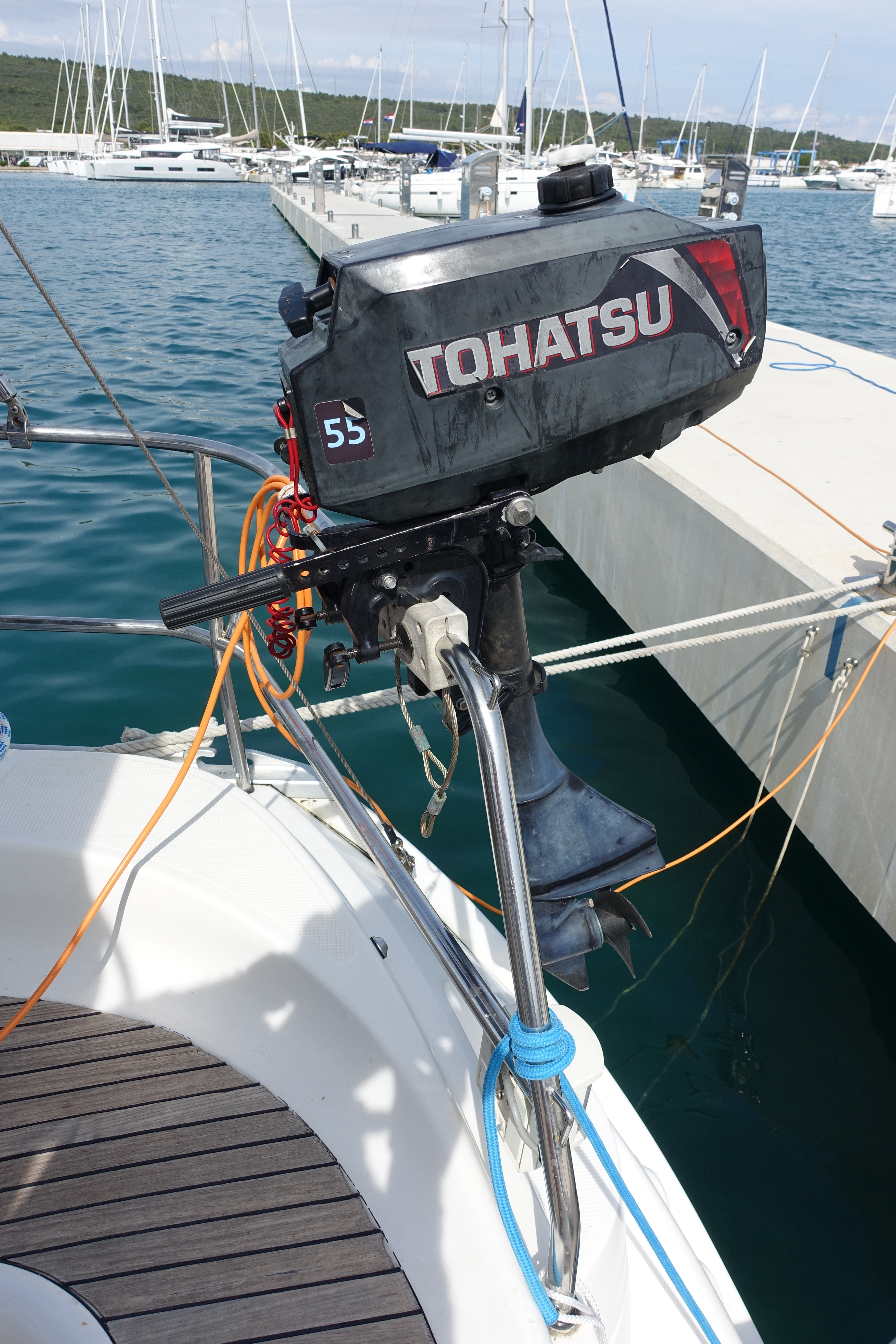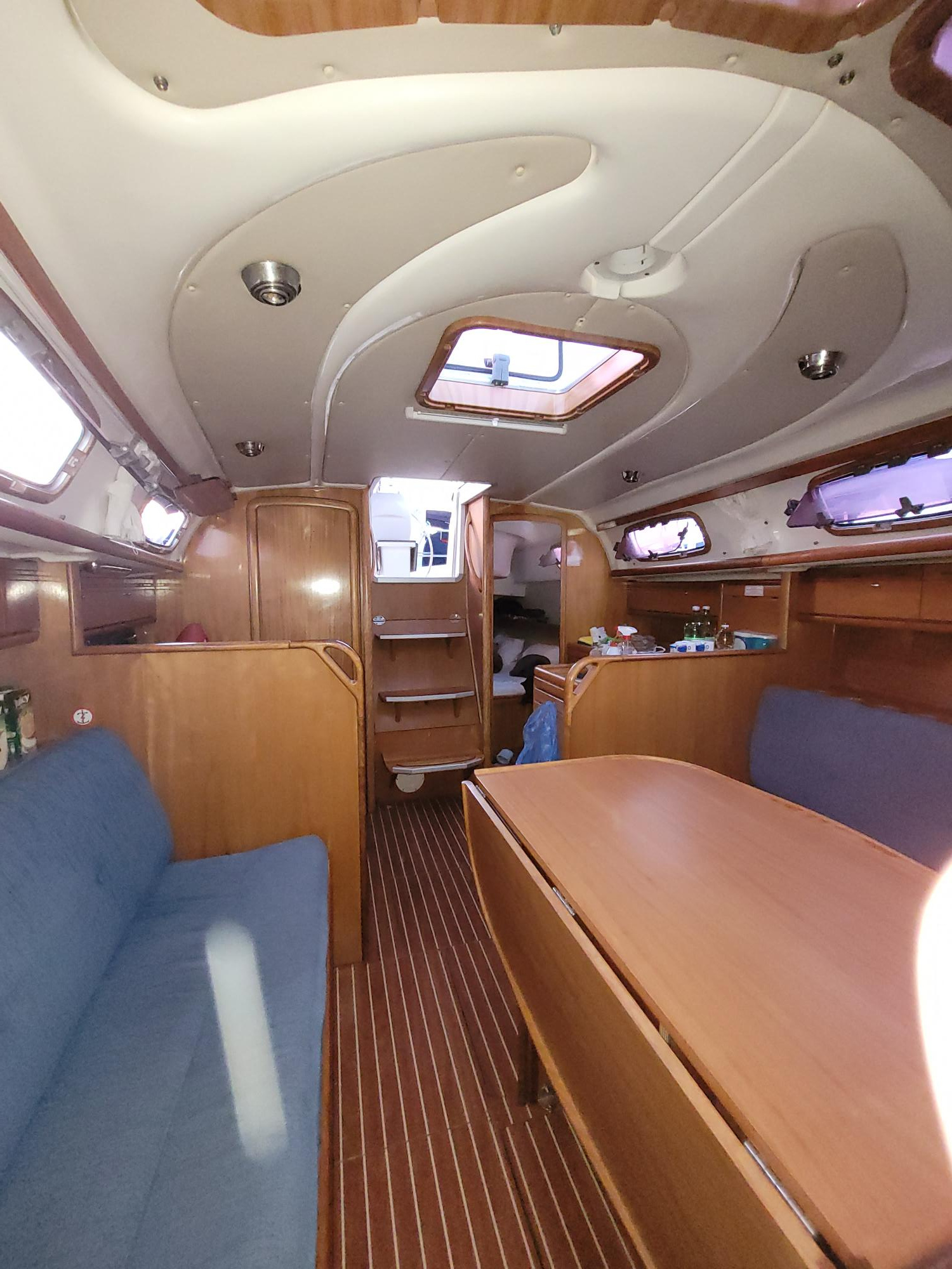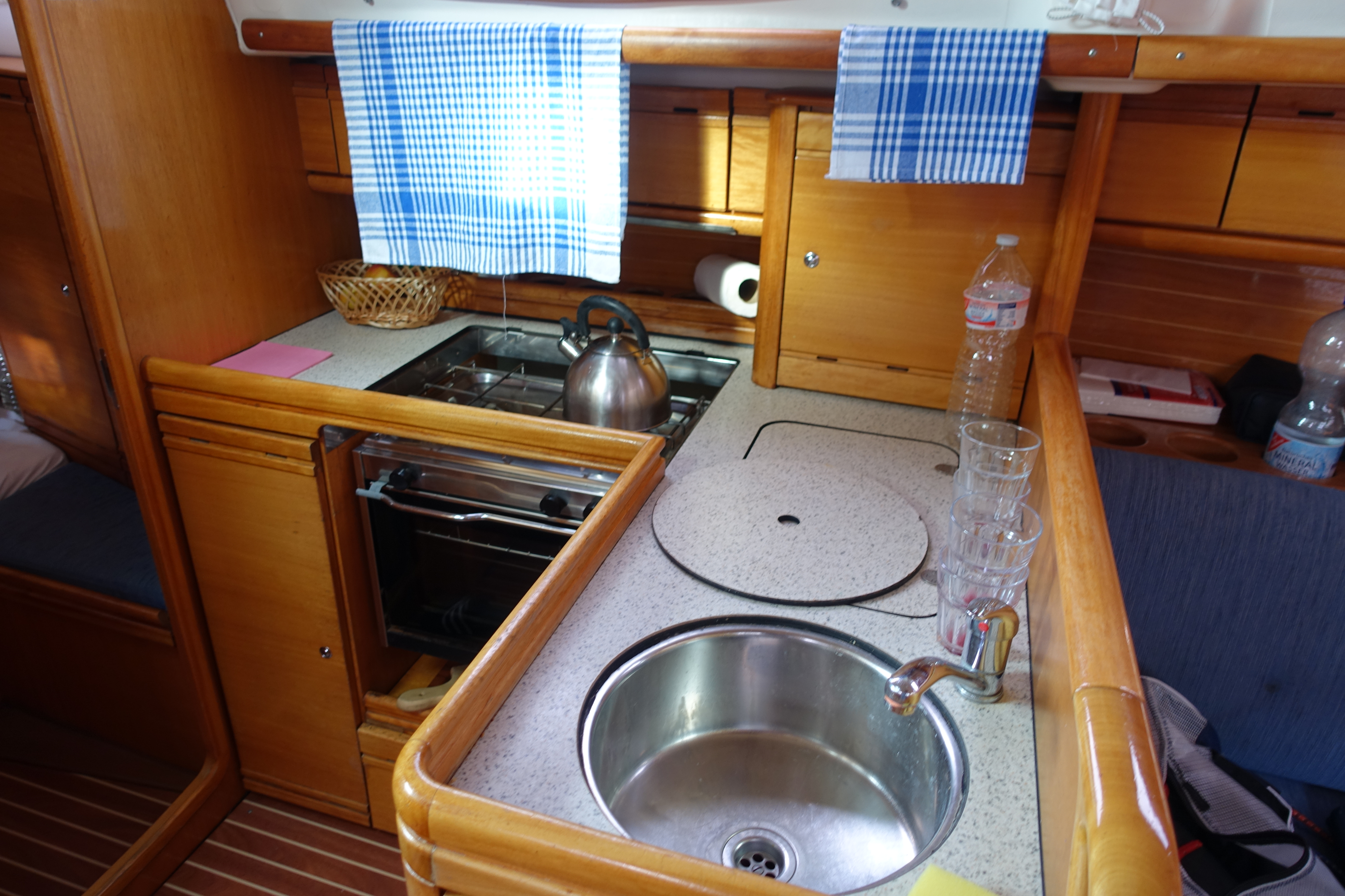 | Outside | Biminitop, Bootshaken, Buganker, Cockpitdusche, Cockpittisch, Deckbürste, Dieselkanister , Eimer mit Seil, elektr. Ankerwinsch, Fender, Festmacherleinen, Gangway, Sprayhood, Wasserschlauch, Winschen |
