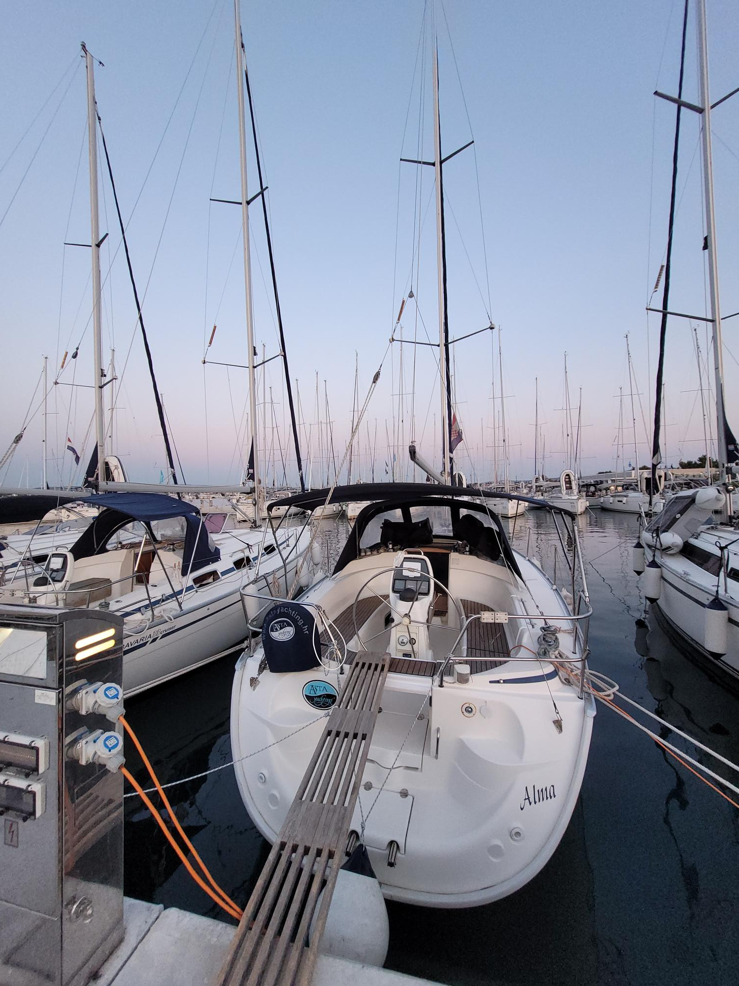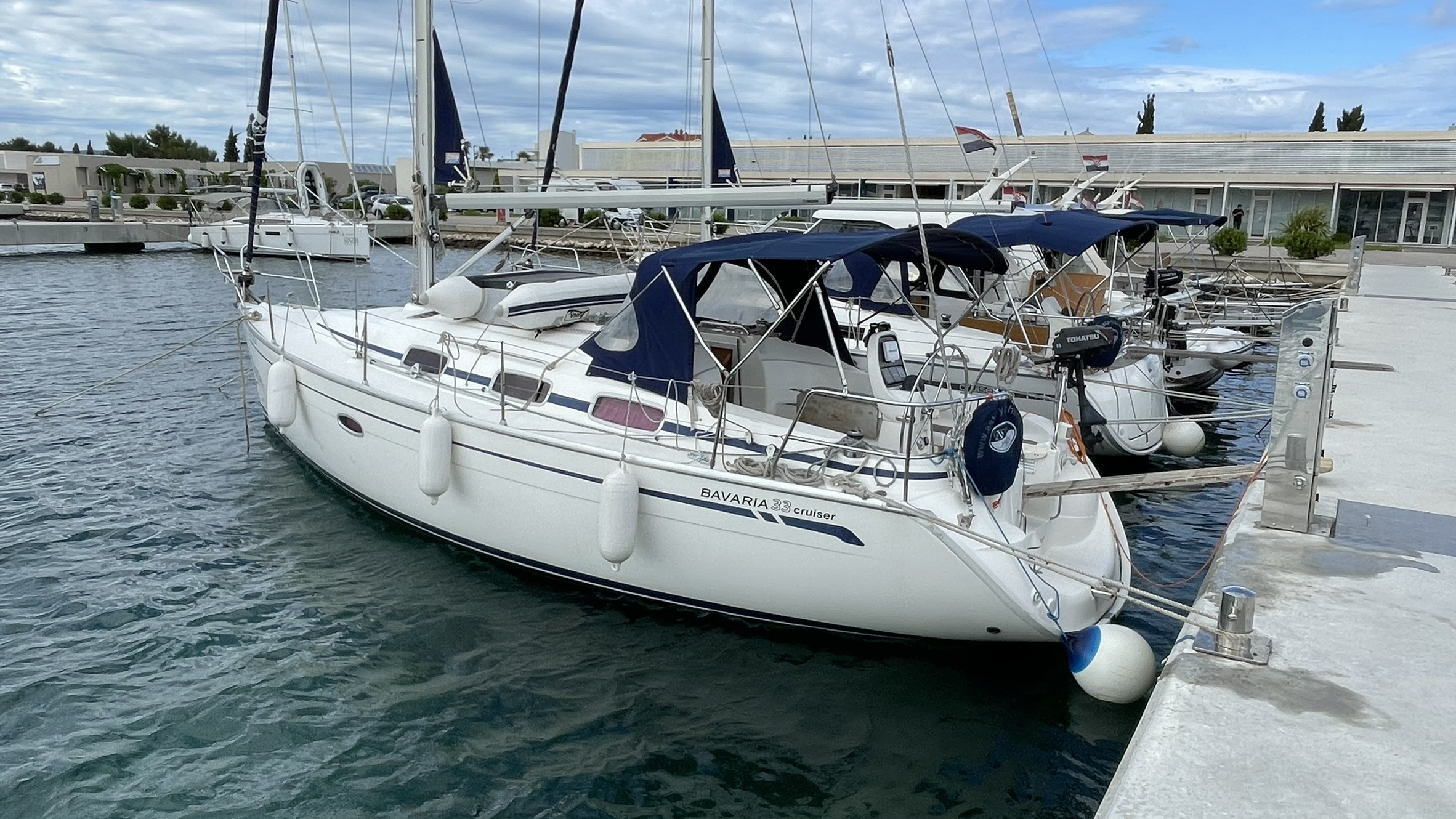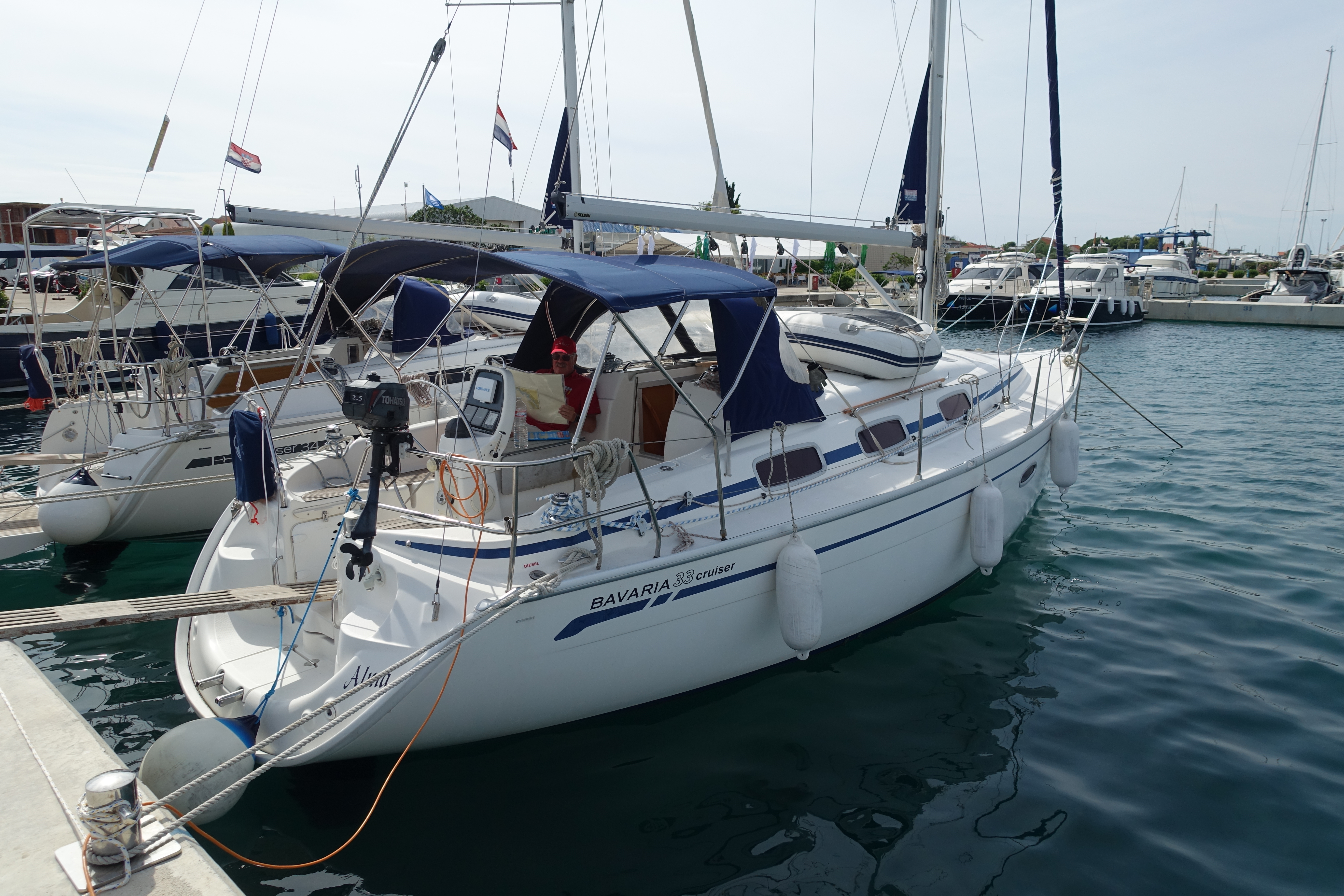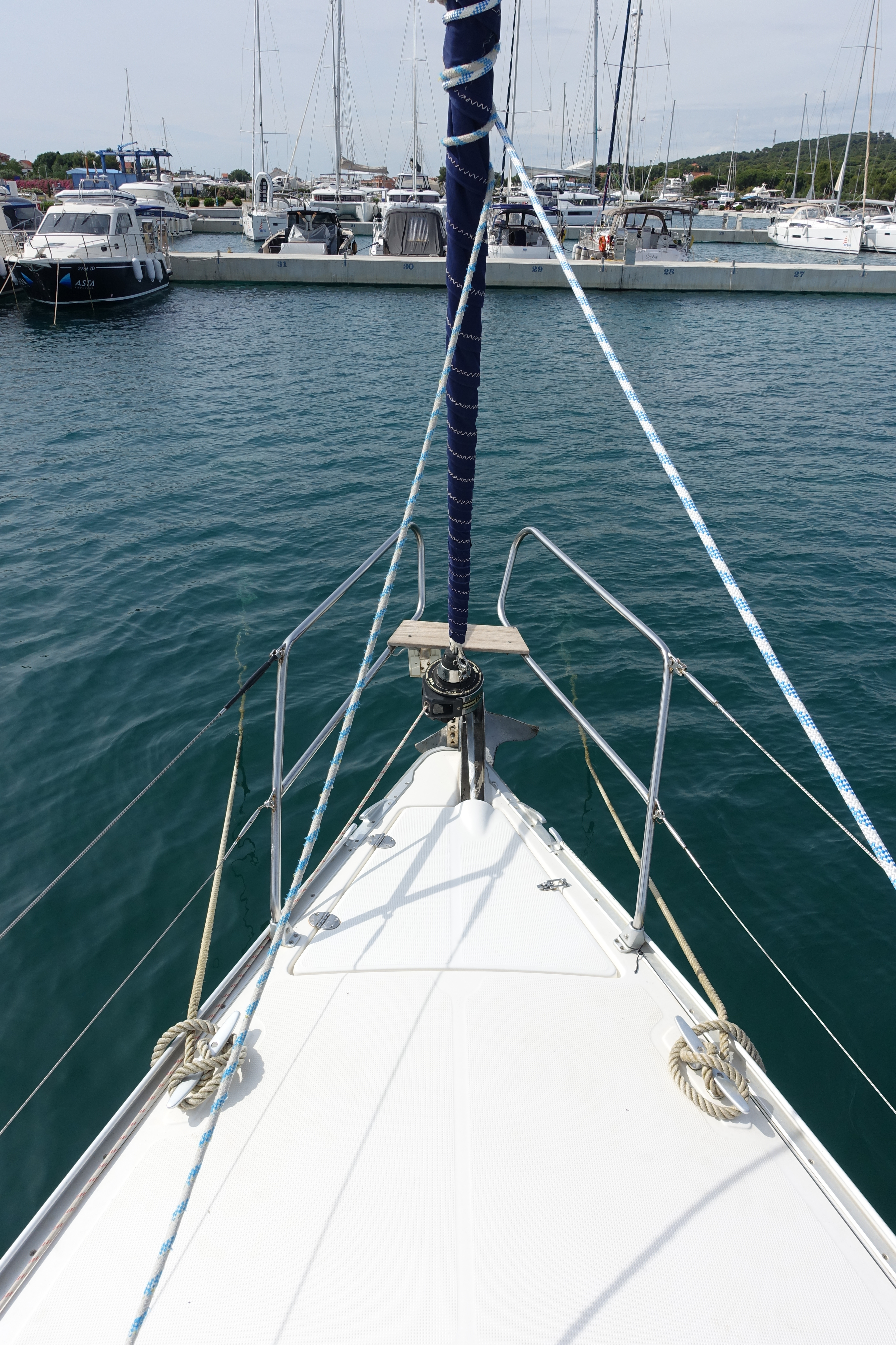 | Outside | Biminitop, Bootshaken, Buganker, Cockpitdusche, Cockpittisch, Deckbürste, Dieselkanister , Eimer mit Seil, elektr. Ankerwinsch, Fender, Festmacherleinen, Gangway, Sprayhood, Wasserschlauch, Winschen |
