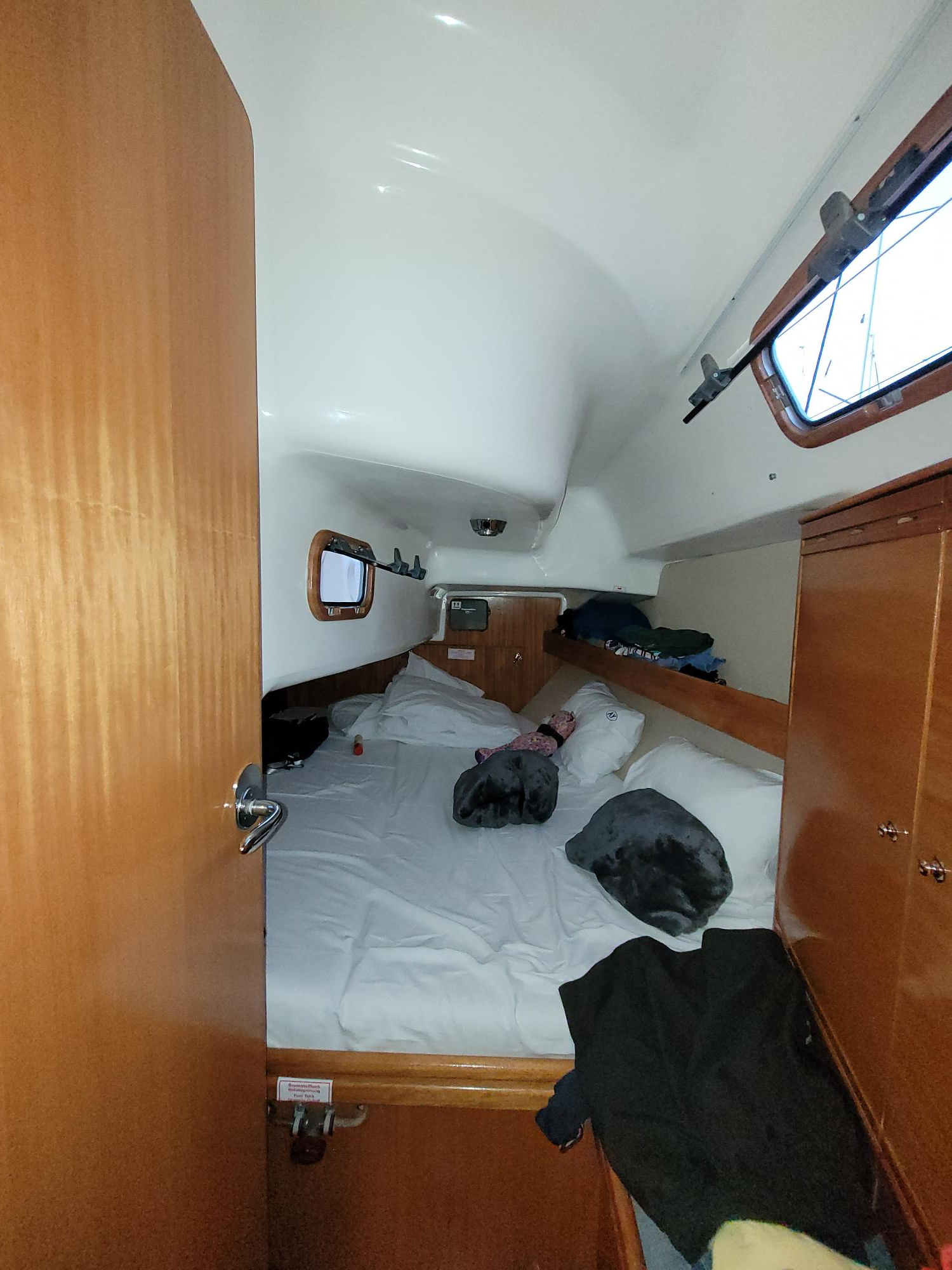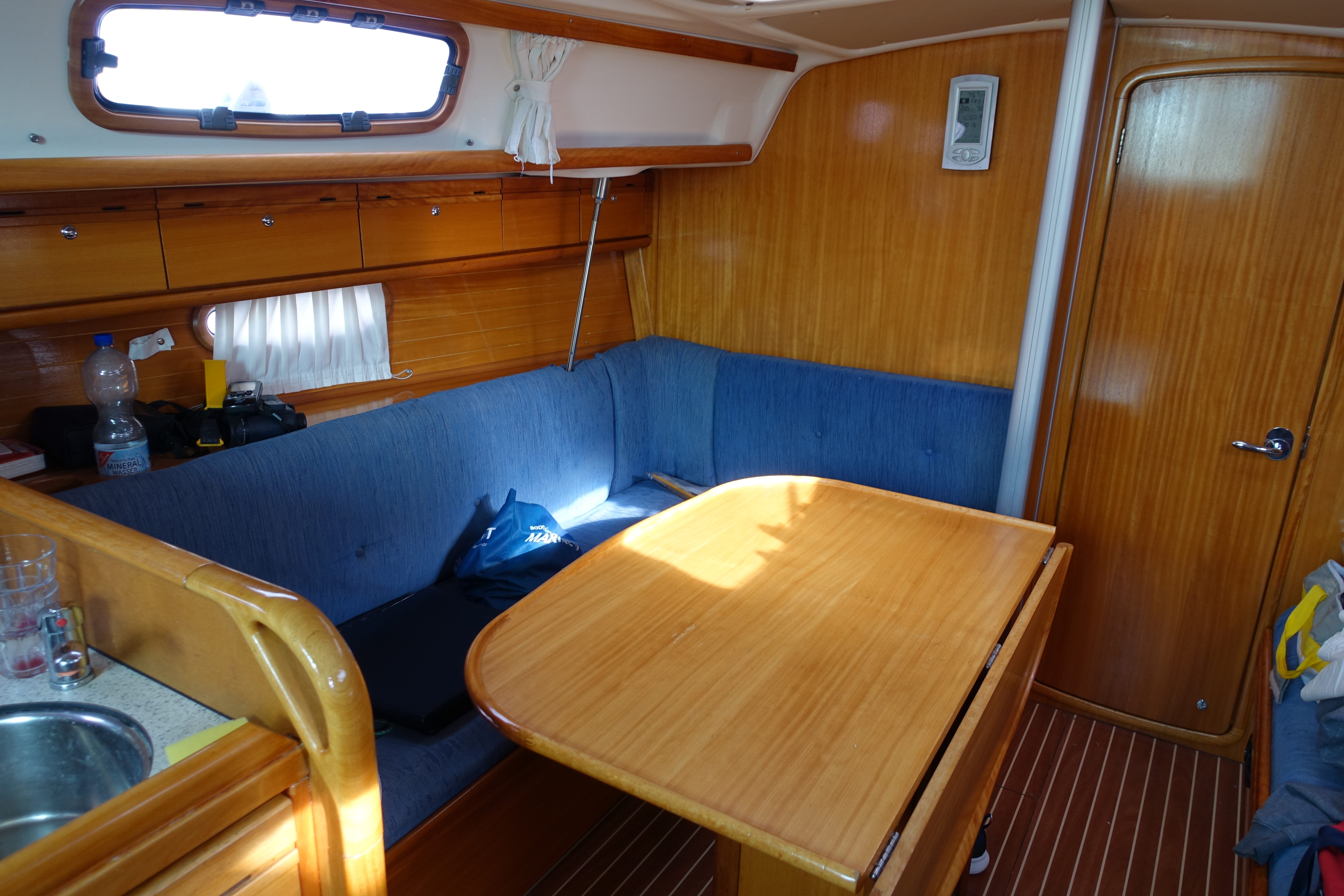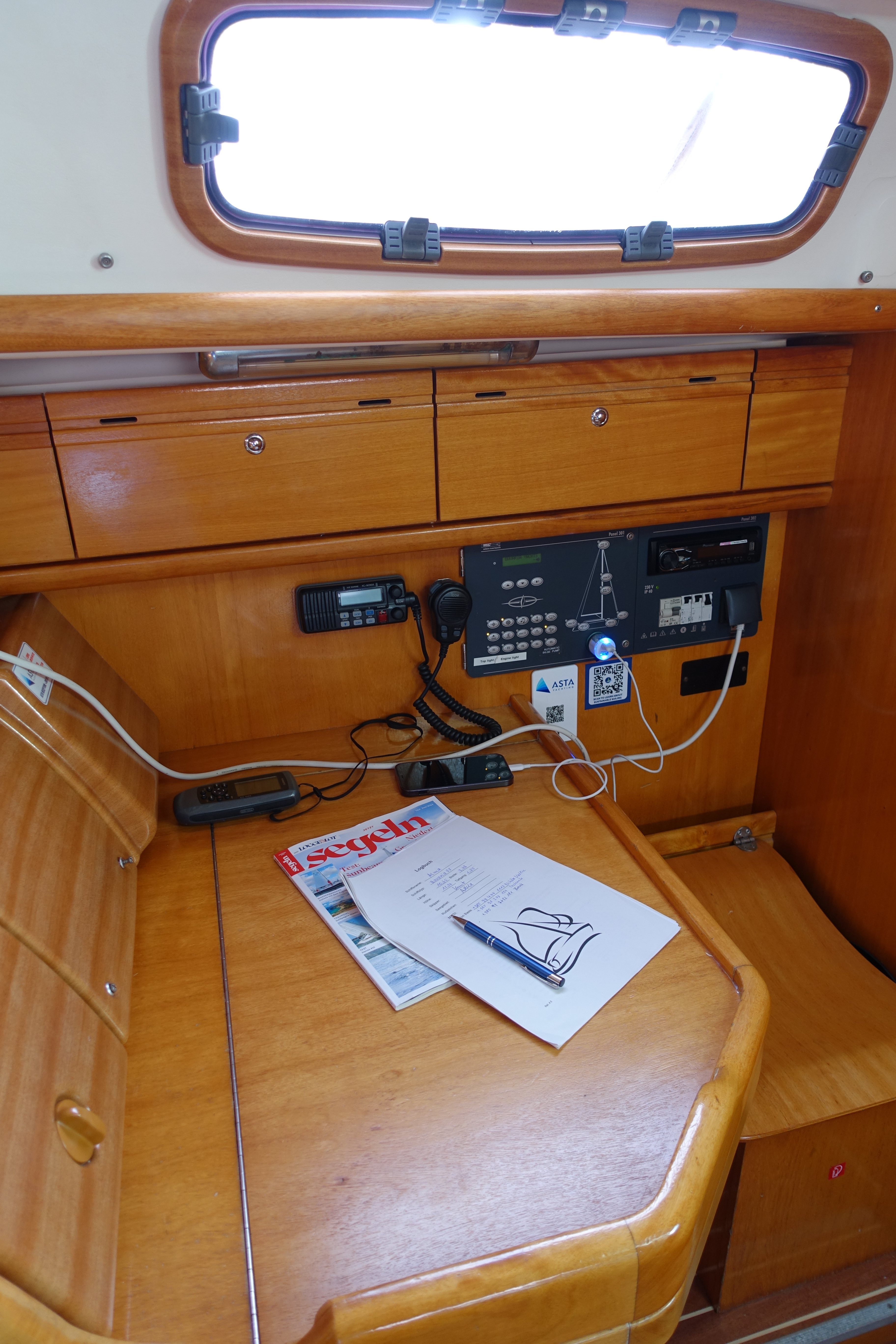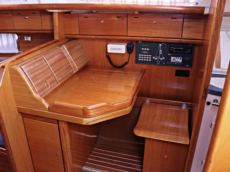 | Navigation | Barometer, Echolot, Fernglas, GPS mit Kartenplotter im Cockpit, Hafenhandbücher, Handpeilkompass, Kompass, Navigationsbesteck, Seekarten, Sumlog, Windmesser |