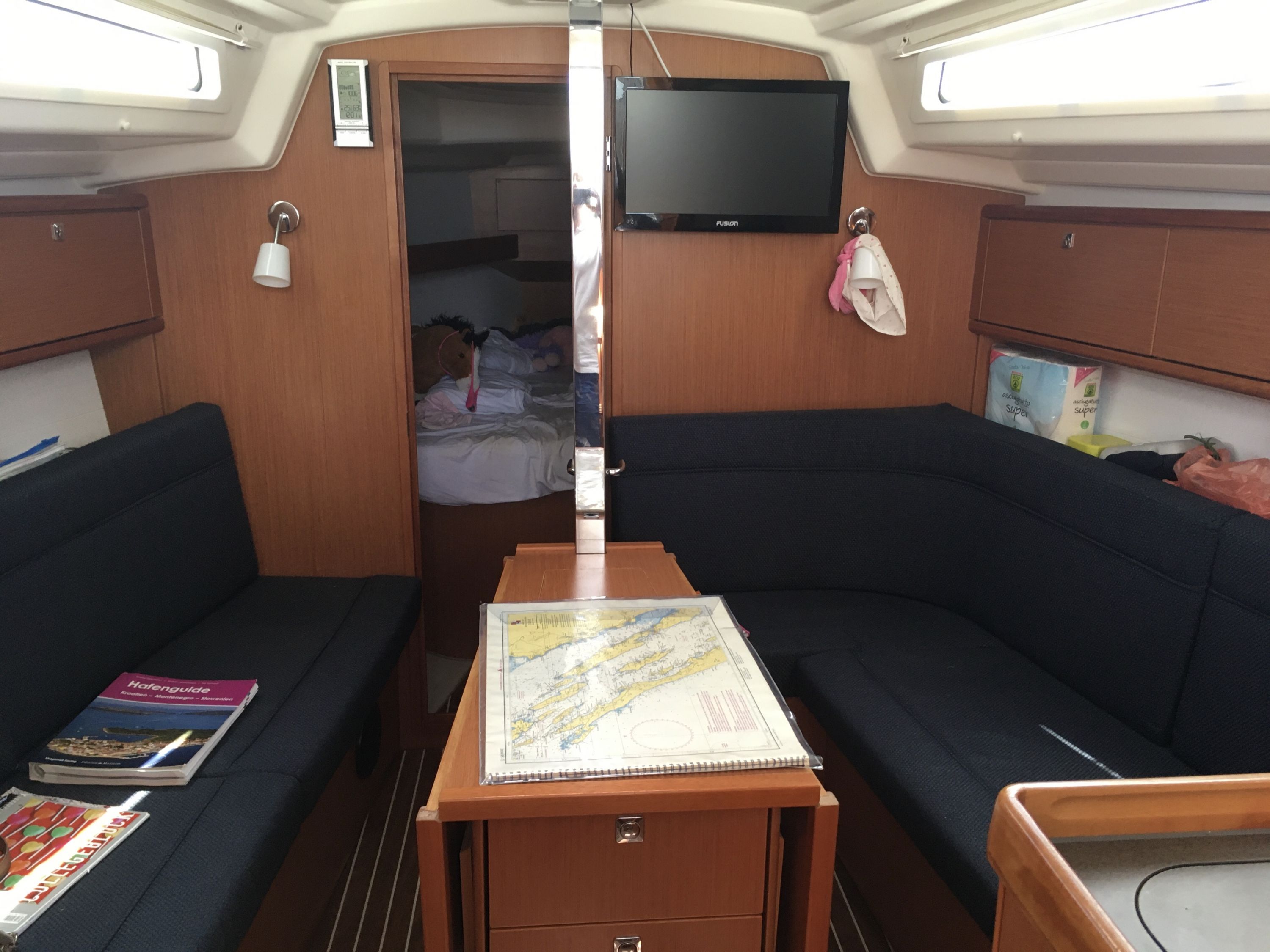 | Navigation | Barometer, Echolot, Fernglas, GPS mit Kartenplotter im Cockpit, Hafenhandbücher, Handpeilkompass, Kompass, Navigationsbesteck, Seekarten, Sumlog, Windmesser |
