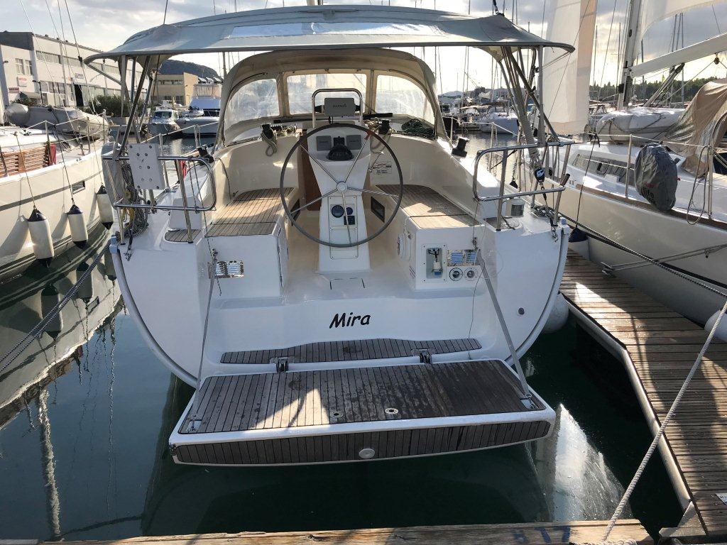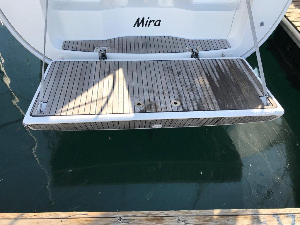 | Outside | 220 V-Landanschluss, Anker mit Kette, Badeplattform, Biminitop, Cockpitdusche, Cockpitlautsprecher, Cockpitpolster, Cockpittisch, elektr. Ankerwinsch, Fender, Gangway, Kugelfender, Sprayhood, Teak im Cockpit, Winschen |