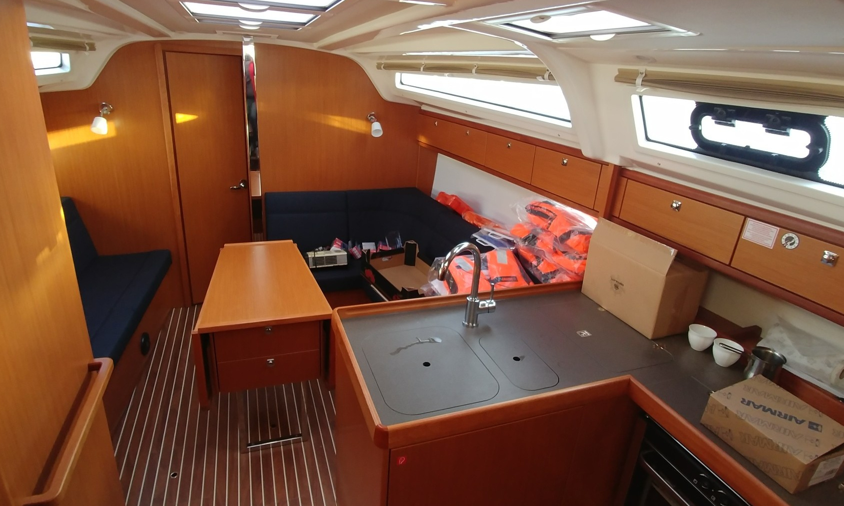 | Navigation | Barometer, Echolot, Fernglas, GPS mit Kartenplotter im Cockpit, Hafenhandbücher, Handpeilkompass, Seekarten, Sumlog, Windmesser |