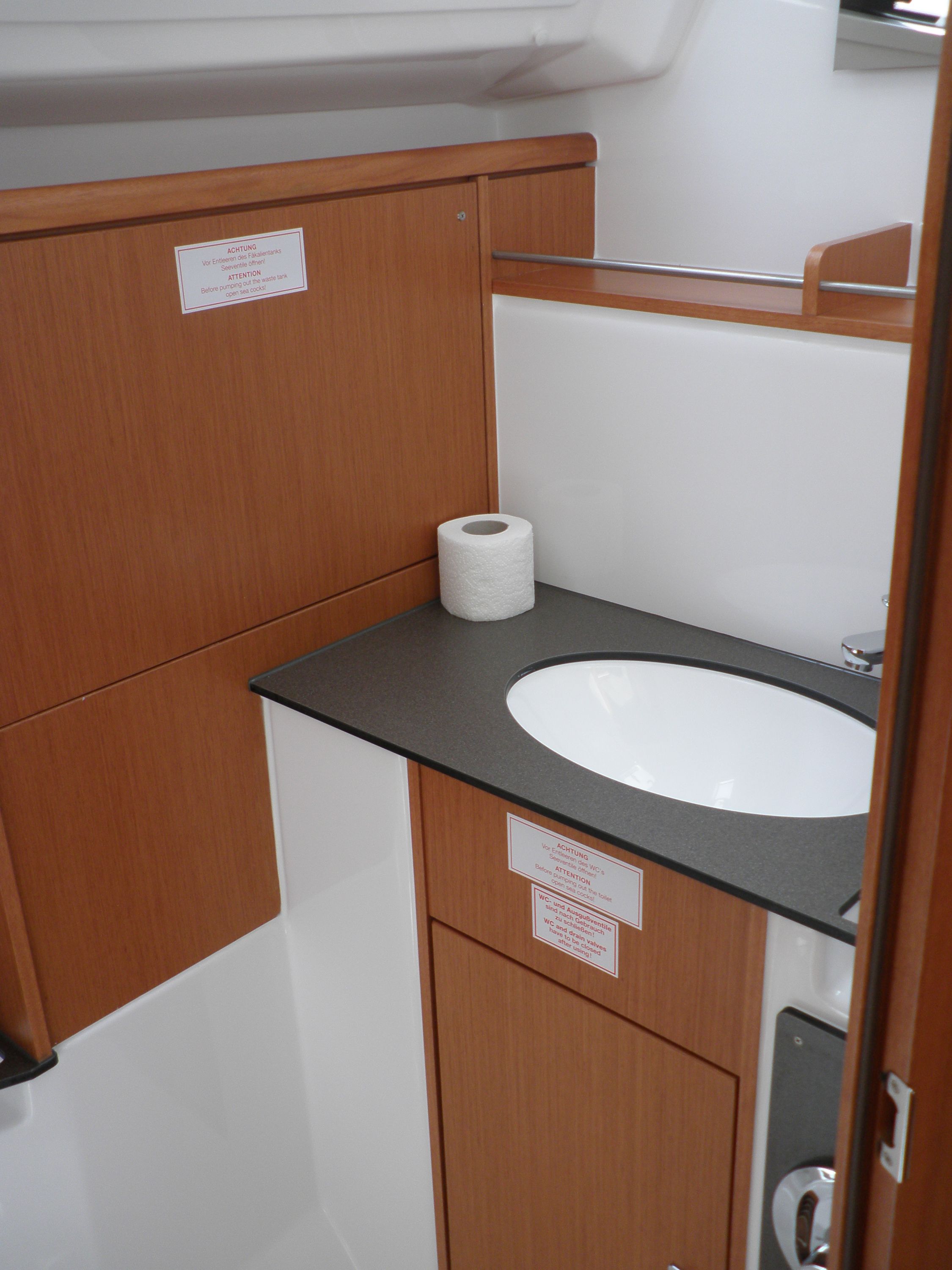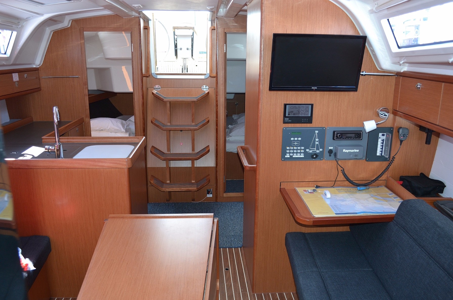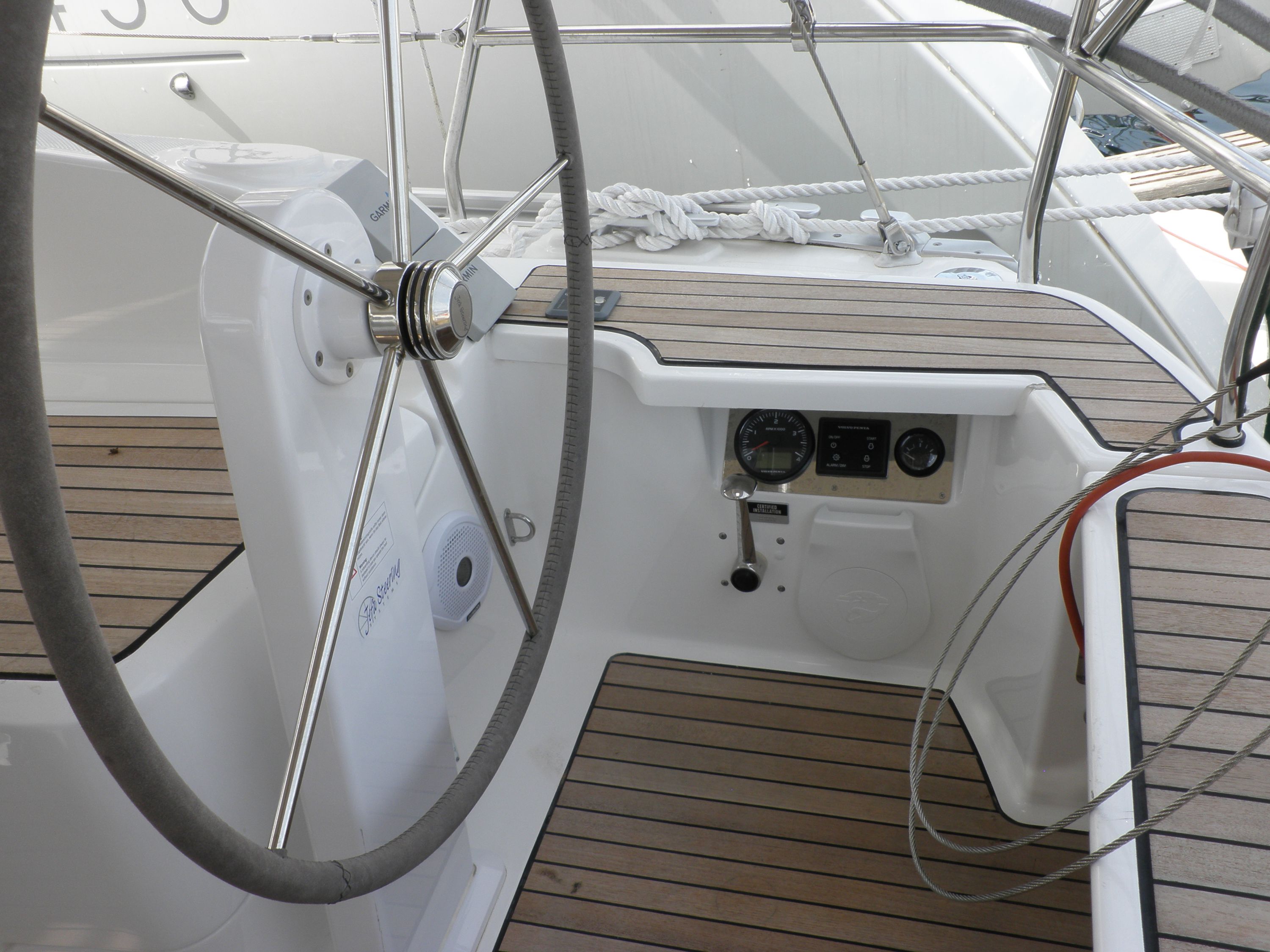 | Navigation | Barometer, Echolot, Fernglas, GPS mit Kartenplotter im Cockpit, Hafenhandbücher, Handpeilkompass, Seekarten, Sumlog, Windmesser |