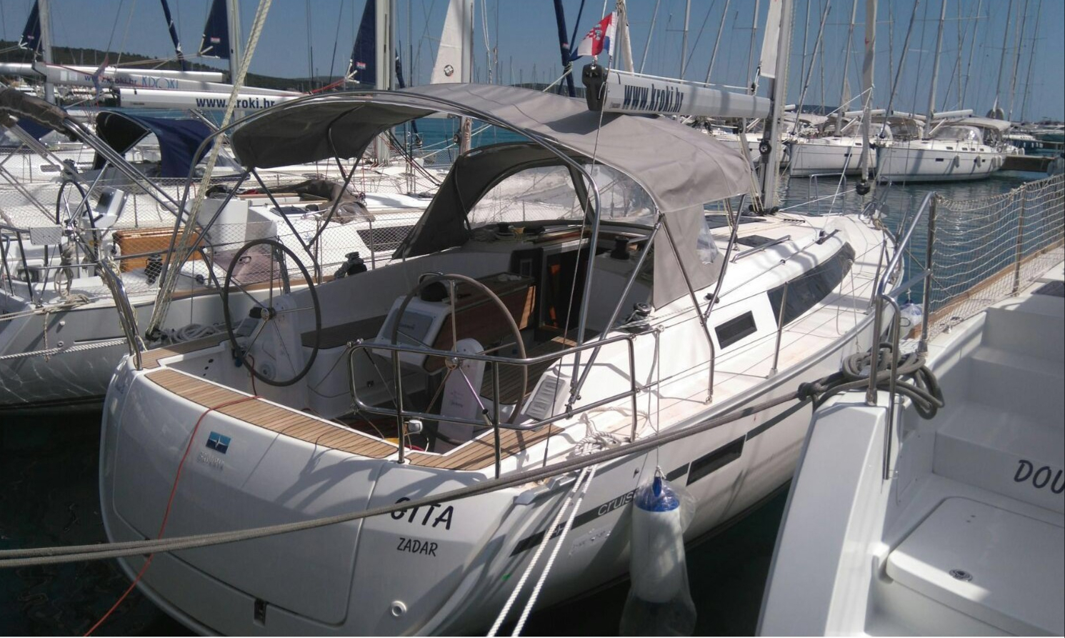 | Outside | Anker mit Kette, Biminitop, Bootshaken, Cockpittisch, Deckbürste, elektr. Ankerwinsch, Fender, Festmacherleinen, Solaranlage, Sprayhood, Teak im Cockpit, Unterwasserbeleuchtung, Wasserschlauch, Windex, Winschen |