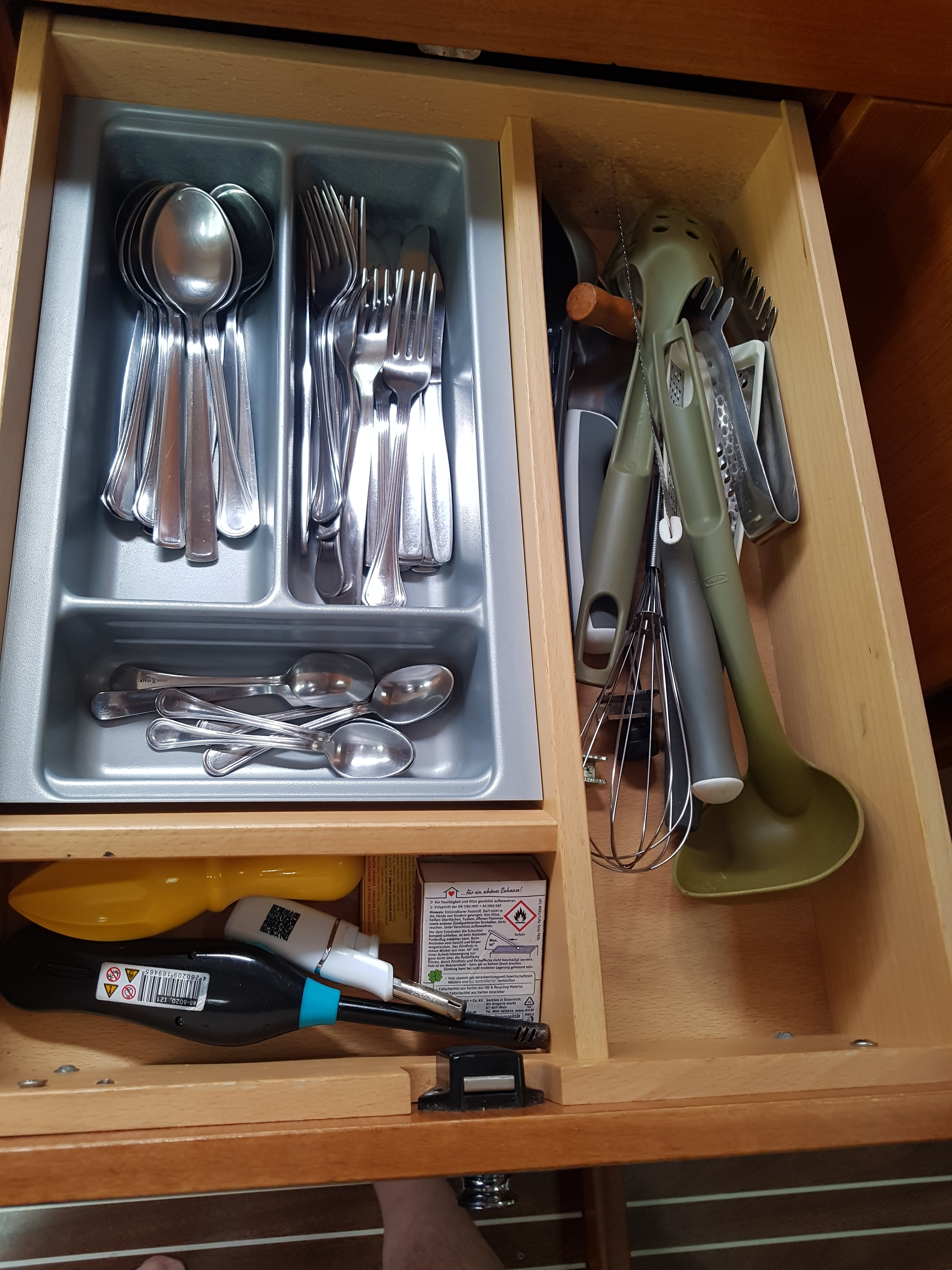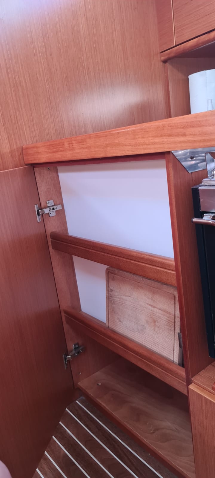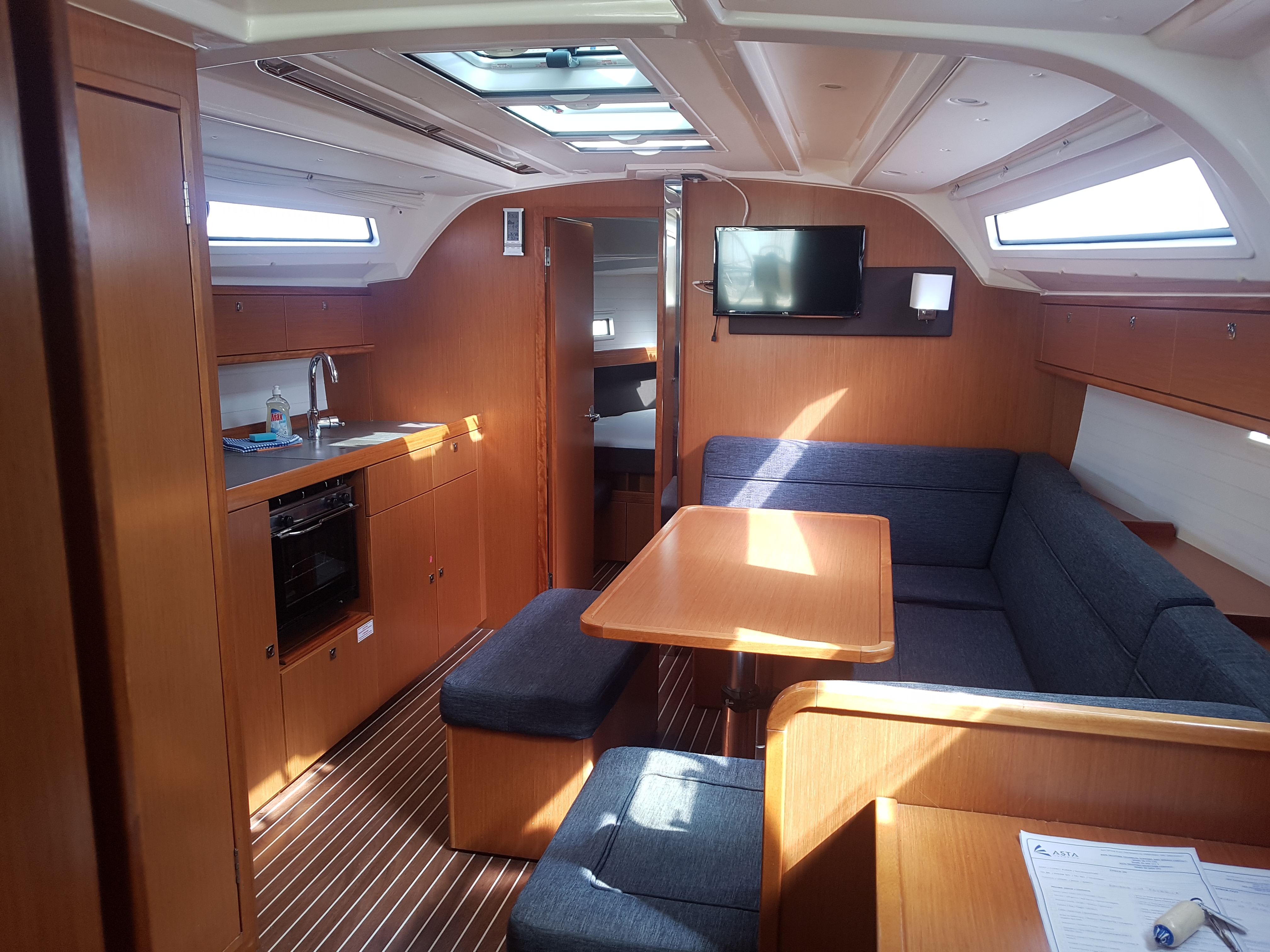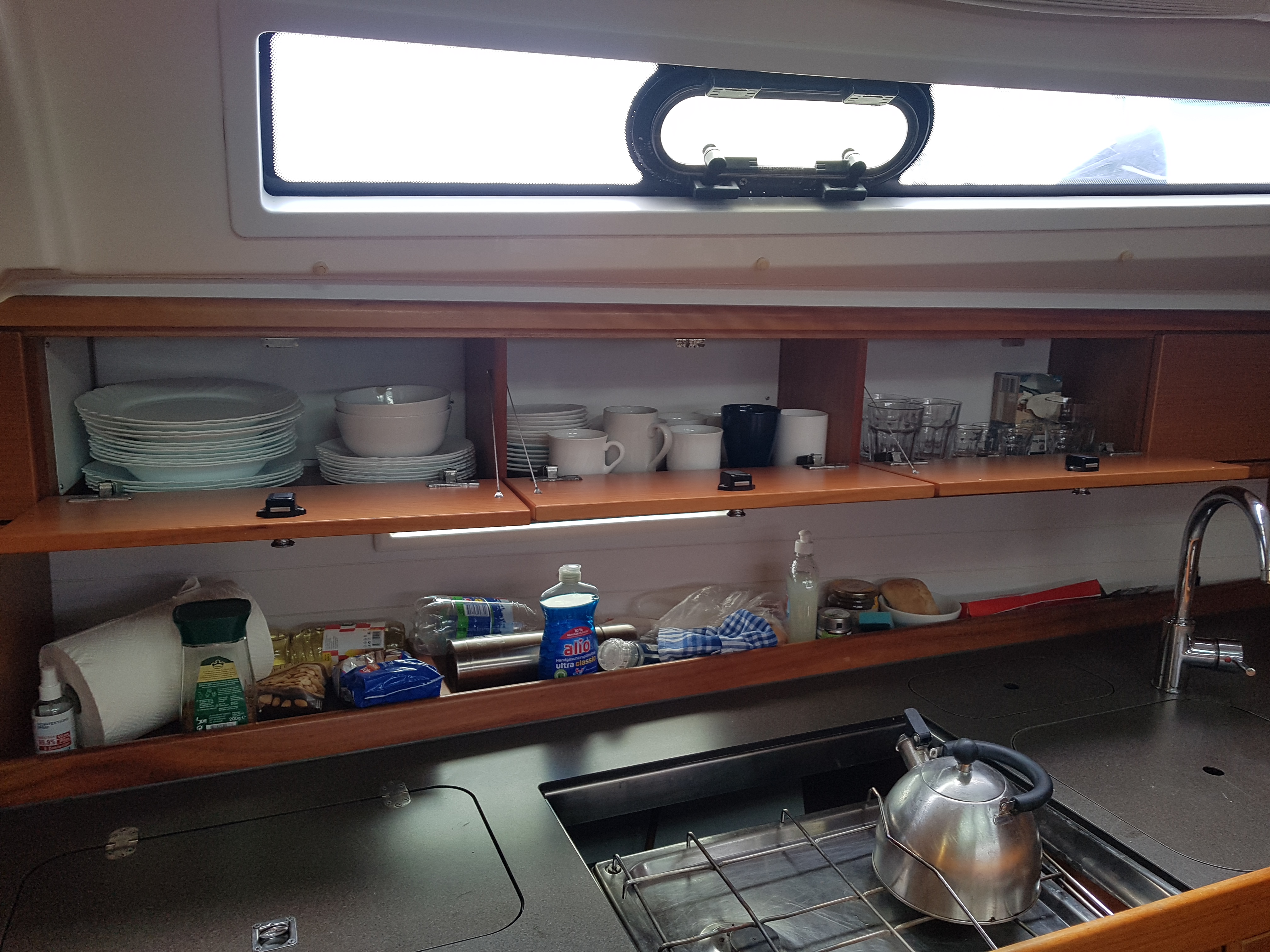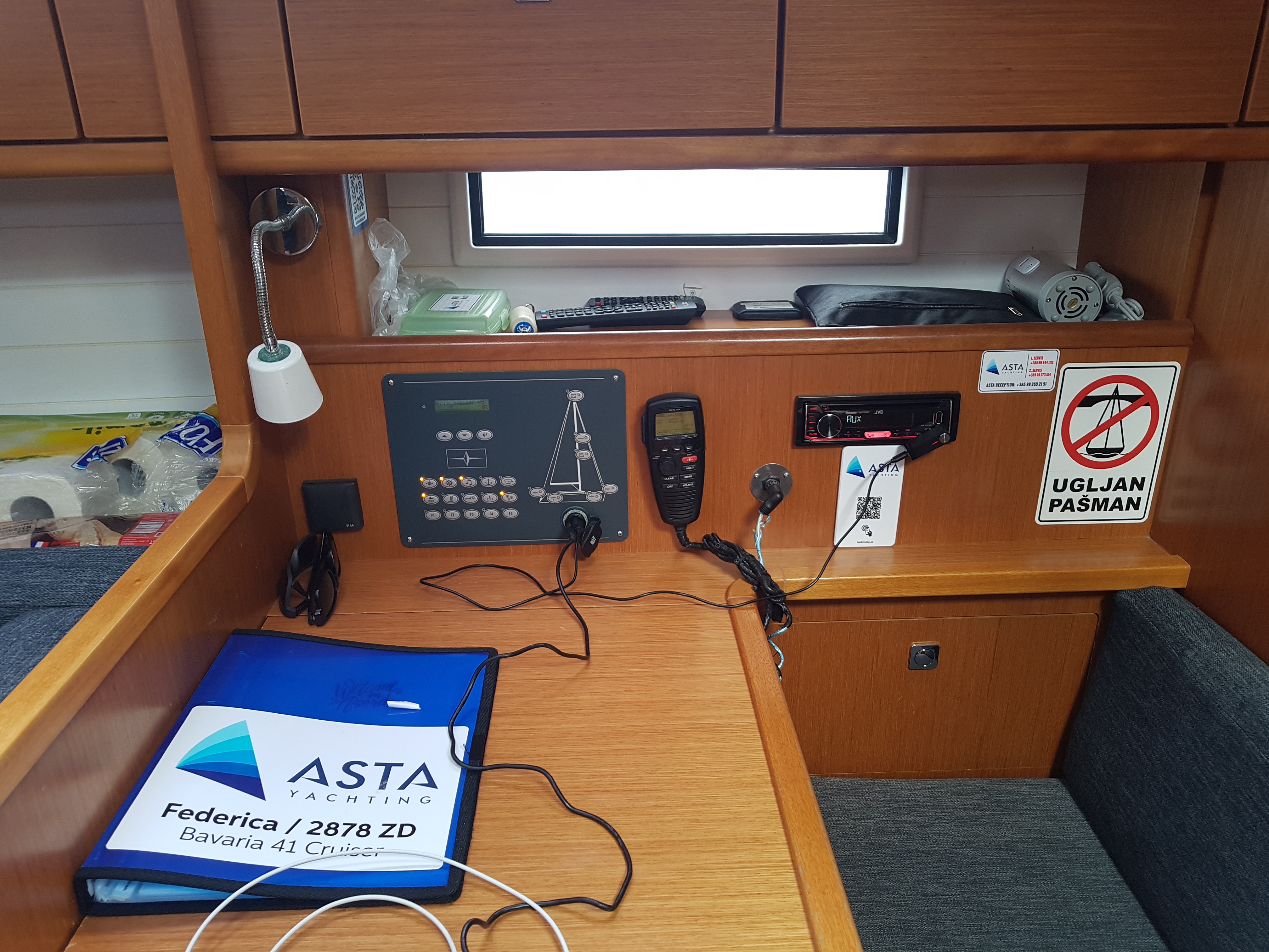 Inside 12V Steckdose, 220V Steckdosen, Gasherd, Kleiderbügel, Kühlschrank, Ladegerät, Landstromkabel, Luftpumpe für Beiboot, Pantryausstattung, Radio mit CD und MP3, Salontisch absenkbar, Spülbecken, Trichter, TV, Warmwasser