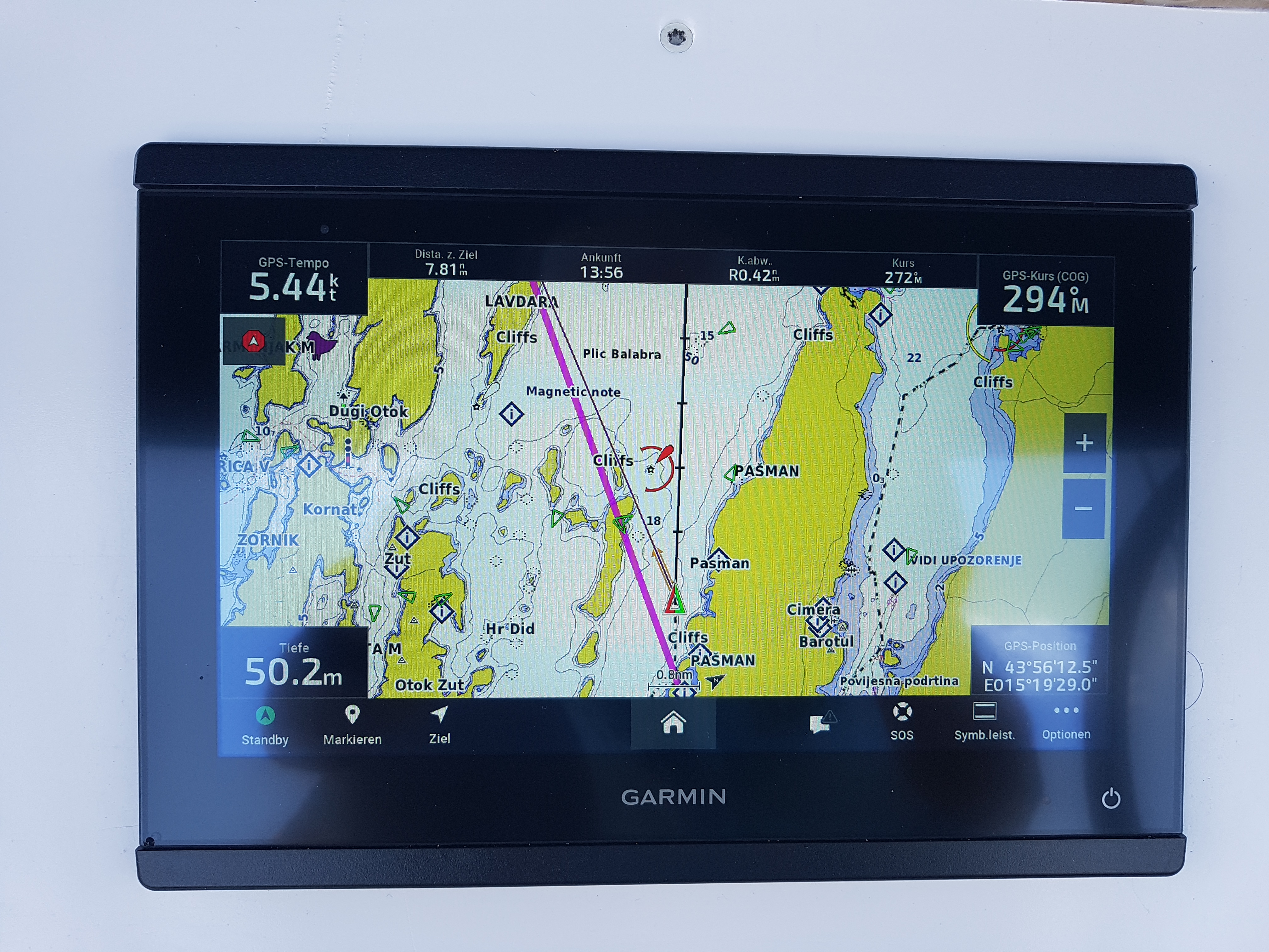 Navigation Barometer, Echolot, Fernglas, GPS mit Kartenplotter im Cockpit, Hafenhandbücher, Handpeilkompass, Kompass, Navigationsbesteck, Seekarten, Sumlog, Windmesser